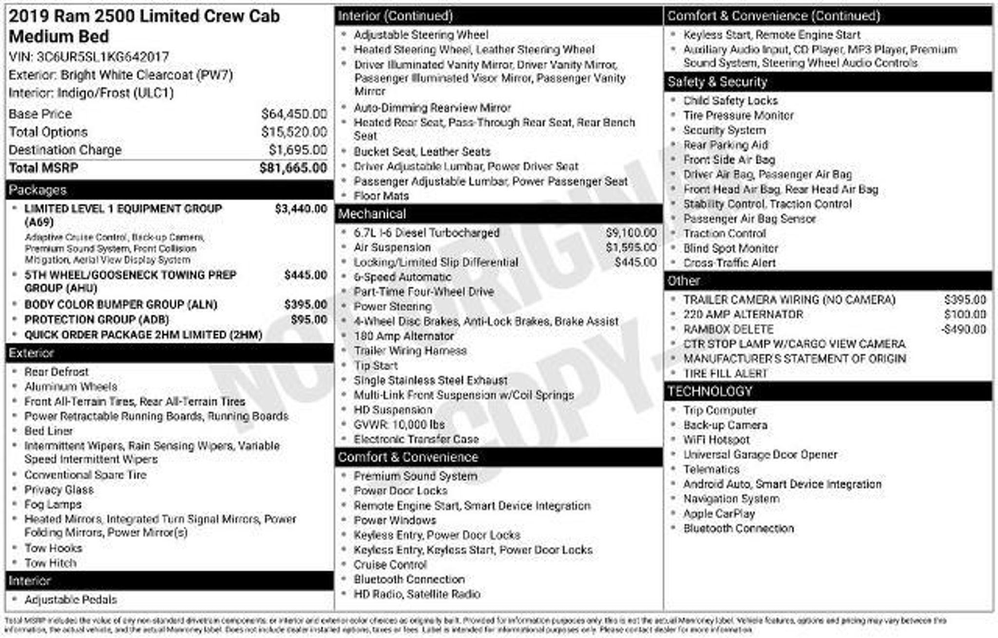 Discover the power and capability of this 2019 Ram 2500 Limited. This impressive heavy-duty pickup is ready to take on your toughest jobs with its Cummins 6.7L I6 Turbodiesel engine and 4-wheel drive capabilities. Boasting a wealth of premium features, this Ram 2500 is the perfect blend of strength and sophistication. - Exclusive Limited Level 1 Equipment Group with 17-speaker high-performance audio, surround-view camera system, adaptive cruise control with stop, and more - Protection Group with transfer case skid plate shield - 5th Wheel/Gooseneck Towing Prep Group for seamless trailer integration - Body Color Bumper Group with painted front and rear bumpers - 220-amp alternator for reliable power delivery The interior of this Ram 2500 Limited is equally impressive, with luxurious touches like the 12-inch touchscreen display, SiriusXM with 360L, and ventilated front seats. The advanced safety features, including full-speed forward collision warning plus and trailer reverse guidance, provide added peace of mind on the road. With its commanding presence and exceptional capability, this 2019 Ram 2500 Limited is the ultimate work-hard, play-hard companion. Whether you're towing a heavy trailer, navigating off-road terrain, or simply enjoying the open road, this truck is ready to take you there in comfort and style. Imagine the possibilities with this impressive Ram 2500 Limited. Experience the power, technology, and premium amenities that make this truck a true standout in the heavy-duty segment. Visit our showroom today to take this remarkable vehicle for a test drive and discover how it can elevate your driving experience.