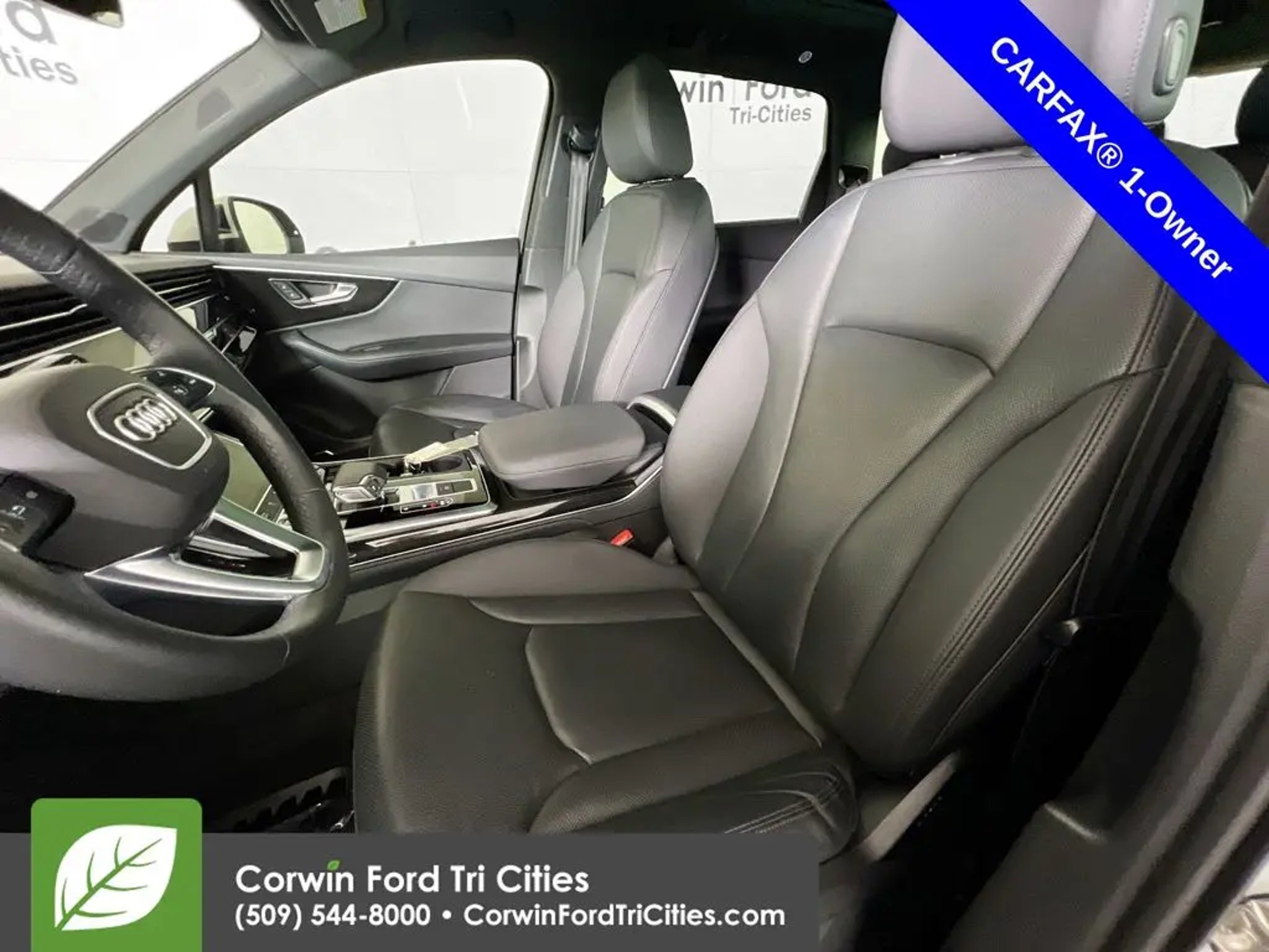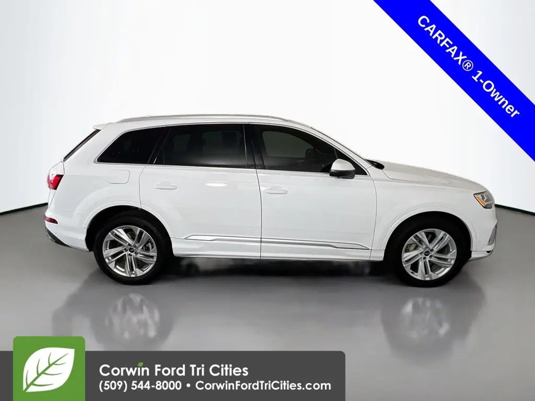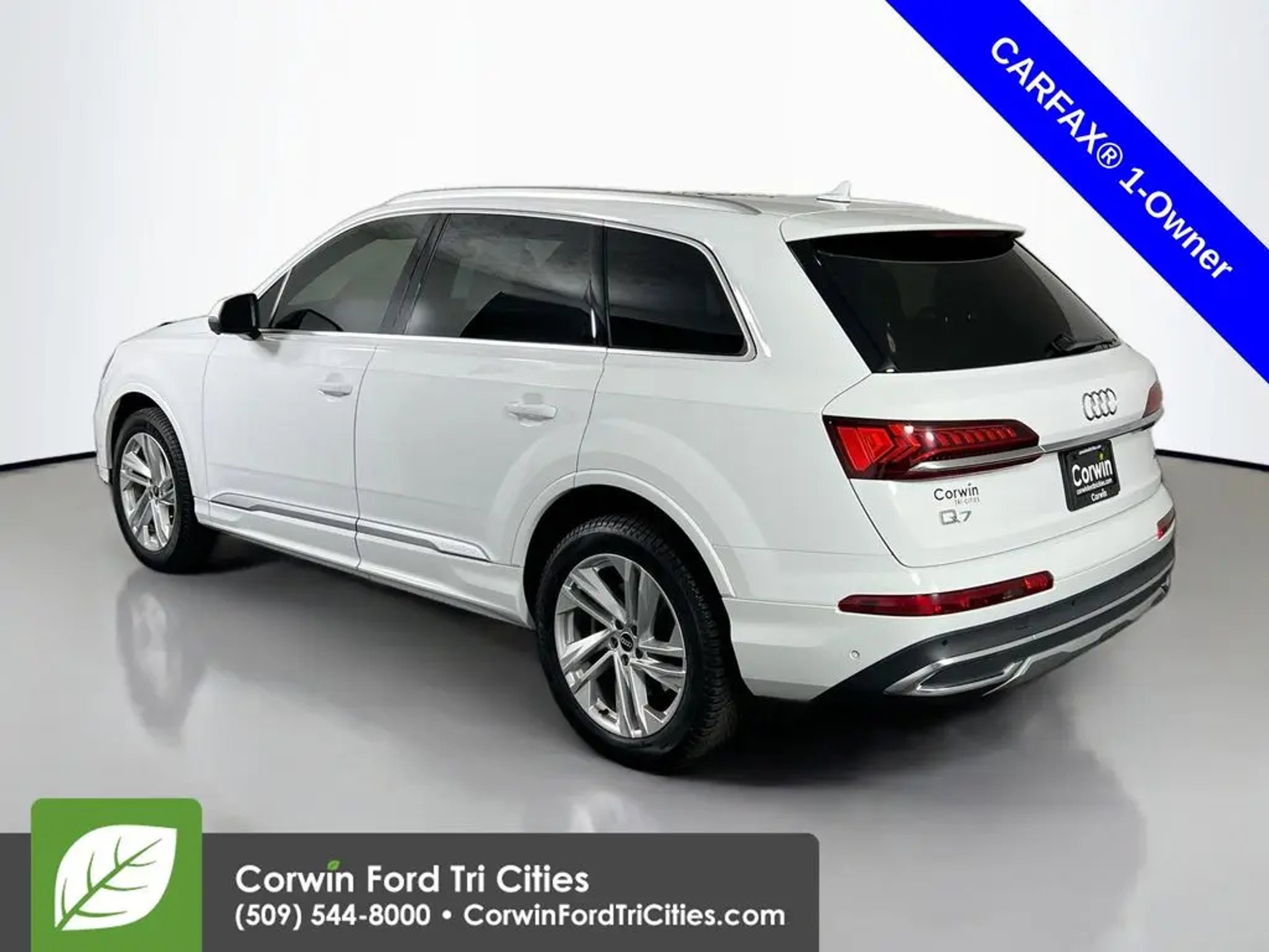 Backed by iconic performance, our One Owner 2021 Audi Q7 Premium Plus quattro is a bold family machine that's especially impressive in Carrara White! Powered by a TurboCharged 3.0 Liter V6 serving up 335hp connected to an 8 Speed Tiptronic Automatic transmission that puts capability at your command. You can also choose from multiple performance modes in this All Wheel Drive SUV that rewards you with composed handling and returns nearly 23mpg on the highway. Make a bold statement with the commanding, sleek stance of our Q7 that's enhanced by LED lighting, a panoramic sunroof, 19-inch alloy wheels, and the upscale convenience of a hands-free tailgate. Our Premium Plus cabin welcomes you and up to six people with comfort and luxury thanks to leather heated and cooled front seats, a heated three-spoke multifunction steering wheel, tri-zone automatic climate control, genuine wood inlays, and ambient lighting. Audi's virtual cockpit is onboard as well, with a 12.3-inch digital instrument panel to go with a 10.1-inch touchscreen, full-color navigation, Android Auto®, Apple CarPlay®, wireless charging, Bluetooth®, WiFi compatibility, and a 17-speaker Bang & Olufsen sound system. Audi helps keep your family out of harm's way with a rearview camera, automatic emergency braking, lane-departure warning, a blind-spot monitor, and more. Live life's adventures to their fullest in our Q7 Premium Plus. Save this Page and Call for Availability. We Know You Will Enjoy Your Corwin Ford Tri-City Test Drive Towards Ownership! See us today at Corwin Ford Tri-Cities. Family owned for over 100 years! Excellent selection of New and Used vehicles, Financing options. Serving Pasco, Kennewick, Richland, Walla Walla, Hermiston, Umatilla, Yakima, Spokane, Sunnyside, Grandview, Dayton, Prescott, Benton County, Franklin County, Yakima County, Spokane County, Adams County, Grant County, and the Greater Columbia Basin. *All Prices plus applicable sales tax and licensing. A negotiable documentary service fee up to $200 may be added to sales price or capitalized cost of the vehicle. One vehicle unless otherwise noted and subject to prior sale without notice. While supplies last. EPA mileage estimates are for newly manufactured vehicles only. Your actual mileage will vary depending on how you drive and maintain your vehicle.
