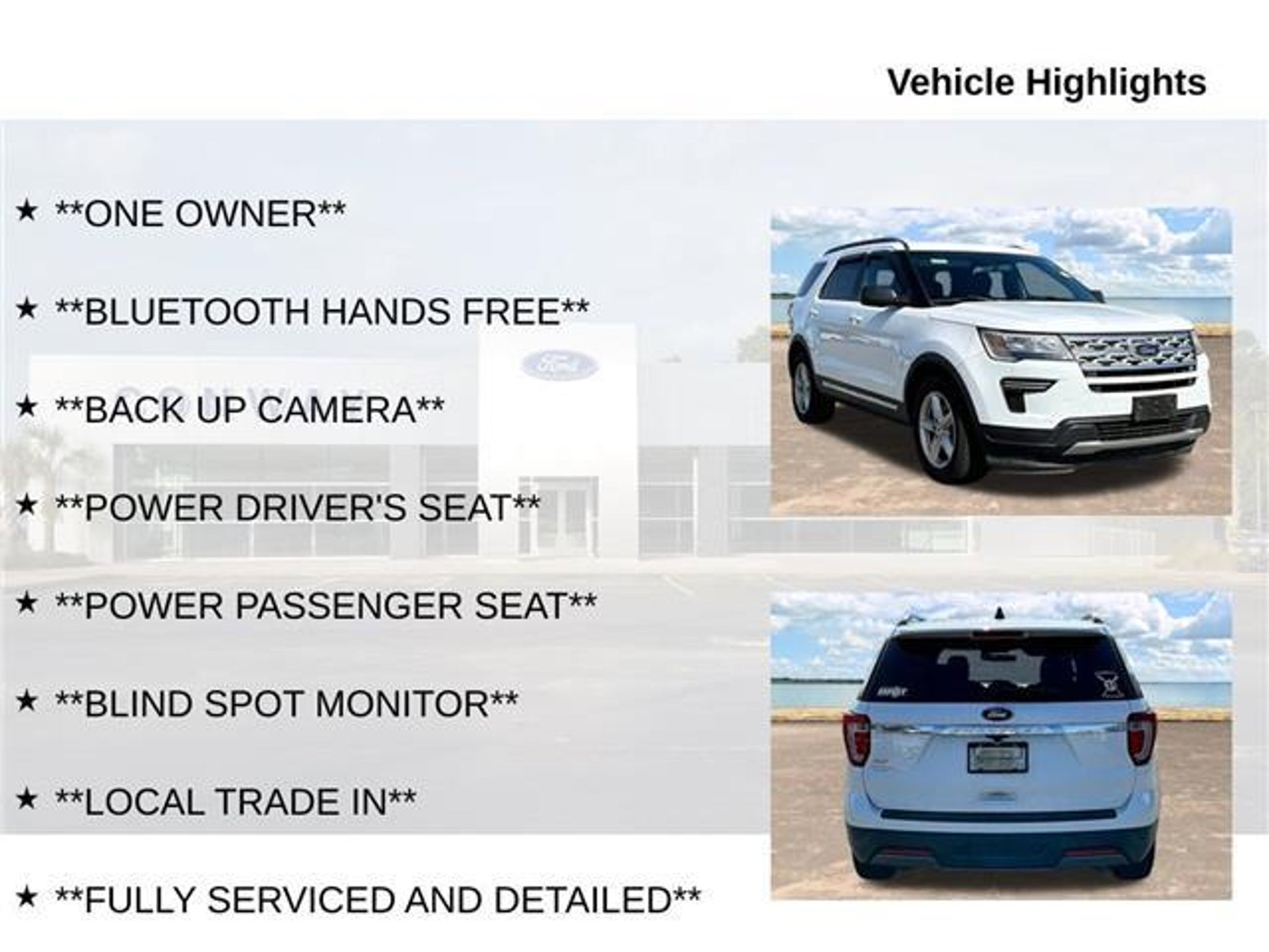 Discover the perfect blend of power, style, and modern convenience in this 2019 Ford Explorer XLT. This versatile SUV is ready to elevate your driving experience with its impressive performance, cutting-edge technology, and refined interior. - **BACK UP CAMERA** - **BLIND SPOT MONITOR** - **BLUETOOTH HANDS FREE** - **FULLY SERVICED AND DETAILED** - **LOCAL TRADE IN** - **ONE OWNER** - **POWER DRIVER'S SEAT** - **POWER PASSENGER SEAT** - Apple Carplay-Android Auto - Back Up Sensors - Keyless Key Pad - Equipment Group 200A Boasting a 3.5L 6-Cylinder engine and a smooth 6-Speed Automatic transmission with Select-Shift, this Explorer XLT delivers impressive power and efficiency, with an EPA-estimated 17 city/24 highway MPG. The sleek white exterior complements the well-appointed interior, featuring premium cloth seating, a leather-wrapped steering wheel, and an array of advanced features. Connectivity and convenience are at your fingertips with the SYNC Communication & Entertainment System, which seamlessly integrates your smartphone via Apple CarPlay and Android Auto. Stay informed and entertained on every journey, while the back-up camera and rear parking sensors provide added peace of mind when maneuvering. Safety is paramount in the Explorer XLT, with a comprehensive suite of advanced driver-assistance technologies, including a Blind Spot Monitor and Brake Assist. The four-wheel independent suspension and Electronic Stability Control ensure a confident, responsive ride, no matter the road conditions. Whether you're embarking on a family adventure or tackling your daily commute, this 2019 Ford Explorer XLT is a versatile and capable companion. Experience the perfect balance of performance, technology, and style "“ visit our showroom today and let us demonstrate why this SUV is the perfect fit for you.