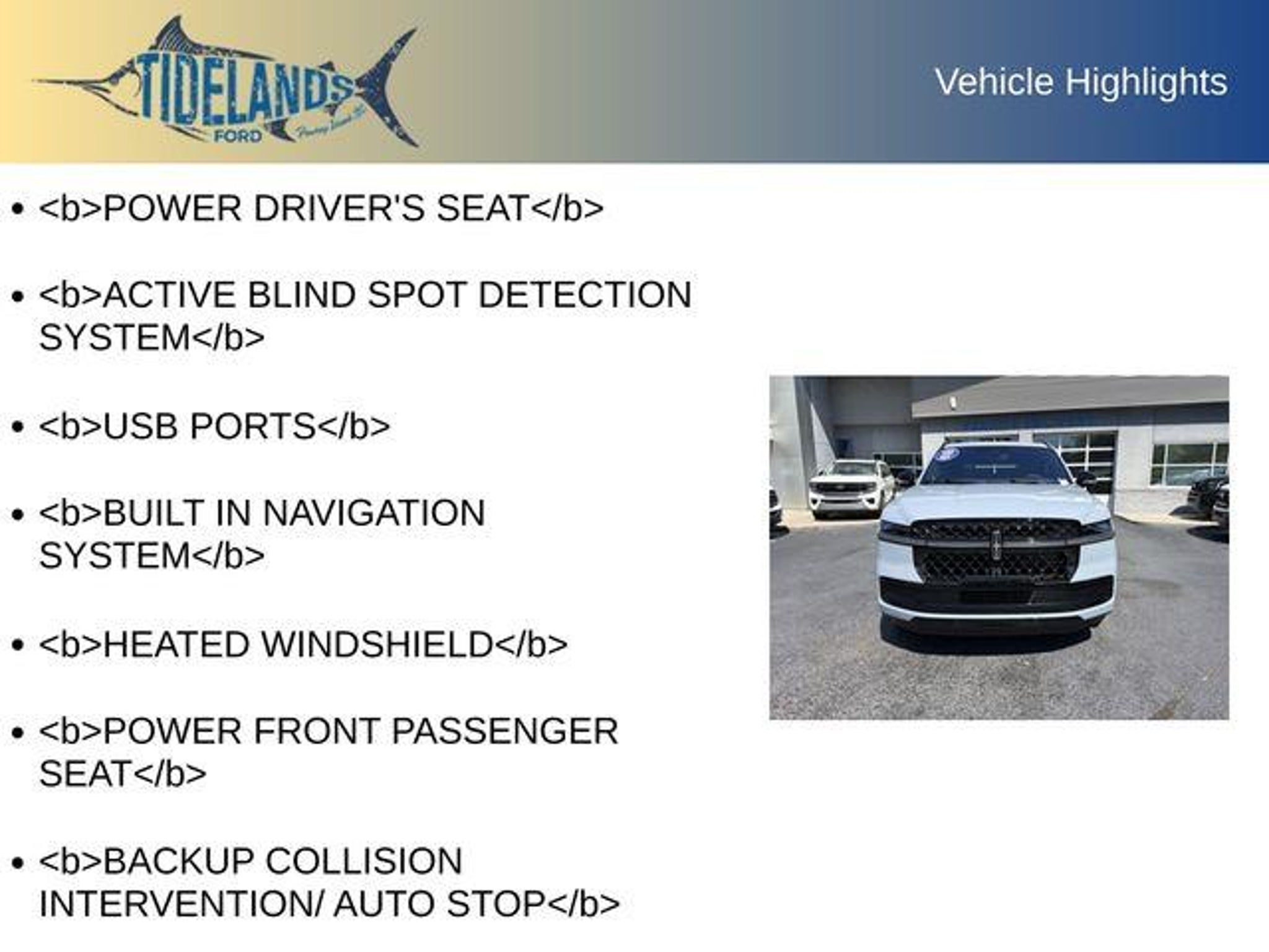 2025 Lincoln Navigator Reserve *** Price Includes $500 Dealer Rebate for trade-in and $500 dealer rebate for financing *** Jet Appearance Package Revel Ultima 28 Speaker Sound System Remote Start Heated and Cooled Front Seats Rear Heated Seats Tri Zone Climate Control 22 High Gloss Black Wheels *POWER DRIVER'S SEAT*, *ACTIVE BLIND SPOT DETECTION SYSTEM*, *USB PORTS*, *BUILT IN NAVIGATION SYSTEM*, *HEATED WINDSHIELD*, *POWER FRONT PASSENGER SEAT*, *BACKUP COLLISION INTERVENTION/ AUTO STOP*, *LEATHER SEATS*, *VOICE ACTIVATED CONTROLS*, *BLUETOOTH STREAMING*, *PUSH-BUTTON IGNITION*, *FORWARD-COLLISION WARNING (FCW)*, *AUTOMATIC EMERGENCY BRAKING (AEB)*, *REAR CROSS TRAFFIC ALERT*, *BLIND-SPOT MONITORING*, *360-DEGREE SURROUND-VIEW CAMERA SYSTEM*, *APPLE CarPlay*, *ANDROID AUTO*, 3rd Row Seats, 4WD, All Services Up To Date, Captain Chairs, Panoramic Moonroof, Navigation System, Parking Sensors, Push Button Start, Remote Start, USB, Keyless Access, Voice Recognition, Backup Camera/ Rearview Camera, Head-Up Display, Rain Sensing Windshield Wipers, Memory Seat, Power Seats, Premium Audio, 4WD, Black Onyx Leather, 26mm Engine Radiator, 28 Speakers, 3rd row seats: split-bench, 4-Wheel Disc Brakes, ABS brakes, Adaptive suspension, Adjustable pedals, Air Conditioning, All-Weather Flr Liners w/o Fr & Rr Carpet Flr Mats, Alloy wheels, AM/FM radio: SiriusXM with 360L, Apple CarPlay/Android Auto, Audio memory, Auto High-beam Headlights, Auto Htd & Ventilated Premium Lthr Captain's Chair, Auto Start-Stop Technology, Auto tilt-away steering wheel, Auto-dimming door mirrors, Auto-dimming Rear-View mirror, Auto-leveling suspension, Automatic temperature control, Black Accent Badge, Black Accent Interior Pack, Black Beltline Molding, Black Painted Roof Rails, Brake assist, Bumpers: body-color, Compass, Delay-off headlights, Driver door bin, Driver vanity mirror, Driver's Seat Mounted Armrest, Dual front impact airbags, Dual front side impact airbags, Electronic Stability Control, Emergency communication system: 911 Assist, Equipment Group 202A Reserve II, Exterior Parking Camera Rear, Four wheel independent suspension, Front anti-roll bar, Front Bucket Seats, Front Bumper Fascia, Front dual zone A/C, Front License Plate Bracket, Front reading lights, Fully automatic headlights, Garage door transmitter, Heated door mirrors, Heated front seats, Heated rear seats, Heated steering wheel, Heavy-Duty Trailer Tow Package, HVAC memory, Illuminated entry, Jet Appearance Package, Leather steering wheel, Lincoln Connect, Lincoln L