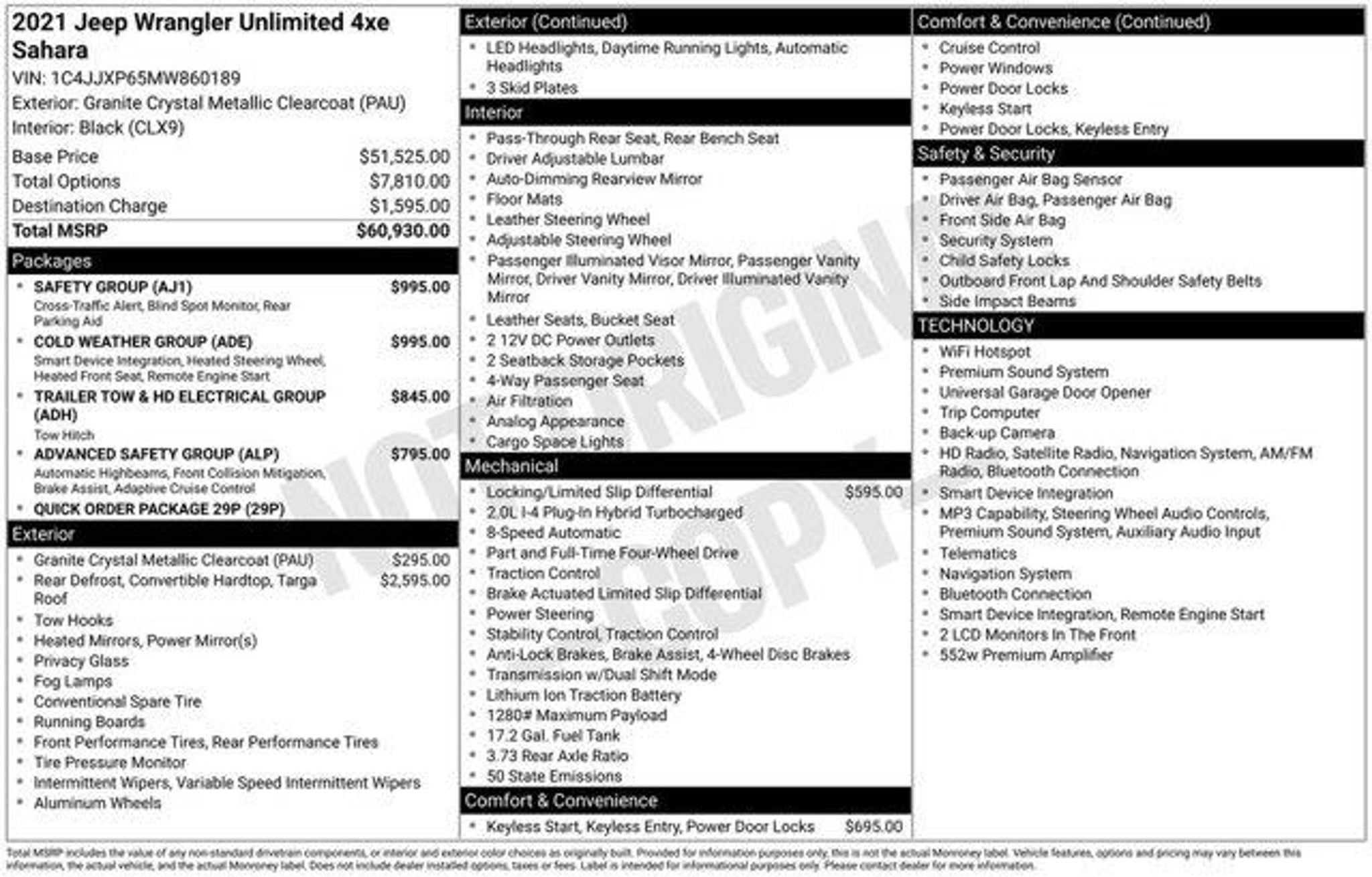 Discover the Thrill of Sustainable Adventure in this 2021 Jeep Wrangler Unlimited Sahara 4xe. This exceptional off-road icon blends legendary Jeep capability with cutting-edge hybrid technology, delivering an unparalleled driving experience.- Local Trade One Owner- Cold Weather Group (Heated Steering Wheel, Remote Start, Heated Front Seats)- Trailer Tow & HD Electrical Group (Class II Receiver Hitch, 700 Amp Battery, 7 & 4 Pin Wiring)- Safety Group (Blind Spot & Cross Path Detection, Rear Park Assist)- Advanced Safety Group (Adaptive Cruise Control, Forward Collision Warning, Auto High Beams)- Anti-Spin Differential Rear Axle- Remote Proximity Keyless Entry- Body Color 3-Piece Hard TopPowered by a 2.0L I4 DOHC engine and 8-speed automatic transmission, this Wrangler 4xe offers the perfect balance of performance and efficiency. With 4-wheel drive and a host of advanced features, you'll conquer any terrain with confidence and comfort.Indulge in the convenience of dual-zone climate control, remote start, and a heated steering wheel. Stay connected with the Uconnect 4C Nav system, Apple CarPlay, and Android Auto. Enhance your driving experience with adaptive cruise control, blind spot monitoring, and advanced brake assist.Elevate your off-road adventures with the Wrangler's legendary capabilities, now complemented by the efficiency and responsiveness of hybrid technology. Experience the perfect fusion of rugged capability and sustainable power in this exceptional 2021 Jeep Wrangler Unlimited Sahara 4xe.Discover the thrill of owning this remarkable vehicle. Schedule a test drive today and let us show you how this Wrangler 4xe can transform your driving experience.
