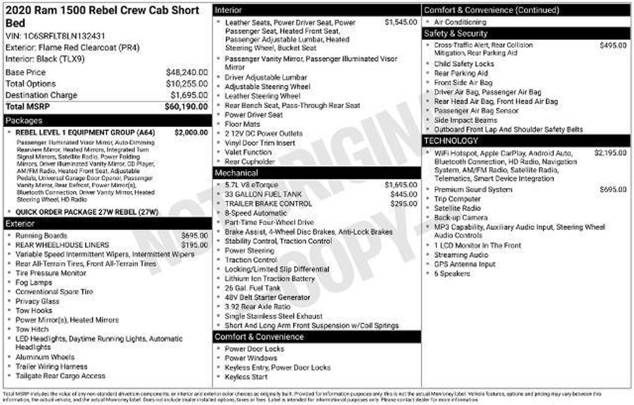 Details > 2020 RAM 1500 4X4 Rebel 4DR Crew Cab 5.6 FT. SB Pickup For Sale in Dyersville, IA Private Party Sellers Click here to place your ad now! You auta tell them you saw the ad in AutaBuy when you call or email. 1/30 2/30 3/30 4/30 5/30 6/30 7/30 8/30 9/30 10/30 11/30 12/30 13/30 14/30 15/30 16/30 17/30 18/30 19/30 20/30 21/30 22/30 23/30 24/30 25/30 26/30 27/30 28/30 29/30 30/30 View 30 Photos View All Add to My Garage Parked in Your Garage! Victory Ford, Inc. Contact Seller: I would like to: Make Offer Check Availability Ask A Question Request More Photos Check Financing Options Send a copy of this message to me Add this listing to my garage Send to Mobile Mileage 101,949 Exterior Color Flame Red Clearcoat Interior Color Black Doors 4 Engine 5.7L V8 Transmission 8 Speed Auto Stock # D5656 VIN 1C6SRFLT8LN132431 Estimated Monthly Payment $574 mo Apply Now J.J. Best Banc & Co. 2020 RAM 1500 4X4 Rebel 4DR Crew Cab 5.6 FT. SB Pickup Description: **LOCAL TRADE** **CLEAN AUTOCHECK HISTORY REPORT** **REBEL 27W ORDER PKG** **5.7L HEMI V8** **NAVIGATION** **HEATED SEATS & STEERING WHEEL** **TRAILER BRAKE CONTROLLER** **TONNEAU COVER** **SPRAY-IN BEDLINER** **18 X 8 BLACK PAINTED ALLOY WHEELS** · Mileage: 101,949 · Color: Flame Red Clearcoat Price: $32,995. Mileage 101,949 Exterior Color Flame Red Clearcoat Interior Color Black Doors 4 Engine 5.7L V8 Transmission 8 Speed Auto Stock # D5656 VIN 1C6SRFLT8LN132431 Estimated Monthly Payment $574 mo Apply Now J.J. Best Banc & Co. Add to My Garage Parked in Your Garage! Message Seller Victory Ford, Inc. Contact Seller: I would like to: Make Offer Check Availability Ask A Question Request More Photos Check Financing Options Send a copy of this message to me Add this listing to my garage Offered for sale by Victory Ford, Inc. DYERSVILLE, IA Price: $32,995. Offered for sale by Victory Ford, Inc. DYERSVILLE, IA [entire inventory] Ask Auta Intelligence The first collector-car AI built directly into a classic car marketplace What engine options did these come with? How many of these were produced? Tell me about this model What trim levels were available for this model? Can you show me more pickups/trucks for a similar price? What colors did these come in? How far is this from me? What size tires does this run from the factory? Where is this located? What factory options were available on this model? What transmission options did these offer? What does this VIN number tell me? What's the typical towing capacity in this configuration? How many 1500s were produced in Red? When was this model first introduced? How easy are parts to find for this model? What kind of mileage do these get? Do you have a similar car to sell? List It Now! Questions about this car? Ask Auta Intelligence for production numbers, available options, etc. · Subscribe to AutaBuy! · Send a Gift Subscription Notice to a Friend