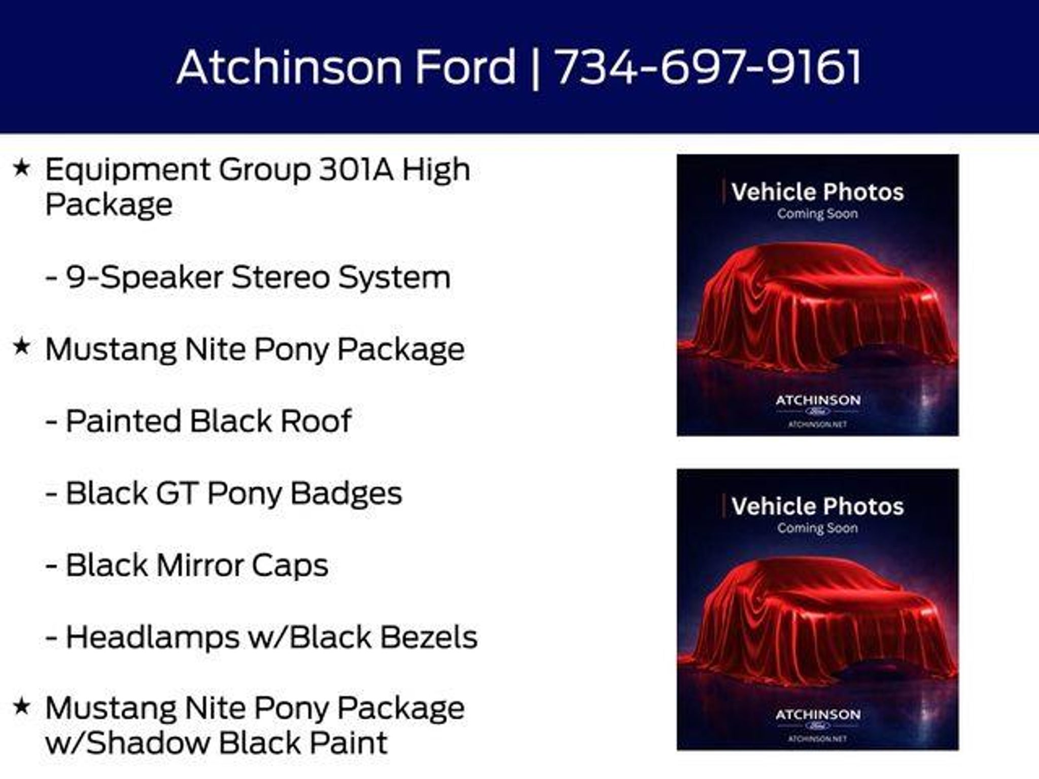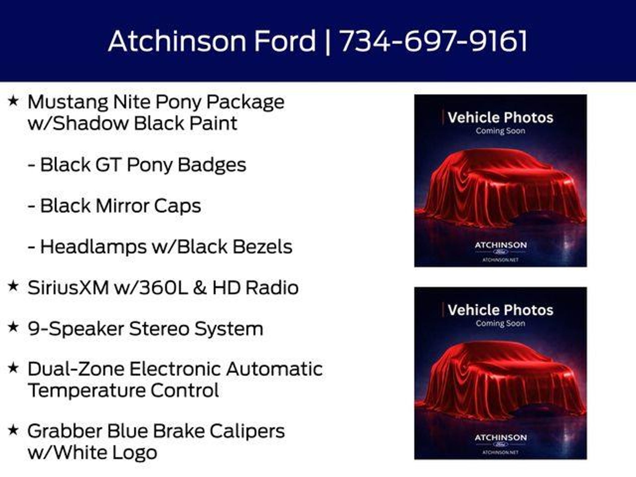 Recent Arrival! FORD GOLD CERTIFIED - 6 SPEED MANUAL TRANSMISSION - 19 BREMBO BRAKES - ACTIVE VALUE EXHAUST - NITE PONY PACKAGE - MORE! **Factory Gold Certified Pre-owned Vehicle 7yr or 100,000 miles! **, **Inspected by a Certified Ford Technician!**, **Certified by CARFAX - ONE OWNER & NO ACCIDENTS!**, **Rear View Back-Up Camera!**, **Back Up Warning Sensors!**, **Push Button Start!**, ** Microsoft Sync **, ** Myford Touch Screen Technology **, ** FREE DEALER WARRANTY **, ** V8 Power **, 19 Brembo Brake System w/Performance Linings, 9-Speaker Stereo System, Ambient Lighting w/MyColor, Black GT Pony Badges, Black Mirror Caps, Cloth/Vinyl Heated Bucket Seats, Dual-Zone Electronic Automatic Temperature Control, Equipment Group 301A High Package, Grabber Blue Brake Calipers w/White Logo, Headlamps w/Black Bezels, Mustang Nite Pony Package, Mustang Nite Pony Package w/Shadow Black Paint, Painted Black Roof, SiriusXM w/360L & HD Radio. Shadow Black 5.0L V8 Ti-VCT 2D Coupe This vehicle is Ford Certified Gold, which means it has the most comprehensive warranty in the industry. It extends the factory comprehensive warranty an additional 12-month/12,000 miles and the powertrain is extended to 7-Years/100,000 from the date it was the original sold. It passed Ford's rigorous 172-Point safety and mechanical inspection by a Certified Ford Technician! At Atchinson Ford we believe that getting your next car should be as fun, easy, and exciting, as that first drive home! That's why we set out to redefine how you shop for and own a vehicle! Here is just some of what you can expect from the Atchinson way!: *See our lowest price upfront - Pure and Simple! *A fast and Efficient Buying Process! *Complete Transparency Both During and After the Sale! *Credit Challenged? Give Us A Try! Dozens of 5 star Google reviews. Come see for yourself why people love Atchinson Ford!! KBB Fair Market Range High: $40,120