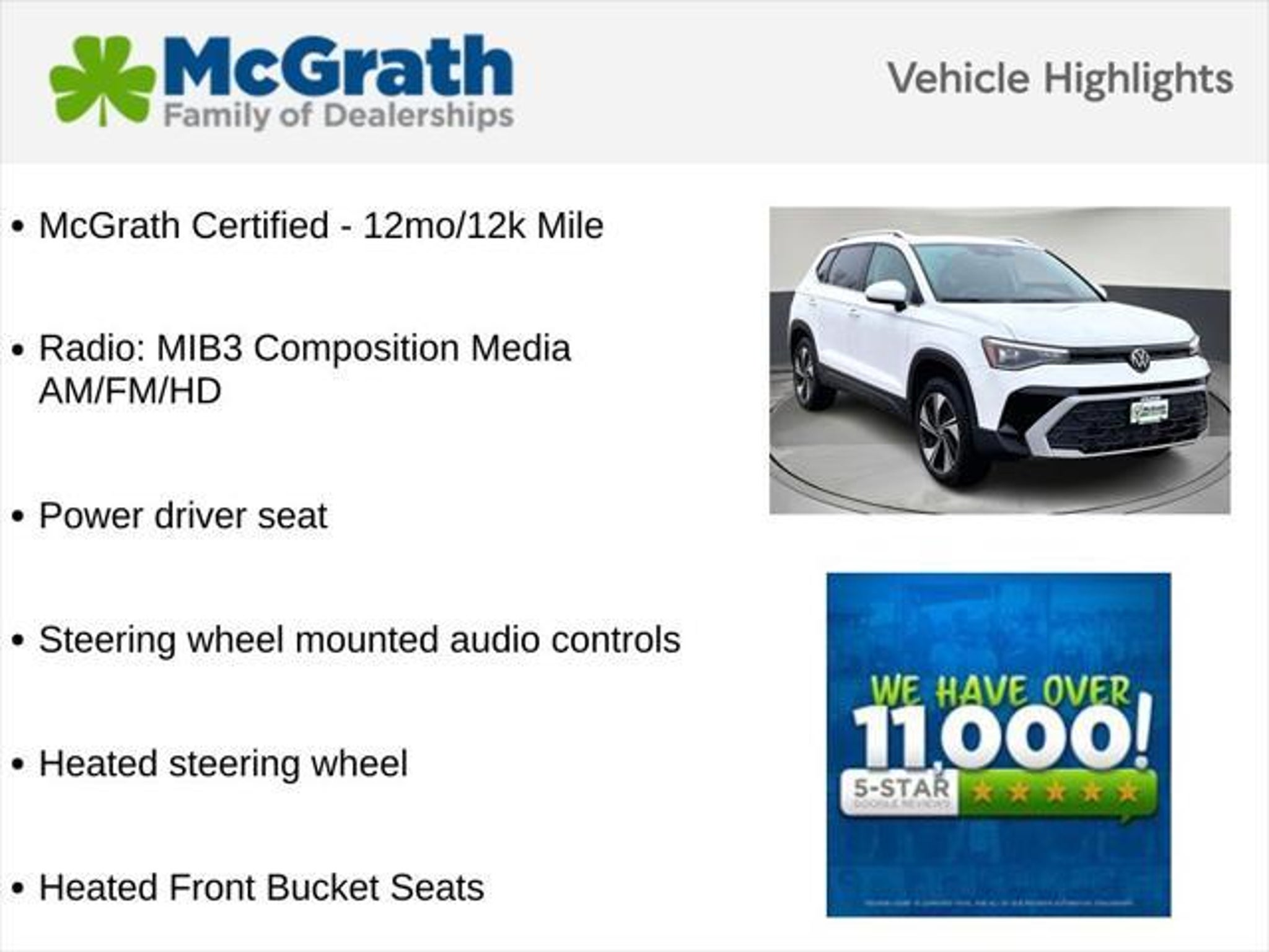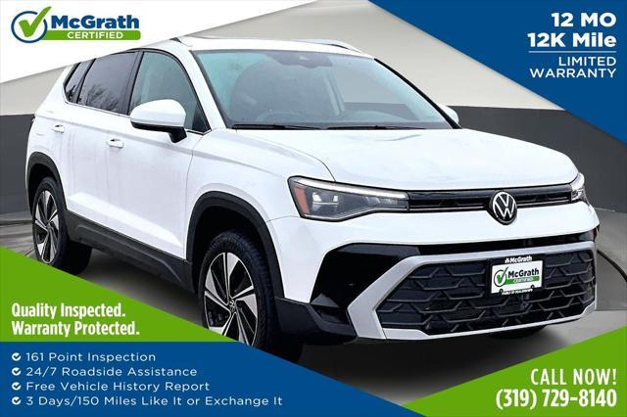 Details > 2026 Volkswagen Taos AWD SE 4motion 4DR SUV For Sale in Dubuque, IA Private Party Sellers Click here to place your ad now! You auta tell them you saw the ad in AutaBuy when you call or email. 1/28 2/28 3/28 4/28 5/28 6/28 7/28 8/28 9/28 10/28 11/28 12/28 13/28 14/28 15/28 16/28 17/28 18/28 19/28 20/28 21/28 22/28 23/28 24/28 25/28 26/28 27/28 28/28 View 28 Photos View All Add to My Garage Parked in Your Garage! Mcgrath Hyundai of Dubuque Contact Seller: I would like to: Make Offer Check Availability Ask A Question Request More Photos Check Financing Options Send a copy of this message to me Add this listing to my garage Send to Mobile Mileage 532 Exterior Color Pure White Interior Color Black Doors 4 Engine 1.5L I4 Transmission 8 Speed Auto Stock # N260089A VIN 3VVVC7B28TM002246 Estimated Monthly Payment $505 mo Apply Now J.J. Best Banc & Co. 2026 Volkswagen Taos AWD SE 4motion 4DR SUV Description: Mcgrath Hyundai Of Dubuque · Mileage: 532 · Color: Pure White Price: $28,997. Mileage 532 Exterior Color Pure White Interior Color Black Doors 4 Engine 1.5L I4 Transmission 8 Speed Auto Stock # N260089A VIN 3VVVC7B28TM002246 Estimated Monthly Payment $505 mo Apply Now J.J. Best Banc & Co. Add to My Garage Parked in Your Garage! Message Seller Mcgrath Hyundai of Dubuque Contact Seller: I would like to: Make Offer Check Availability Ask A Question Request More Photos Check Financing Options Send a copy of this message to me Add this listing to my garage Offered for sale by Mcgrath Hyundai of Dubuque DUBUQUE, IA Price: $28,997. Offered for sale by Mcgrath Hyundai of Dubuque DUBUQUE, IA [entire inventory] Ask Auta Intelligence The first collector-car AI built directly into a classic car marketplace Tell me the history on this model What factory options were available on this model? When was this model first introduced? What transmission options did these offer? How many of these were produced? What trim levels were available for this model? What colors did these come in? Can you show me more suvs for a similar price? How many passengers can this seat comfortably? What kind of mileage do these get? How far is this from me? How many Taoss were produced in White? What safety features does this model offer? Where is this located? What does this VIN number tell me? What engine options did these come with? How easy are parts to find for this model? Do you have a similar car to sell? List It Now! Questions about this car? Ask Auta Intelligence for production numbers, available options, etc. · Subscribe to AutaBuy! · Send a Gift Subscription Notice to a Friend