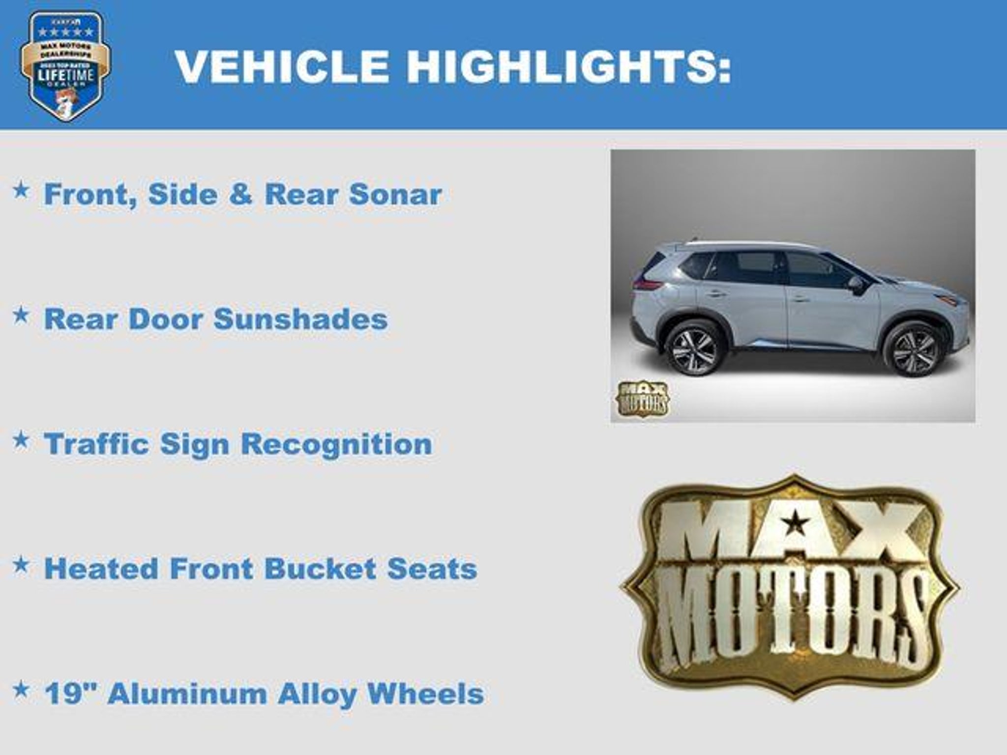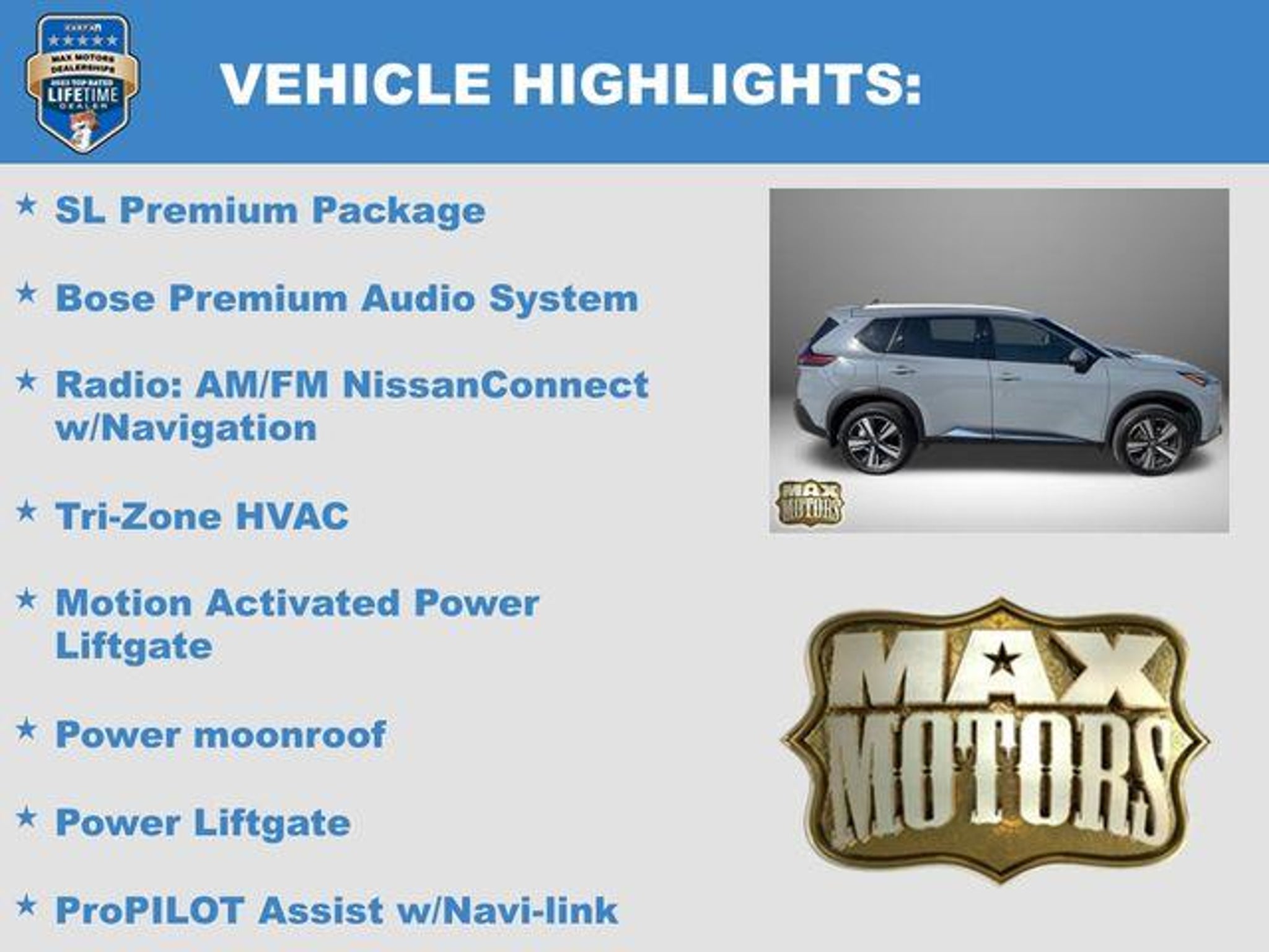 Recent Arrival! CARFAX One-Owner. Clean CARFAX. Boulder Gray Pearl/Super Black 2023 Nissan Rogue SL 4D Sport Utility SL AWD 1.5L I3 Turbocharged DOHC 12V LEV3-ULEV50 201hp 28/34 City/Highway MPG 28/34 City/Highway MPG AWD, 19 Aluminum Alloy Wheels, Bose Premium Audio System, Front, Side & Rear Sonar, Heated Front Bucket Seats, Motion Activated Power Liftgate, Power Liftgate, Power moonroof, ProPILOT Assist w/Navi-link, Radio: AM/FM NissanConnect w/Navigation, Rear Door Sunshades, SL Premium Package, Traffic Sign Recognition, Tri-Zone HVAC. At Max Motors, our mission is simple: to provide every customer with a honest, transparent, and rewarding automotive experience. For 19 years as a family-owned business, we build strong customer relationships that go beyond a sale. Buying a vehicle is significant, and we ensure the process is smooth and straightforward.