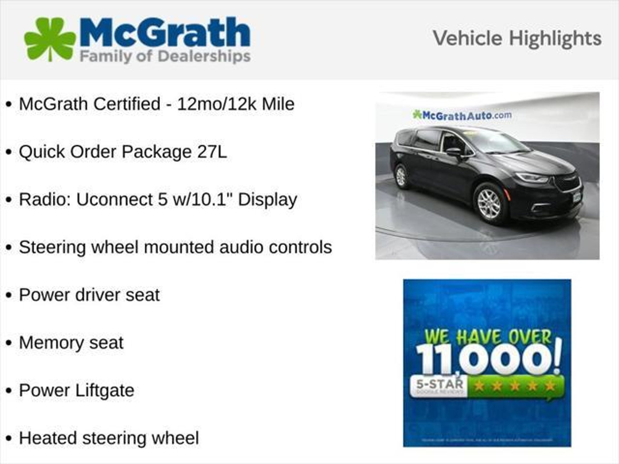 Details > 2024 Chrysler Pacifica Touring L 4DR Mini-Van For Sale in Dubuque, IA Private Party Sellers Click here to place your ad now! You auta tell them you saw the ad in AutaBuy when you call or email. 1/26 2/26 3/26 4/26 5/26 6/26 7/26 8/26 9/26 10/26 11/26 12/26 13/26 14/26 15/26 16/26 17/26 18/26 19/26 20/26 21/26 22/26 23/26 24/26 25/26 26/26 View 26 Photos View All Add to My Garage Parked in Your Garage! Mcgrath Hyundai of Dubuque Contact Seller: I would like to: Make Offer Check Availability Ask A Question Request More Photos Check Financing Options Send a copy of this message to me Add this listing to my garage Send to Mobile Mileage 52,158 Exterior Color Diamond Black Crystal Pearlcoat Interior Color Black/Alloy/Black Doors 4 Engine 3.6L V6 Transmission 9 Speed Auto Stock # N32618 VIN 2C4RC1BG1RR182549 Estimated Monthly Payment $502 mo Apply Now J.J. Best Banc & Co. 2024 Chrysler Pacifica Touring L 4DR Mini-Van Description: Mcgrath Hyundai Of Dubuque · Mileage: 52,158 · Color: Diamond Black Crystal Pearlcoat Price: $28,879. Mileage 52,158 Exterior Color Diamond Black Crystal Pearlcoat Interior Color Black/Alloy/Black Doors 4 Engine 3.6L V6 Transmission 9 Speed Auto Stock # N32618 VIN 2C4RC1BG1RR182549 Estimated Monthly Payment $502 mo Apply Now J.J. Best Banc & Co. Add to My Garage Parked in Your Garage! Message Seller Mcgrath Hyundai of Dubuque Contact Seller: I would like to: Make Offer Check Availability Ask A Question Request More Photos Check Financing Options Send a copy of this message to me Add this listing to my garage Offered for sale by Mcgrath Hyundai of Dubuque DUBUQUE, IA Price: $28,879. Offered for sale by Mcgrath Hyundai of Dubuque DUBUQUE, IA [entire inventory] Ask Auta Intelligence The first collector-car AI built directly into a classic car marketplace What safety features does this model offer? What factory options were available on this model? Tell me about this model What engine options did these come with? How many of these were produced? How many Pacificas were produced in Black? When was this model first introduced? Can you show me more vans for a similar price? How many passengers can this seat comfortably? What kind of mileage do these get? What does this VIN number tell me? What colors did these come in? What transmission options did these offer? How easy are parts to find for this model? How far is this from me? What trim levels were available for this model? Where is this located? Do you have a similar car to sell? List It Now! Questions about this car? Ask Auta Intelligence for production numbers, available options, etc. · Subscribe to AutaBuy! · Send a Gift Subscription Notice to a Friend