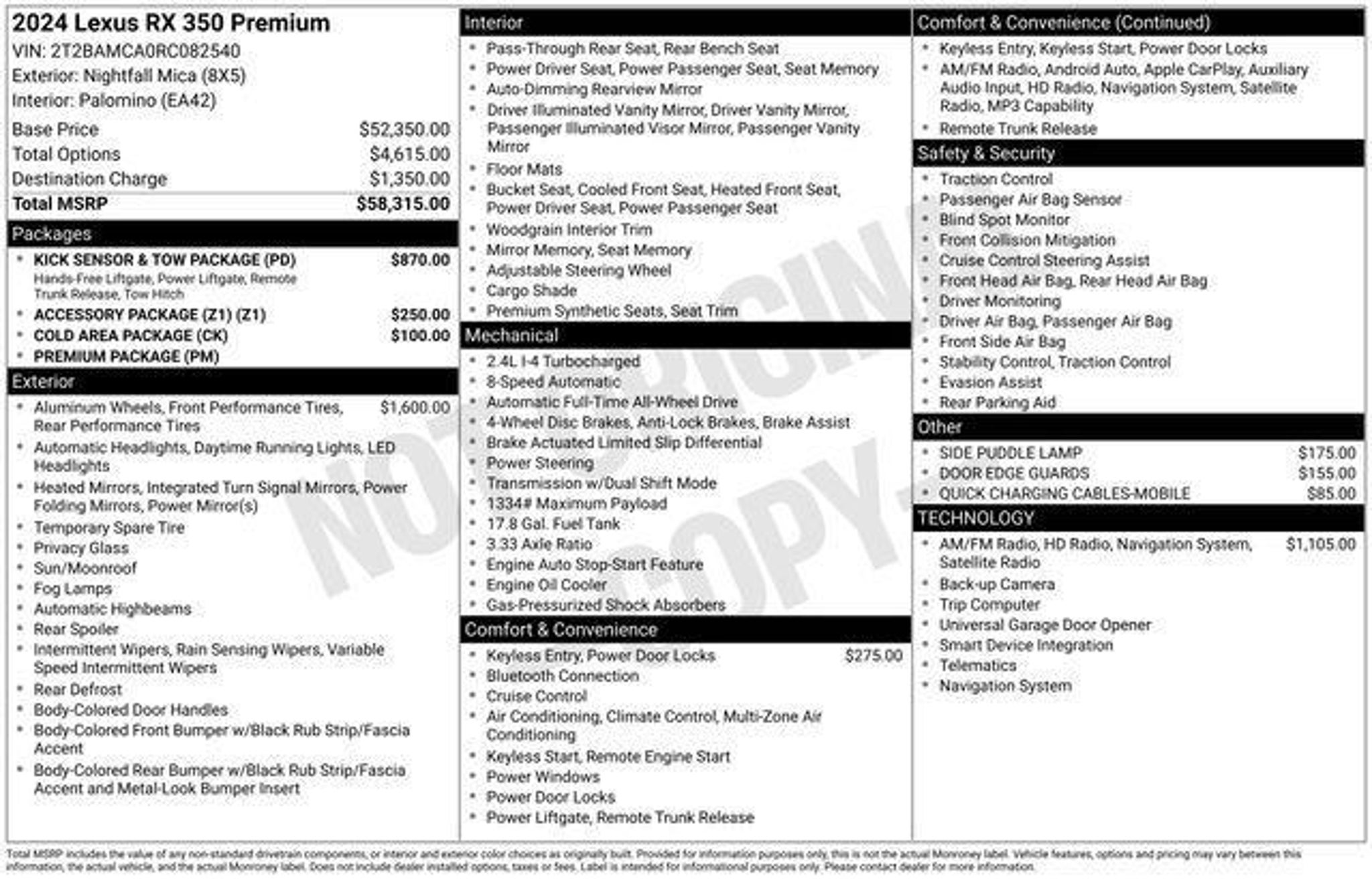 Discover the exceptional 2024 Lexus RX 350 Premium, a remarkable SUV that seamlessly blends sophistication, performance, and cutting-edge technology. This stunning vehicle, finished in a vibrant Blue exterior, is a true testament to Lexus' commitment to craftsmanship and innovation. Tailored to meet your needs, this RX 350 Premium comes equipped with an impressive array of features: - 5 Day Return / 30 Day Exchange - Auto Rewards Program - Great Service History - Local Trade - Remainder of Factory Warranty - QUICK CHARGING CABLES-MOBILE - COLD AREA PACKAGE - DOOR EDGE GUARDS - DIGITAL KEY - WHEELS: 21 20-SPOKE DARK GRAY METALLIC FINISH ALLOY - RADIO: LEXUS INTERFACE W/14 HD TOUCHSCREEN DISPLAY - KICK SENSOR & TOW PACKAGE - SIDE PUDDLE LAMP - ACCESSORY PACKAGE (Z1) Stepping inside, you'll be greeted by the sophisticated and well-appointed interior, featuring a 14-inch HD touchscreen display, wireless Apple CarPlay/Android Auto, and a premium 12-speaker audio system. The power-adjustable and ventilated front seats, along with the heated steering wheel, ensure your comfort during every journey. Beneath the sleek exterior lies a powerful 2.4L I4 turbocharged engine, delivering an impressive 275 horsepower and an exceptional fuel efficiency of 21 city/28 highway MPG. The all-wheel-drive system provides confident handling and enhanced traction, making this RX 350 Premium a versatile companion for any road condition. Safety is of the utmost importance, and this Lexus RX 350 Premium is equipped with a comprehensive suite of advanced safety features, including Automatic Emergency Braking, Lane Departure Alert, and Adaptive Cruise Control, ensuring your peace of mind on the road. With its stunning design, exceptional performance, and unparalleled attention to detail, the 2024 Lexus RX 350 Premium is a remarkable SUV that will exceed your expectations. Experience the difference that Lexus craftsmanship and innovation can make. Visit our showroom today to take this remarkable vehicle for a test drive and discover the true joy of ownership.