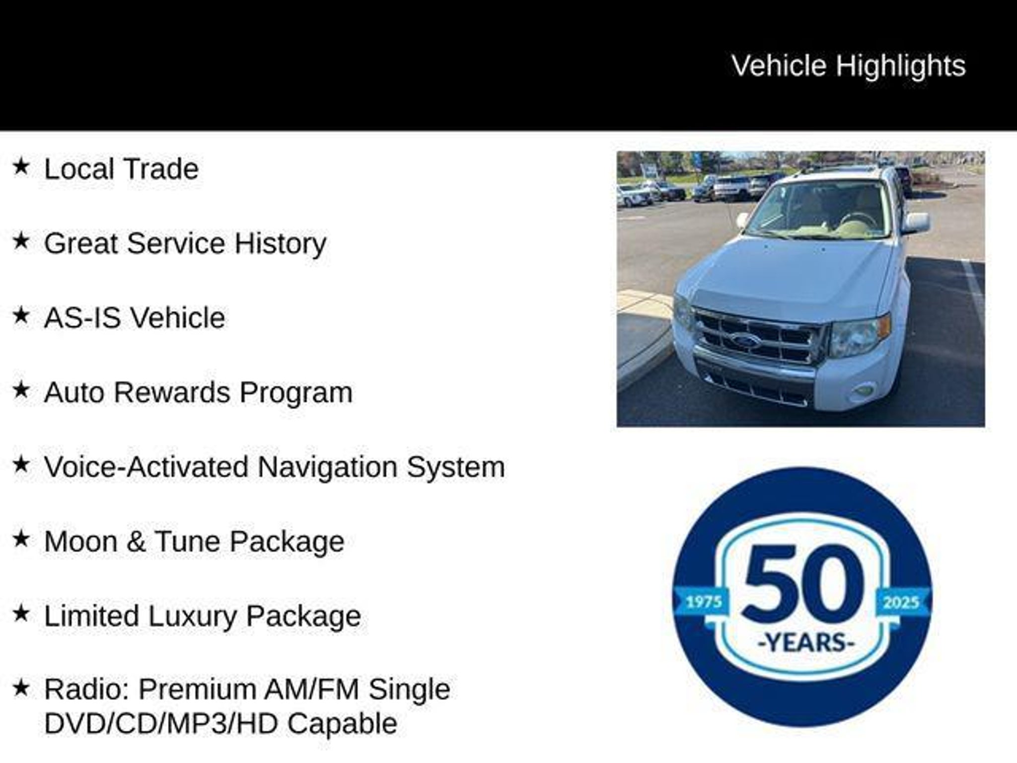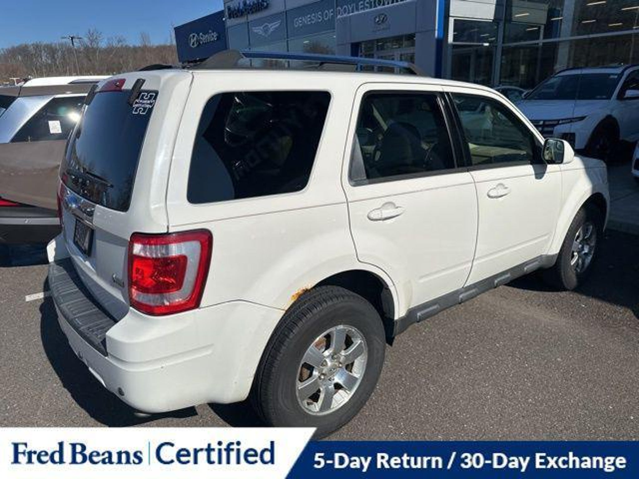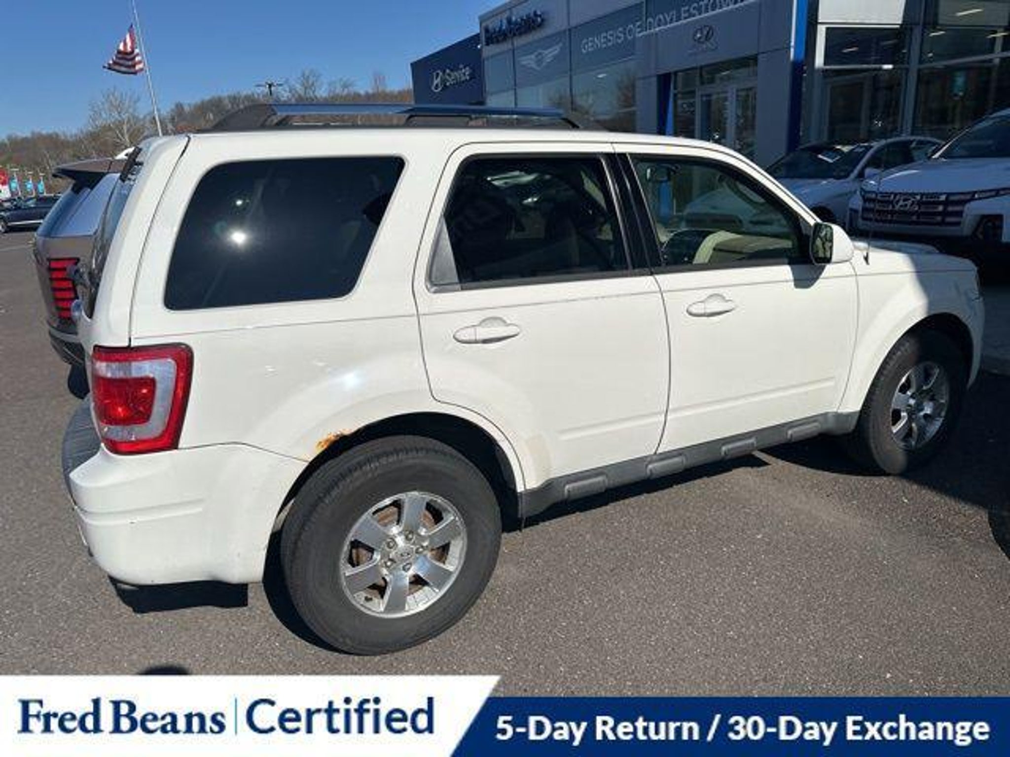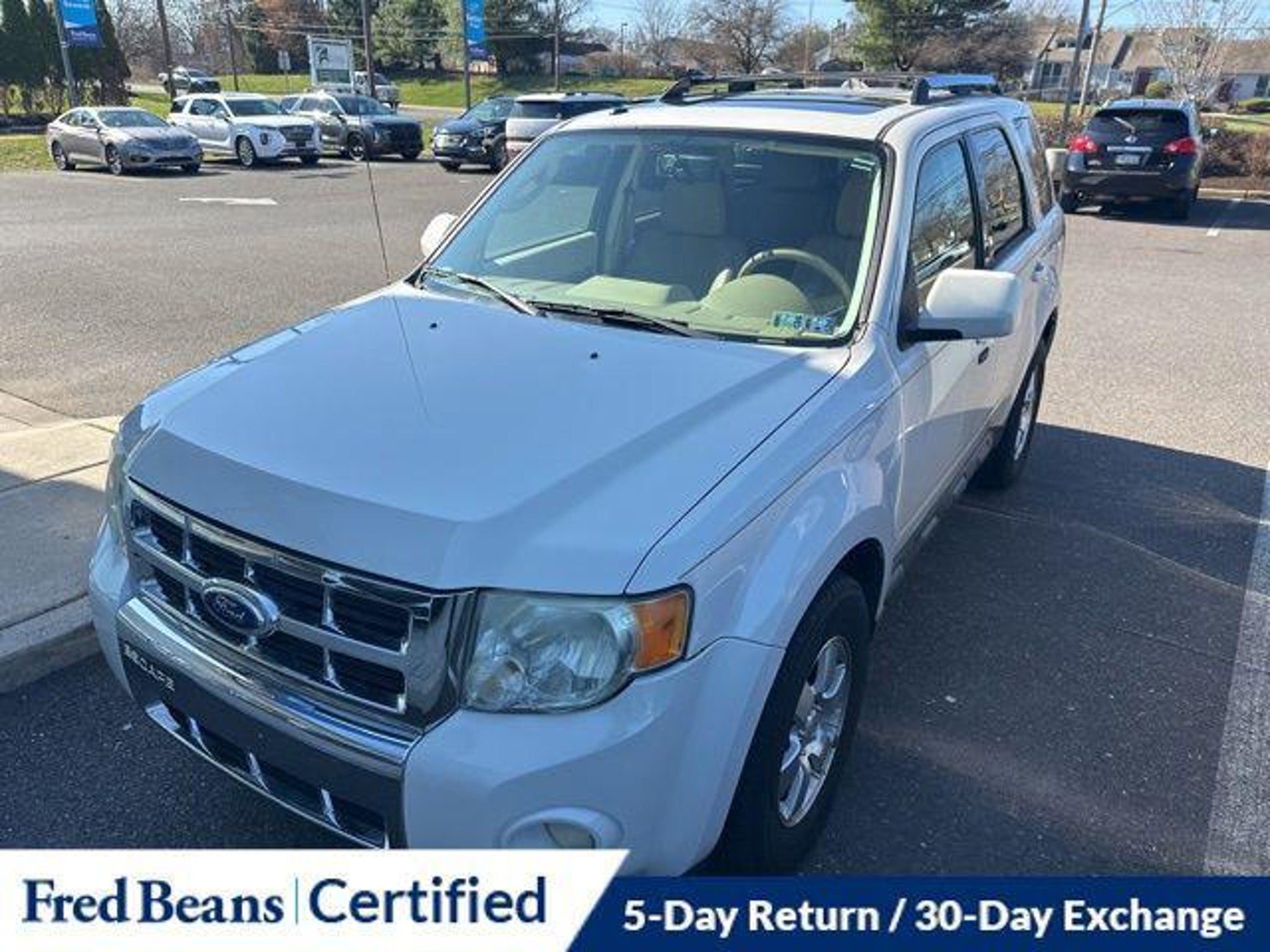 Discover the perfect blend of style, capability, and convenience in this 2011 Ford Escape Limited. With its sleek white exterior and well-appointed interior, this SUV is ready to elevate your driving experience. - AS-IS Vehicle - Auto Rewards Program - Great Service History - Local Trade - 302A RAPID SPEC ORDER CODE - Voice-Activated Navigation System with Integrated SIRIUS Travel Link - 3.0L V6 Flex Fuel Engine This Escape Limited is packed with premium features that will make every journey a pleasure. Enjoy the convenience of dual-zone electronic automatic temperature control, a reverse sensing system, and a rearview camera. The voice-activated navigation system with a 40GB hard drive and SIRIUS Travel Link will keep you connected and informed on the road. Indulge in the luxurious amenities of the Limited Luxury Package, including a power driver's seat, a leather-wrapped steering wheel, and heated front seats. The Moon & Tune Package adds a sunroof and a premium sound system with 7 speakers, ensuring you can create the perfect ambiance. Safety is a top priority, with features like electronic stability control, traction control, and a suite of airbags to protect you and your passengers. The four-wheel independent suspension and speed-sensing steering provide a smooth and confident ride, no matter the terrain. With its impressive 23 MPG on the highway and 18 MPG in the city, this Escape Limited delivers the balance of power and efficiency you demand. Discover the perfect blend of style, capability, and convenience in this exceptional SUV. We invite you to experience the 2011 Ford Escape Limited for yourself. Schedule a test drive today and let us demonstrate how this vehicle can elevate your driving experience.