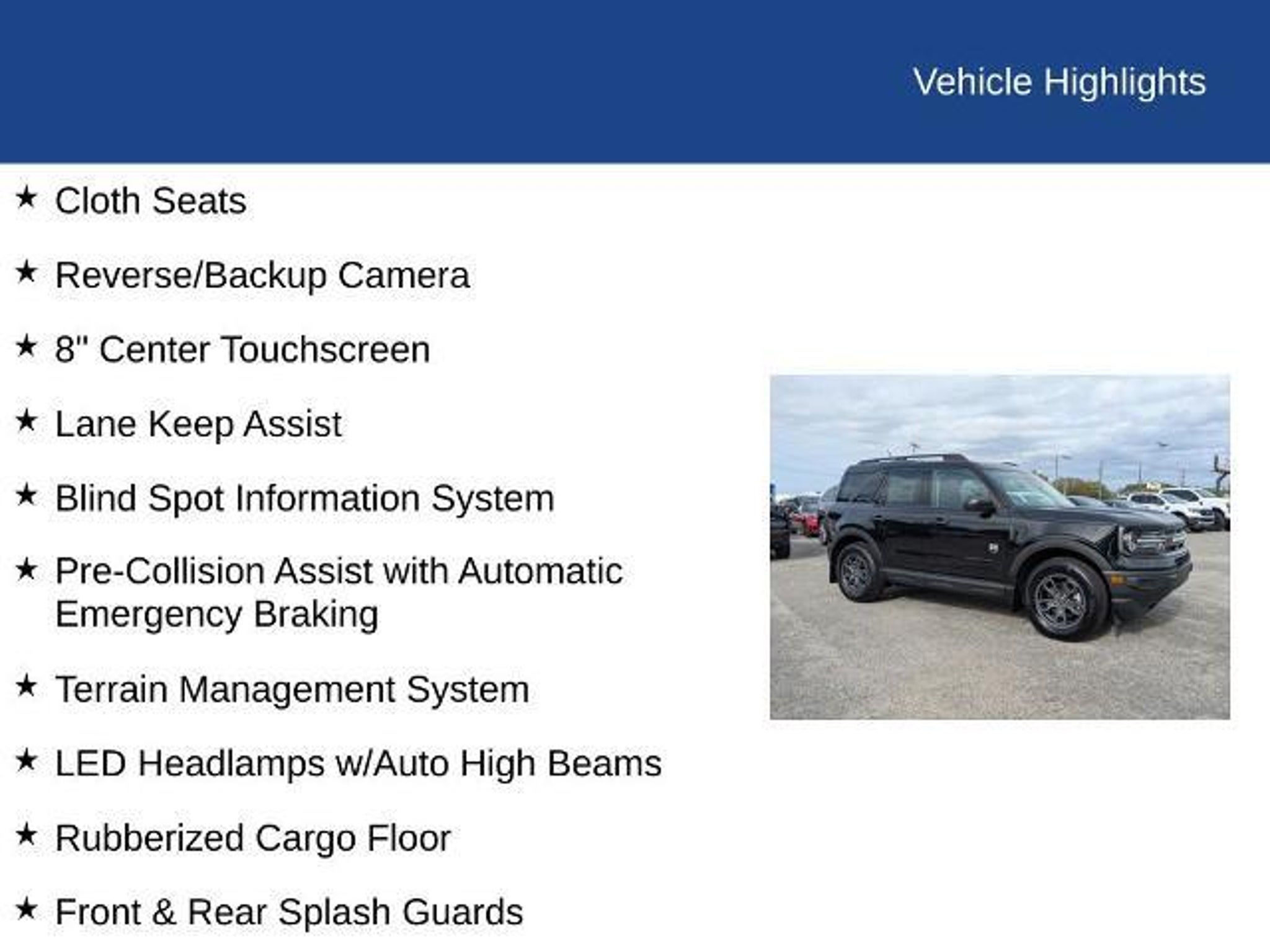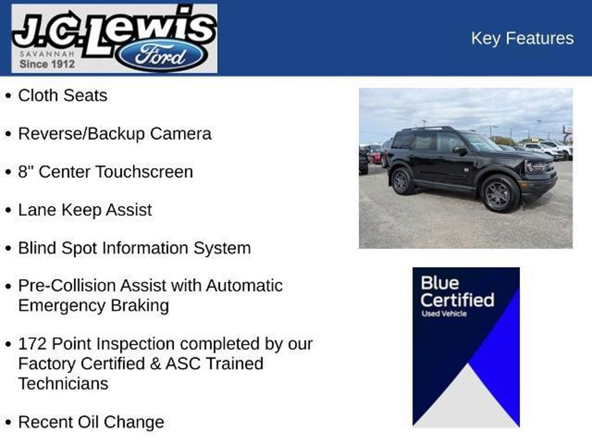 **FACTORY CERTIFIED** * Ford Blue Advantage: Blue Certified * 139 Point Inspection by Factory Certified Technicians * Roadside Assistance * Comprehensive Limited Warranty: 3 Month/4,000 Mile with Roadside Assistance Low miles and adventure-ready attitude define this 2024 Ford Bronco Sport Big Bend, VIN 3FMCR9B6XRRF07764, with just 5,906 miles, built to handle daily driving and weekend escapes with equal confidence. Finished with rugged styling details like 17 Carbon Gray wheels, black door handles, a black roof rack, and splash guards, this Bronco Sport carries a purposeful look from every angle. LED headlamps with auto high beams provide clear visibility, adding both style and function. Inside, durable floor liners and a rubberized cargo floor make cleanup easy after outdoor trips or busy workdays. Technology is straightforward and user-friendly with SYNC 3, an 8 touchscreen, backup camera, and cruise control, keeping you connected and in control on the road. Equipped with the Terrain Management System, this Bronco Sport is ready to adapt to changing conditions, while driver-assist features like lane keep assist and pre-collision assist add confidence to every drive. With low mileage, practical features, and signature Bronco capability, this Big Bend is a versatile SUV ready for whatever comes next. ***Odometer is 23,946 miles below market average!*** CARFAX One-Owner. Clean CARFAX. Cloth Seats, Reverse/Backup Camera, 8 Center Touchscreen, Lane Keep Assist, Blind Spot Information System, Pre-Collision Assist with Automatic Emergency Braking, 172 Point Inspection completed by our Factory Certified & ASC Trained Technicians, Recent Oil Change, Vehicle Detailed, CLEAN HISTORY/NO ACCIDENTS, Terrain Management System, LED Headlamps w/Auto High Beams, Rubberized Cargo Floor, Front & Rear Splash Guards, Heated Power Side Mirrors, 17 Carbonized Gray-Painted Aluminum Wheels, 6 Speakers, Automatic Temperature Control, Equipment Group 200A, Rear Window Wiper, Speed Control, SYNC 3 Communications & Entertainment System. Savannah, GA ? J.C. Lewis Ford Built Ford Tough. In Savannah and throughout the Lowcountry, we believe in doing things right ? with integrity, value, and a handshake that means something. That?s why we include over 20 photos and a full walkaround video, so you can take a close look before ever stepping on the lot. At J.C. Lewis Ford in Savannah, we offer transparent deals and dependable vehicles, whether you're headed downtown or back to the farm. We?re happy to provide an Au