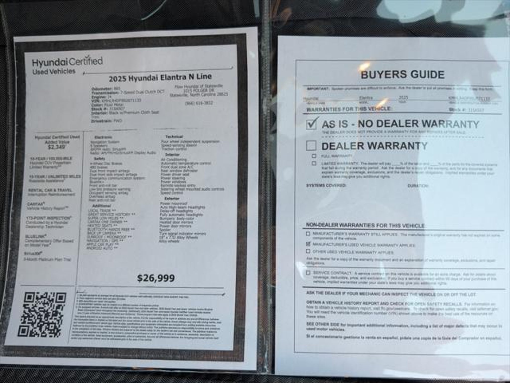 Details > 2025 Hyundai Elantra N Line 4DR Sedan For Sale in Statesville, NC Private Party Sellers Click here to place your ad now! You auta tell them you saw the ad in AutaBuy when you call or email. 1/35 2/35 3/35 4/35 5/35 6/35 7/35 8/35 9/35 10/35 11/35 12/35 13/35 14/35 15/35 16/35 17/35 18/35 19/35 20/35 21/35 22/35 23/35 24/35 25/35 26/35 27/35 28/35 29/35 30/35 31/35 32/35 33/35 34/35 35/35 View 35 Photos View All Add to My Garage Parked in Your Garage! Flow Hyundai of Statesville Contact Seller: I would like to: Make Offer Check Availability Ask A Question Request More Photos Check Financing Options Send a copy of this message to me Add this listing to my garage Send to Mobile Mileage 867 Exterior Color Fluid Metal Interior Color Black W/RED Stitching Doors 4 Engine 1.6L I4 Transmission 7 Speed Auto Stock # 31SA507 VIN KMHLR4DF9SU071133 Estimated Monthly Payment $470 mo Apply Now J.J. Best Banc & Co. 2025 Hyundai Elantra N Line 4DR Sedan Description: Flow Hyundai of Statesville · Mileage: 867 · Color: Fluid Metal Price: $26,999. Mileage 867 Exterior Color Fluid Metal Interior Color Black W/RED Stitching Doors 4 Engine 1.6L I4 Transmission 7 Speed Auto Stock # 31SA507 VIN KMHLR4DF9SU071133 Estimated Monthly Payment $470 mo Apply Now J.J. Best Banc & Co. Add to My Garage Parked in Your Garage! Message Seller Flow Hyundai of Statesville Contact Seller: I would like to: Make Offer Check Availability Ask A Question Request More Photos Check Financing Options Send a copy of this message to me Add this listing to my garage Offered for sale by Flow Hyundai of Statesville STATESVILLE, NC Price: $26,999. Offered for sale by Flow Hyundai of Statesville STATESVILLE, NC [entire inventory] Ask Auta Intelligence The first collector-car AI built directly into a classic car marketplace How easy are parts to find for this model? What colors did these come in? How many Elantras were produced in Fluid Metal? What kind of mileage do these get? What does this VIN number tell me? Can you show me more cars for a similar price? When was this model first introduced? Tell me about this model What transmission options did these offer? What engine options did these come with? Where is this located? What factory options were available on this model? How far is this from me? How many of these were produced? What trim levels were available for this model? Do you have a similar car to sell? List It Now! Questions about this car? Ask Auta Intelligence for production numbers, available options, etc. · Subscribe to AutaBuy! · Send a Gift Subscription Notice to a Friend