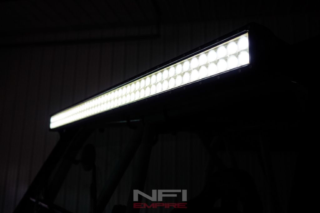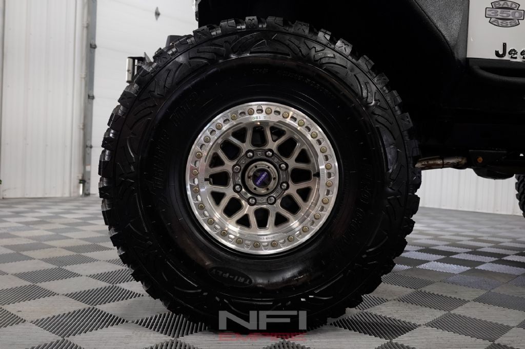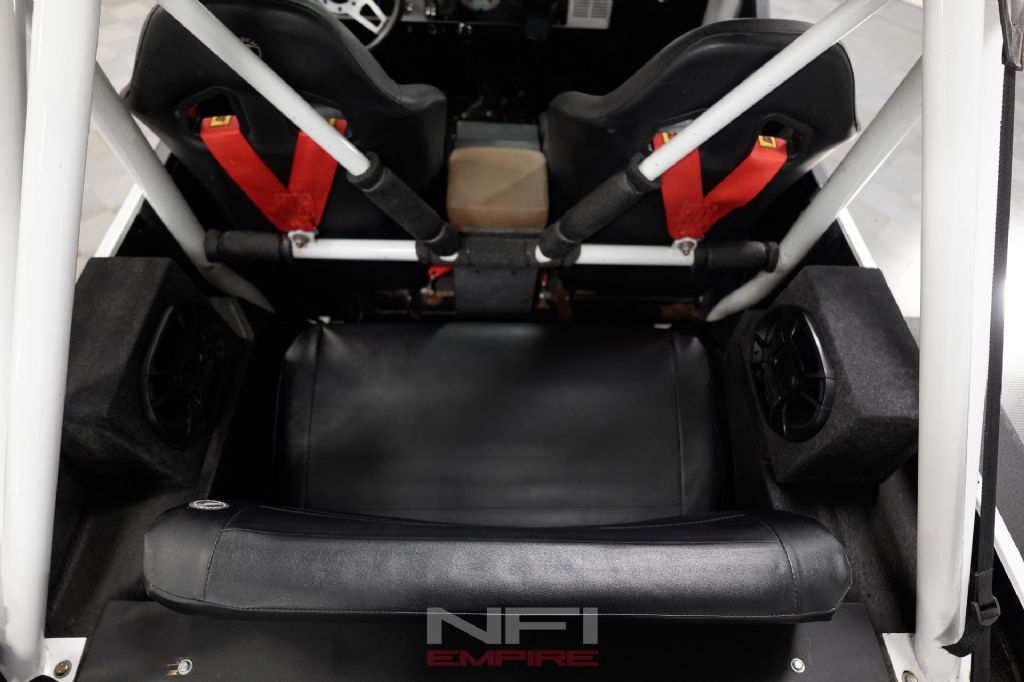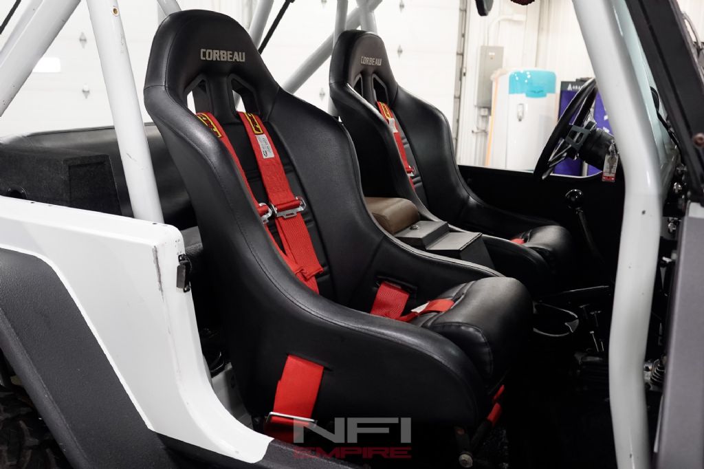 Inside, this CJ7 is fitted with Corbeau seats and 4-point harnesses along with a custom-built DOM-tubing roll cage. A Bluetooth sound system has been added, and it also comes with a bikini top for open-air driving. An aluminum radiator helps support cooling duties, and the Jeep rides on Grenade Crawl beadlock wheels with 40-inch tires, plus a matching spare wheel and tire. A 50-inch light bar rounds out the exterior.