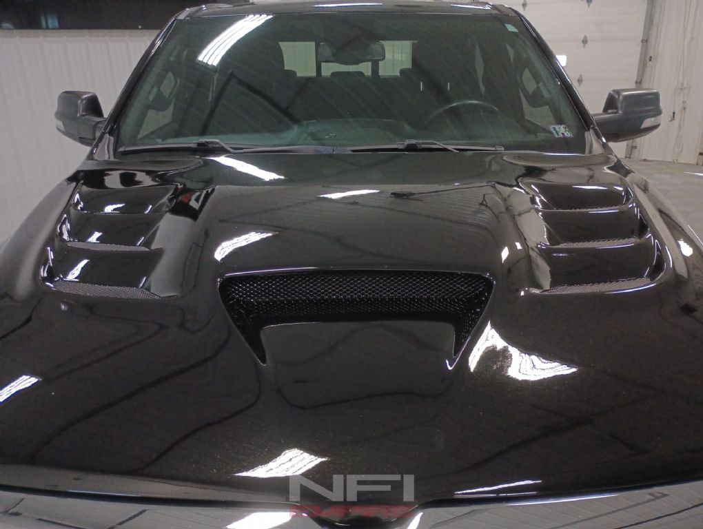 The suspension has been upgraded with a 4-inch lift along with Rough Country Vertex fully adjustable coilover shocks, giving the truck a more aggressive stance while still keeping it usable on the street. Additional exterior upgrades include a custom air induction hood, molded fender flares, tailgate spoiler, push bar with LED light bar, tinted windows, black window visors, AMP electric retractable running boards, and a Flex hard tri-fold bed cover. The result is a truck that stands out visually while still offering the function expected from a modern full-size pickup.