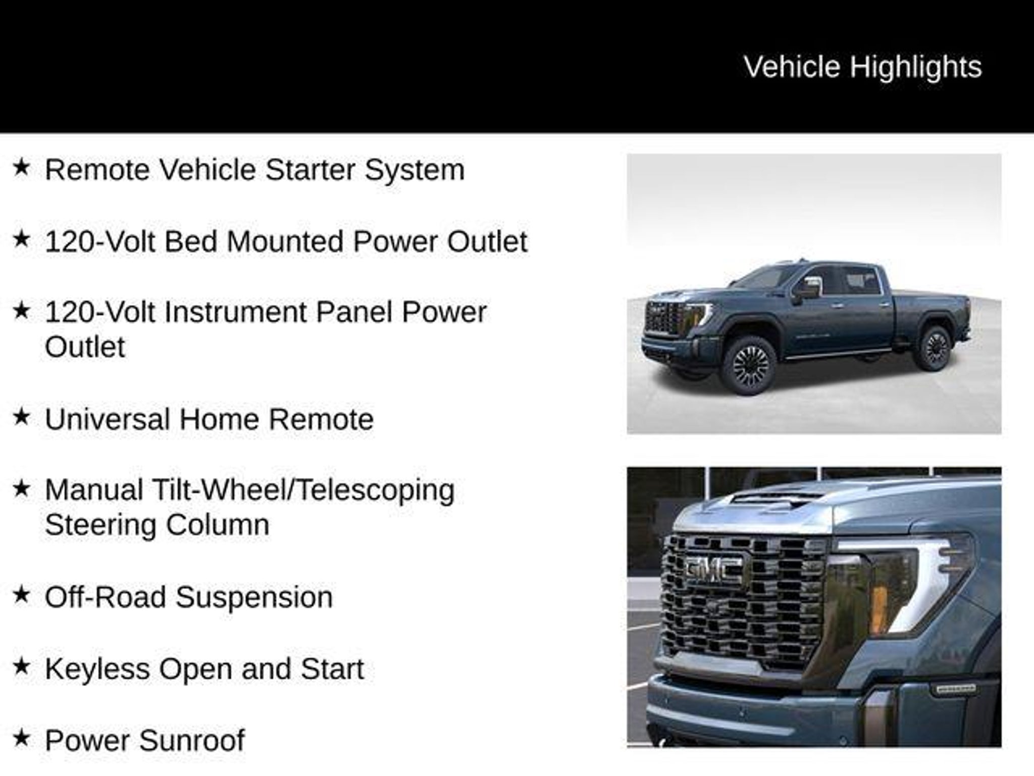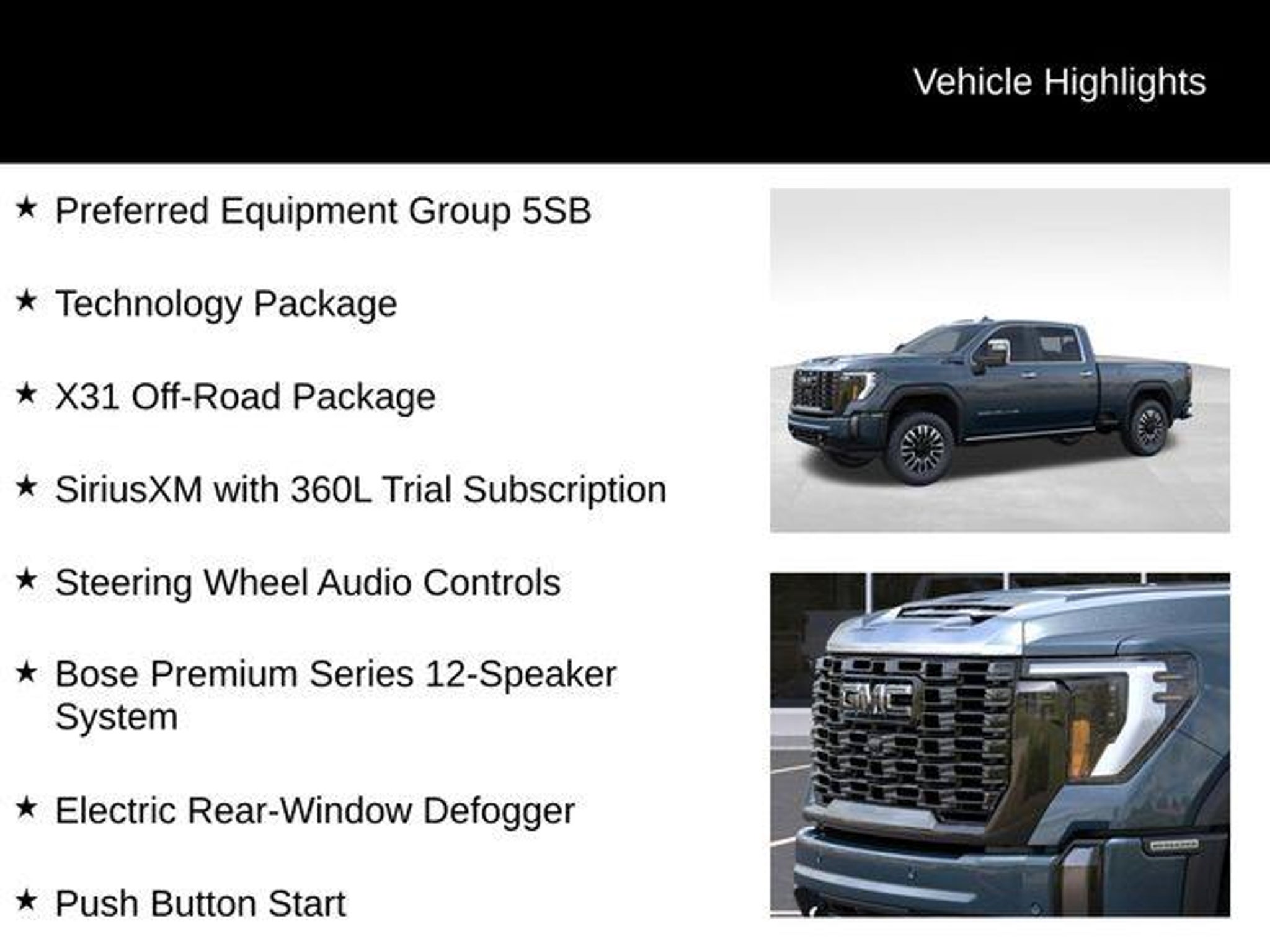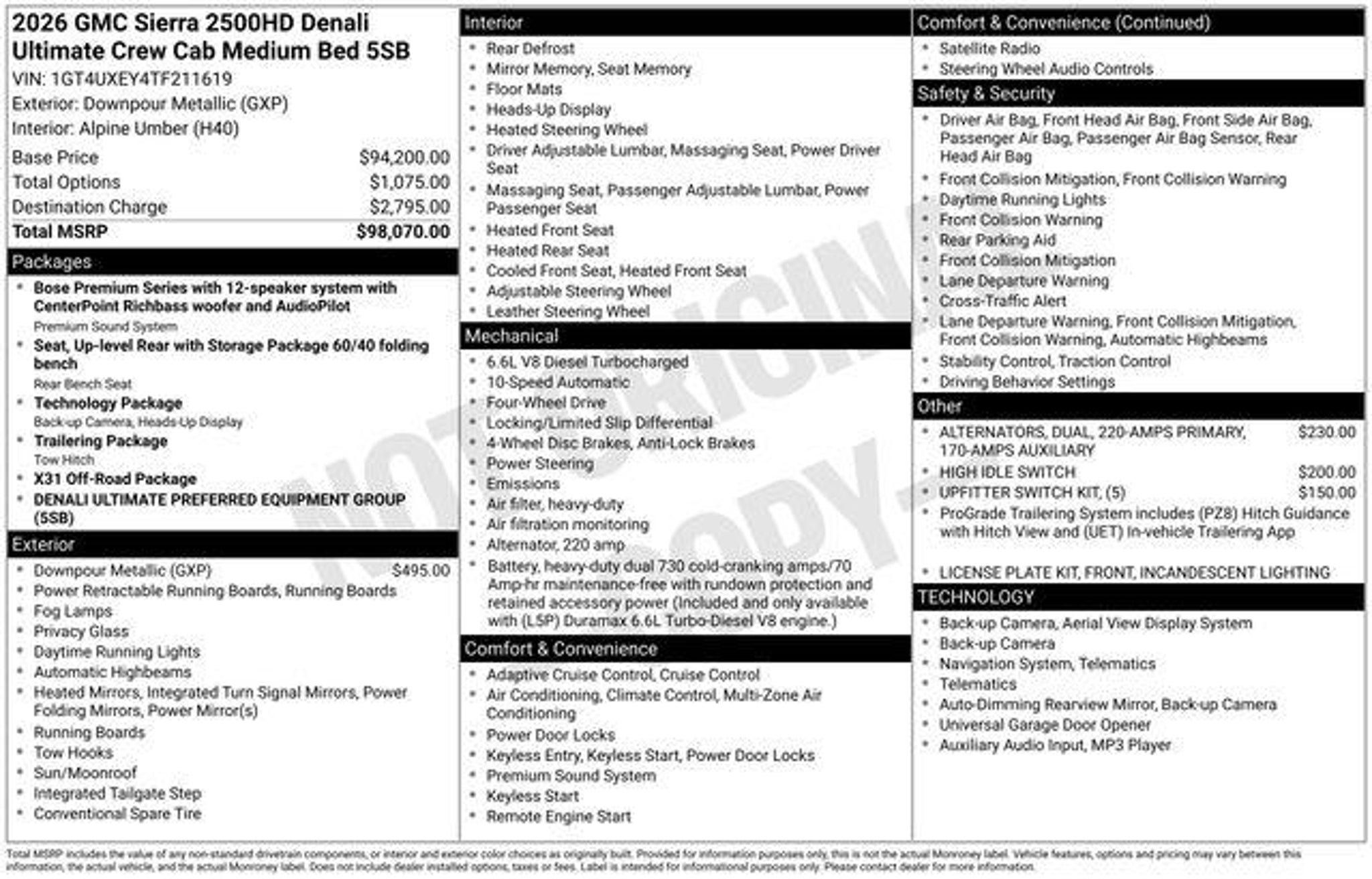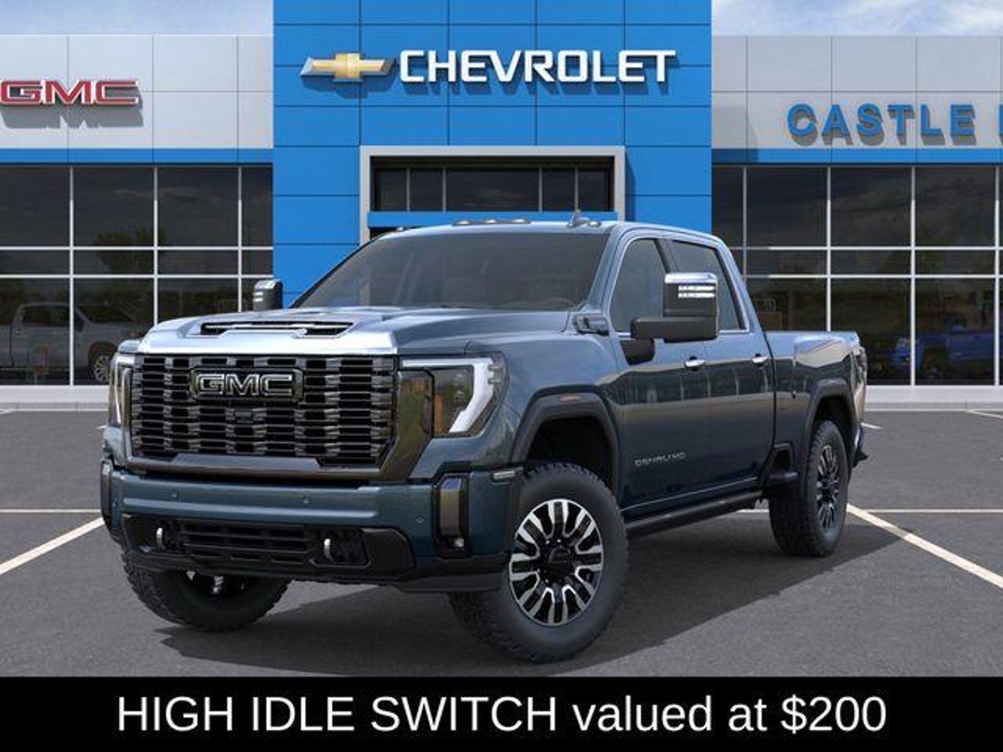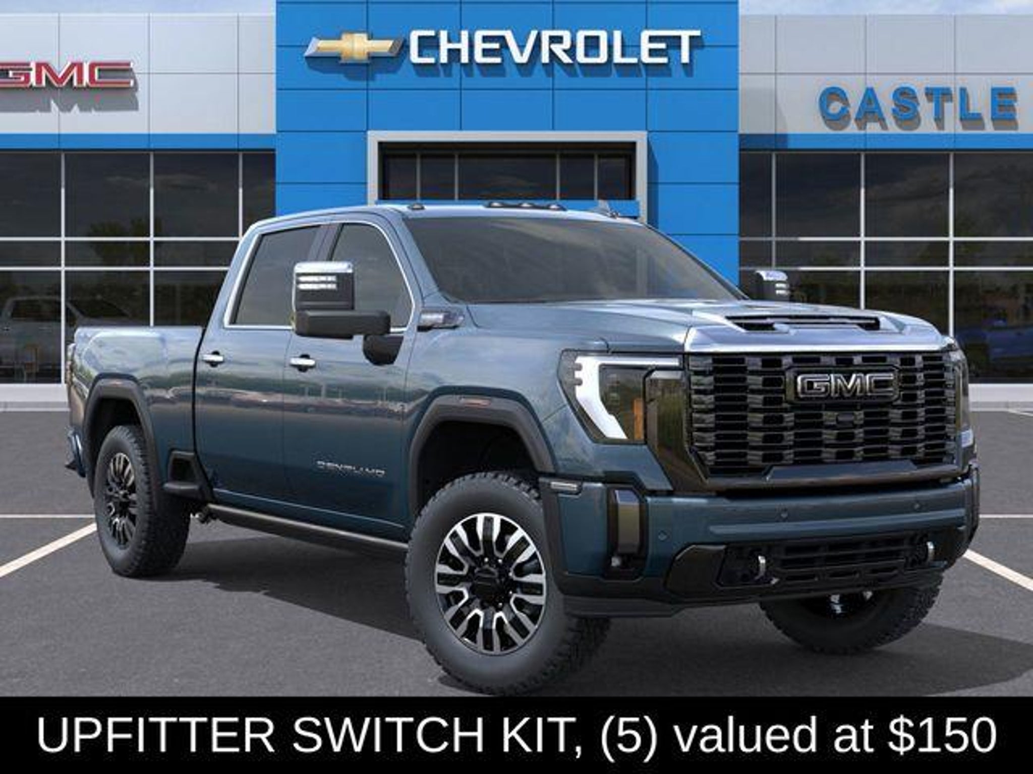 Introducing the 2026 GMC Sierra 2500HD Denali Ultimate - a true powerhouse built to conquer any terrain. This exceptional vehicle boasts a stunning Downpour Metallic Blue exterior, complemented by a host of premium features that elevate the driving experience to new heights. Tailored to meet the demands of the discerning driver, this Sierra 2500HD Denali Ultimate comes equipped with an impressive array of custom features, including: - UPFITTER SWITCH KIT (5) - Dual 220-Amp Primary and 170-Amp Auxiliary Alternators - High Idle Switch Elevating the off-road capabilities, the X31 Off-Road Package and 2-Speed Active Transfer Case ensure you can tackle even the most challenging terrain with confidence. The Preferred Equipment Group 5SB and Technology Package further enhance the vehicle's versatility and convenience. Stepping inside, you'll be captivated by the Bose Premium Series 12-Speaker System, which delivers a concert-hall-quality audio experience. The SiriusXM with 360L Trial Subscription keeps you connected to your favorite tunes, while the Steering Wheel Audio Controls allow you to effortlessly navigate your media. The Electric Rear-Window Defogger and 120-Volt Bed Mounted Power Outlet provide added convenience, while the Push Button Start and Remote Vehicle Starter System offer unparalleled ease of use. Safety and technology take center stage with features like the Lane Departure Warning System, Universal Home Remote, and the stunning Multicolor 15 Diagonal Head-Up Display. The Bed View Camera with Two Trailer Camera Provisions, Trailer Cam Provisions and Trailer Viewing Software, and Trailer Side Blind Zone Alert ensure you can tow with confidence, while the Ultrasonic Front and Rear Park Assist and HD Surround Vision provide a seamless parking experience. Comfort and convenience are also at the forefront, with the Heated Steering Wheel, Heated and Ventilated Driver and Front Outboard Passenger Seats, and Heated 2nd Row Outboard Seats. The Power Sunroof and Deep-Tinted Glass add to the luxurious ambiance, while the Wireless Charging and Wireless Phone Projection keep your devices powered and connected. This exceptional 2026 GMC Sierra 2500HD Denali Ultimate is a true testament to the brand's commitment to excellence. Experience the ultimate in power, capability, and refinement by visiting CASTLE ROCK FORD or calling for your V.I.P. appointment at 720-733-7057. Price does not include Tax, Title and Fees.