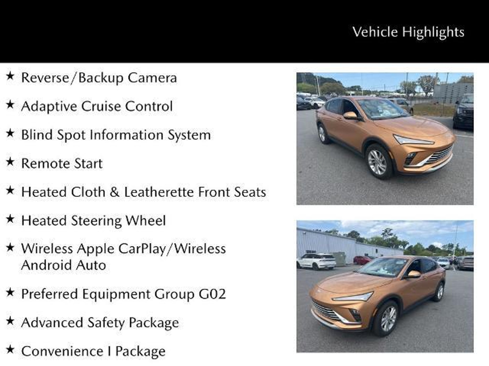 Sleek design meets smart efficiency in this 2024 Buick Envista Preferred (VIN KL47LAE23RB020860) with 40,696 miles, offering a modern crossover that?s both stylish and practical for everyday driving. Inside, heated cloth and leatherette front seats and a heated steering wheel provide comfort in any season, while a power driver seat helps you find the perfect driving position. Remote start adds convenience, and a premium audio system delivers clear, enjoyable sound throughout the cabin. Equipped with the Convenience I Package and Advanced Safety Package, this Envista brings added ease and confidence with features like a backup camera and Blind Spot Information System to help you stay aware on the road. Delivering an efficient 28 city and 32 highway MPG, this Envista is designed to keep fuel stops to a minimum without sacrificing comfort or capability. With its sharp styling, strong fuel economy, and well-rounded feature set, this Buick Envista Preferred is ready to elevate your daily drive. ***LOCAL TRADE*** Clean CARFAX. Heated Cloth & Leatherette Front Seats, 8-Way Power Driver Seat Adjuster, Reverse/Backup Camera, Adaptive Cruise Control, Blind Spot Information System, Remote Start, 172 Point Inspection completed by our Factory Certified & ASC Trained Technicians, CLEAN HISTORY/NO ACCIDENTS, Recent Oil Change, Vehicle Detailed, Heated Steering Wheel, Wireless Apple CarPlay/Wireless Android Auto, Advanced Safety Package, Convenience I Package, Flat-Bottom Wrapped Steering Wheel, Front Doors Keyless Open, Lane Change Alert w/Side Blind Zone Alert, Preferred Equipment Group G02, Premium 6-Speaker Audio System Feature, Rear Cross Traffic Alert. Savannah, GA ? J.C. Lewis Mazda Smart Choices Start Here At J.C. Lewis Mazda, we know today?s drivers are informed, connected, and always looking for smart value. That?s why we include over 20 high-resolution photos and a full walkaround video with every vehicle ? so you can evaluate the details before ever stepping on the lot. Whether you?re a tech-forward professional, a college student, or simply someone who appreciates smart engineering, Mazda delivers the perfect balance of innovation, efficiency, and driving enjoyment. We?ll gladly provide a complimentary AutoCheck or CARFAX report for full transparency. Visit us at 10101 Abercorn St in Savannah, GA or call (912)-927-1000 ? and experience a dealership that?s as forward-thinking as you are.