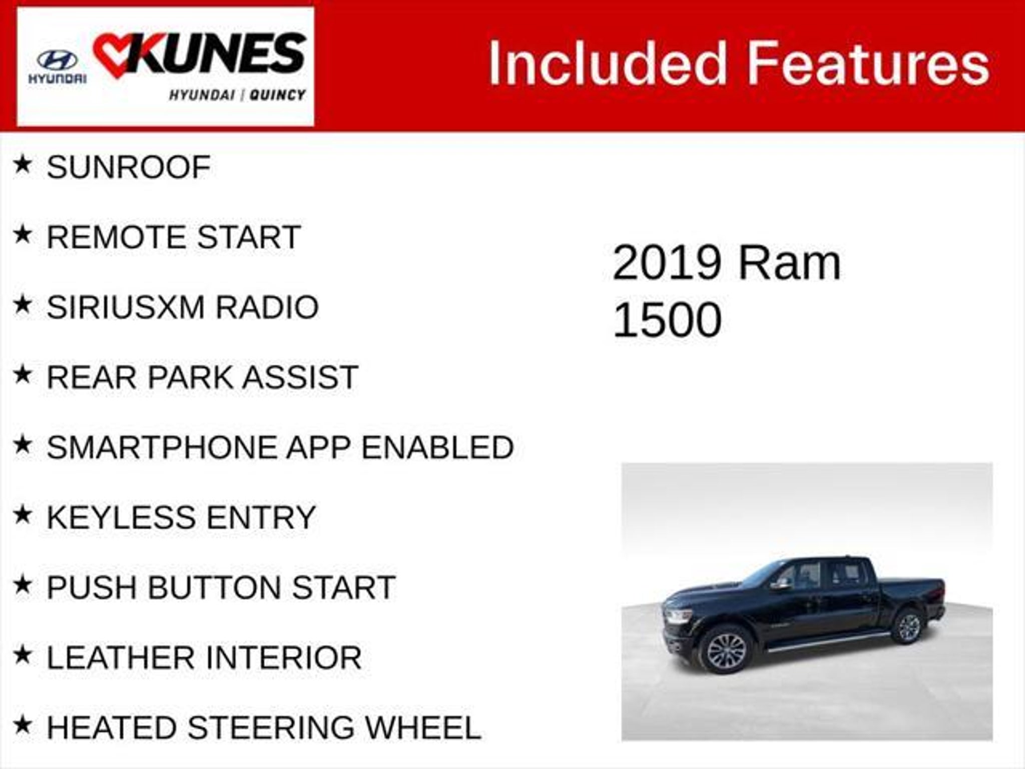 Details > 2019 RAM 1500 4X4 Laramie 4DR Crew Cab 5.6 FT. SB Pickup For Sale in Quincy, IL Private Party Sellers Click here to place your ad now! You auta tell them you saw the ad in AutaBuy when you call or email. 1/31 2/31 3/31 4/31 5/31 6/31 7/31 8/31 9/31 10/31 11/31 12/31 13/31 14/31 15/31 16/31 17/31 18/31 19/31 20/31 21/31 22/31 23/31 24/31 25/31 26/31 27/31 28/31 29/31 30/31 31/31 View 31 Photos View All Add to My Garage Parked in Your Garage! Kunes Country Hyundai of Quincy Contact Seller: I would like to: Make Offer Check Availability Ask A Question Request More Photos Check Financing Options Send a copy of this message to me Add this listing to my garage Send to Mobile Mileage 82,714 Exterior Color Diamond Black Crystal Pearlcoat Interior Color Black Doors 4 Engine 5.7L V8 Transmission 8 Speed Auto Stock # 14P1058 Ad ID 108901480 VIN 1C6SRFJT3KN721078 Estimated Monthly Payment $522 mo Apply Now J.J. Best Banc & Co. 2019 RAM 1500 4X4 Laramie 4DR Crew Cab 5.6 FT. SB Pickup Description: Kunes Country Hyundai of Quincy · Mileage: 82,714 · Color: Diamond Black Crystal Pearlcoat Price: $29,998. Mileage 82,714 Exterior Color Diamond Black Crystal Pearlcoat Interior Color Black Doors 4 Engine 5.7L V8 Transmission 8 Speed Auto Stock # 14P1058 Ad ID 108901480 VIN 1C6SRFJT3KN721078 Estimated Monthly Payment $522 mo Apply Now J.J. Best Banc & Co. Add to My Garage Parked in Your Garage! Message Seller Kunes Country Hyundai of Quincy Contact Seller: I would like to: Make Offer Check Availability Ask A Question Request More Photos Check Financing Options Send a copy of this message to me Add this listing to my garage Offered for sale by Kunes Country Hyundai of Quincy QUINCY, IL Price: $29,998. Offered for sale by Kunes Country Hyundai of Quincy QUINCY, IL [entire inventory] Ask Auta Intelligence The first collector-car AI built directly into a classic car marketplace Can you show me more pickups/trucks for a similar price? What factory options were available on this model? How far is this from me? How easy are parts to find for this model? What's the typical towing capacity in this configuration? What does this VIN number tell me? What trim levels were available for this model? What engine options did these come with? What colors did these come in? How many 1500s were produced in Black? What size tires does this run from the factory? Where is this located? When was this model first introduced? Tell me the history on this model How many of these were produced? What kind of mileage do these get? What transmission options did these offer? Do you have a similar car to sell? List It Now! Questions about this car? Ask Auta Intelligence for production numbers, available options, etc. · Subscribe to AutaBuy! · Send a Gift Subscription Notice to a Friend