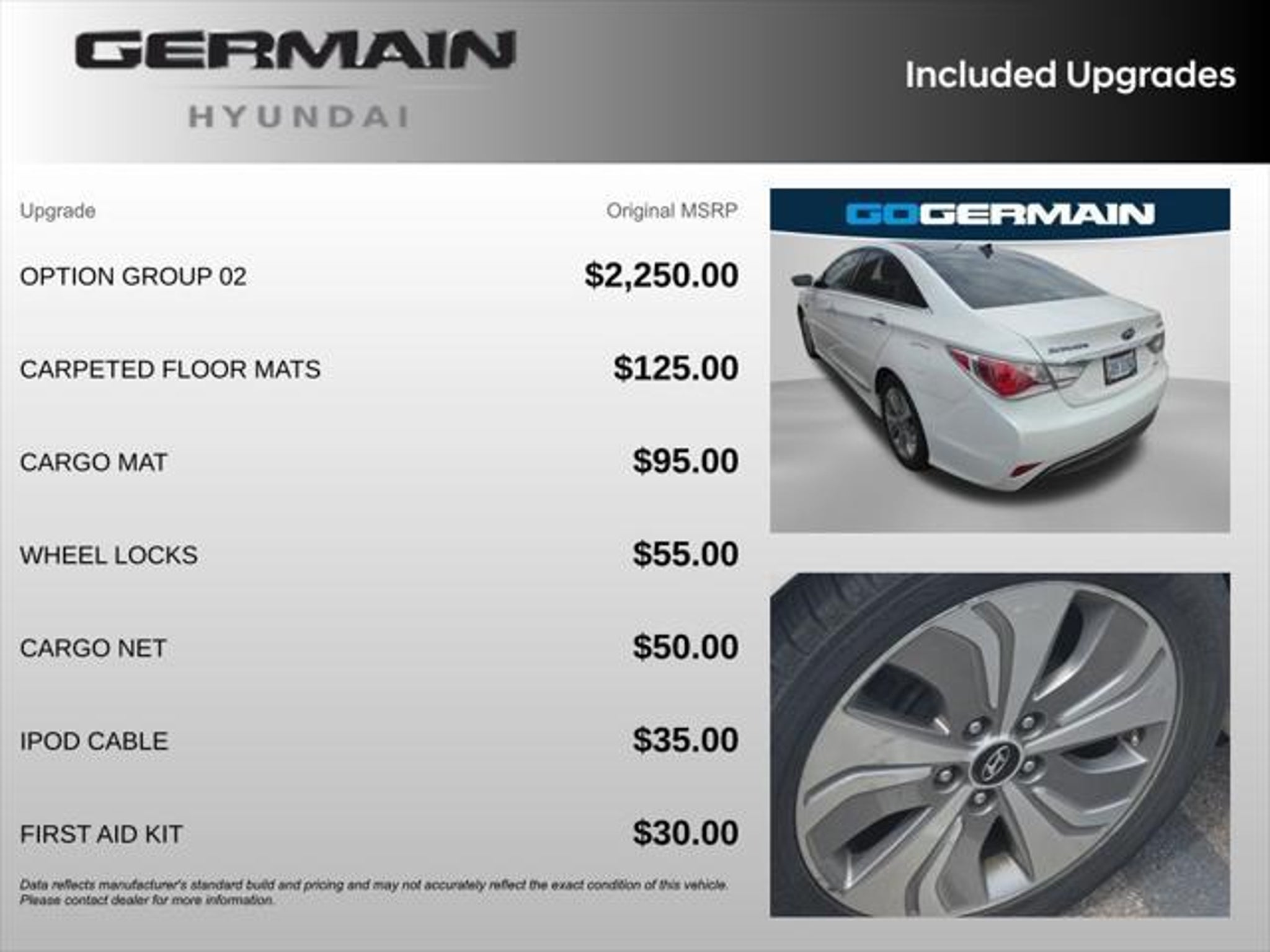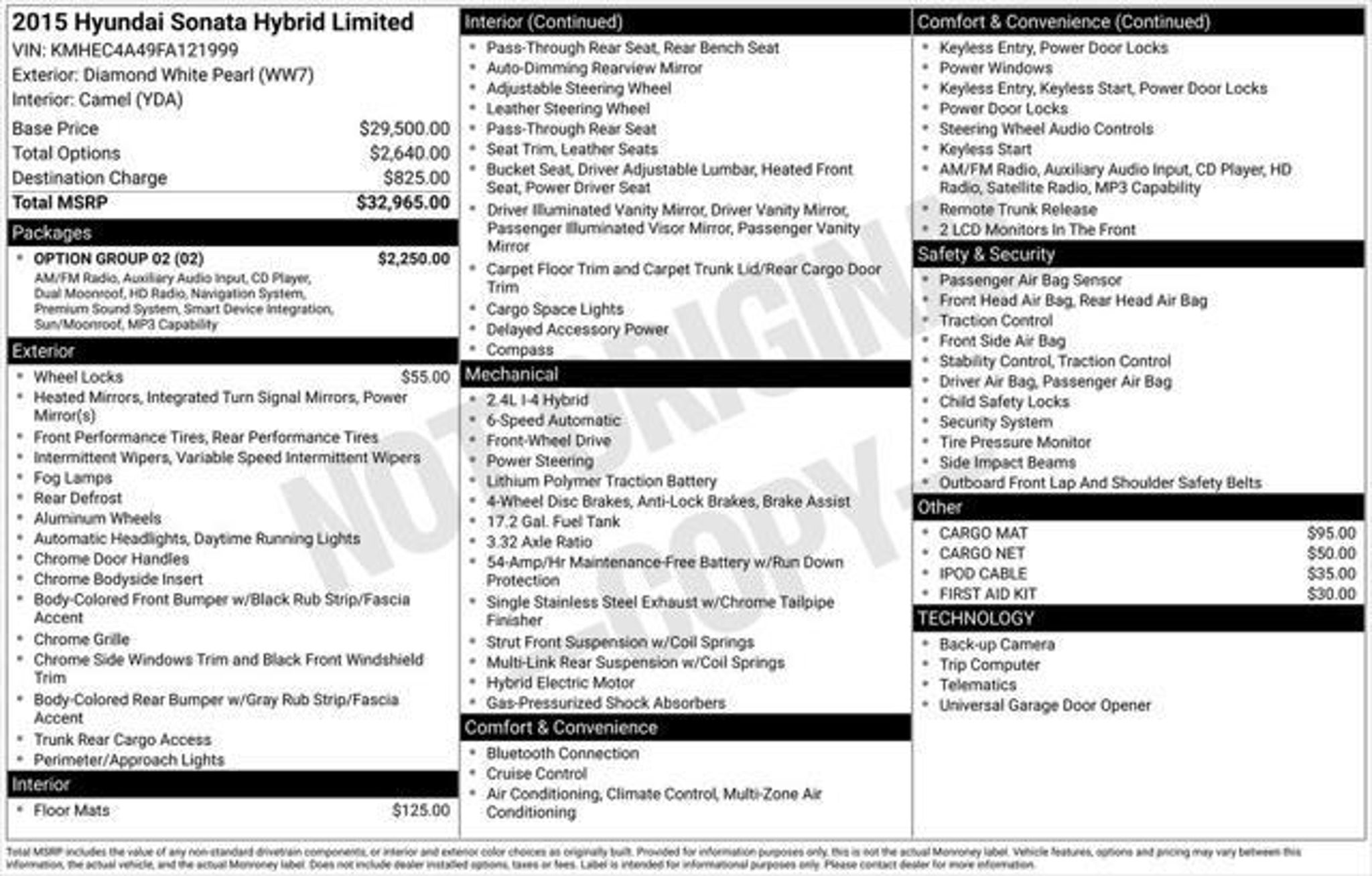 Details > 2015 Hyundai Sonata Hybrid Limited 4DR Sedan For Sale in Columbus, OH Private Party Sellers Click here to place your ad now! You auta tell them you saw the ad in AutaBuy when you call or email. 1/16 2/16 3/16 4/16 5/16 6/16 7/16 8/16 9/16 10/16 11/16 12/16 13/16 14/16 15/16 16/16 View 16 Photos View All Add to My Garage Parked in Your Garage! Germain Hyundai Contact Seller: I would like to: Make Offer Check Availability Ask A Question Request More Photos Check Financing Options Send a copy of this message to me Add this listing to my garage Send to Mobile Mileage 97,690 Exterior Color Diamond White Pearl Interior Color Camel Doors 4 Engine 2.4L I4 Transmission 6 Speed Auto Stock # HPFA121999 VIN KMHEC4A49FA121999 Estimated Monthly Payment $161 mo Apply Now J.J. Best Banc & Co. 2015 Hyundai Sonata Hybrid Limited 4DR Sedan Description: Germain Hyundai · Mileage: 97,690 · Color: Diamond White Pearl Price: $9,267. Mileage 97,690 Exterior Color Diamond White Pearl Interior Color Camel Doors 4 Engine 2.4L I4 Transmission 6 Speed Auto Stock # HPFA121999 VIN KMHEC4A49FA121999 Estimated Monthly Payment $161 mo Apply Now J.J. Best Banc & Co. Add to My Garage Parked in Your Garage! Message Seller Germain Hyundai Contact Seller: I would like to: Make Offer Check Availability Ask A Question Request More Photos Check Financing Options Send a copy of this message to me Add this listing to my garage Offered for sale by Germain Hyundai COLUMBUS, OH Price: $9,267. Offered for sale by Germain Hyundai COLUMBUS, OH [entire inventory] Ask Auta Intelligence The first collector-car AI built directly into a classic car marketplace What kind of mileage do these get? What does this VIN number tell me? What trim levels were available for this model? Tell me the history on this model Where is this located? What engine options did these come with? What colors did these come in? Can you show me more electric/hybrid for a similar price? How many of these were produced? What factory options were available on this model? How many Sonata Hybrids were produced in White? How far is this from me? How easy are parts to find for this model? When was this model first introduced? What transmission options did these offer? Do you have a similar car to sell? List It Now! Questions about this car? Ask Auta Intelligence for production numbers, available options, etc. · Subscribe to AutaBuy! · Send a Gift Subscription Notice to a Friend