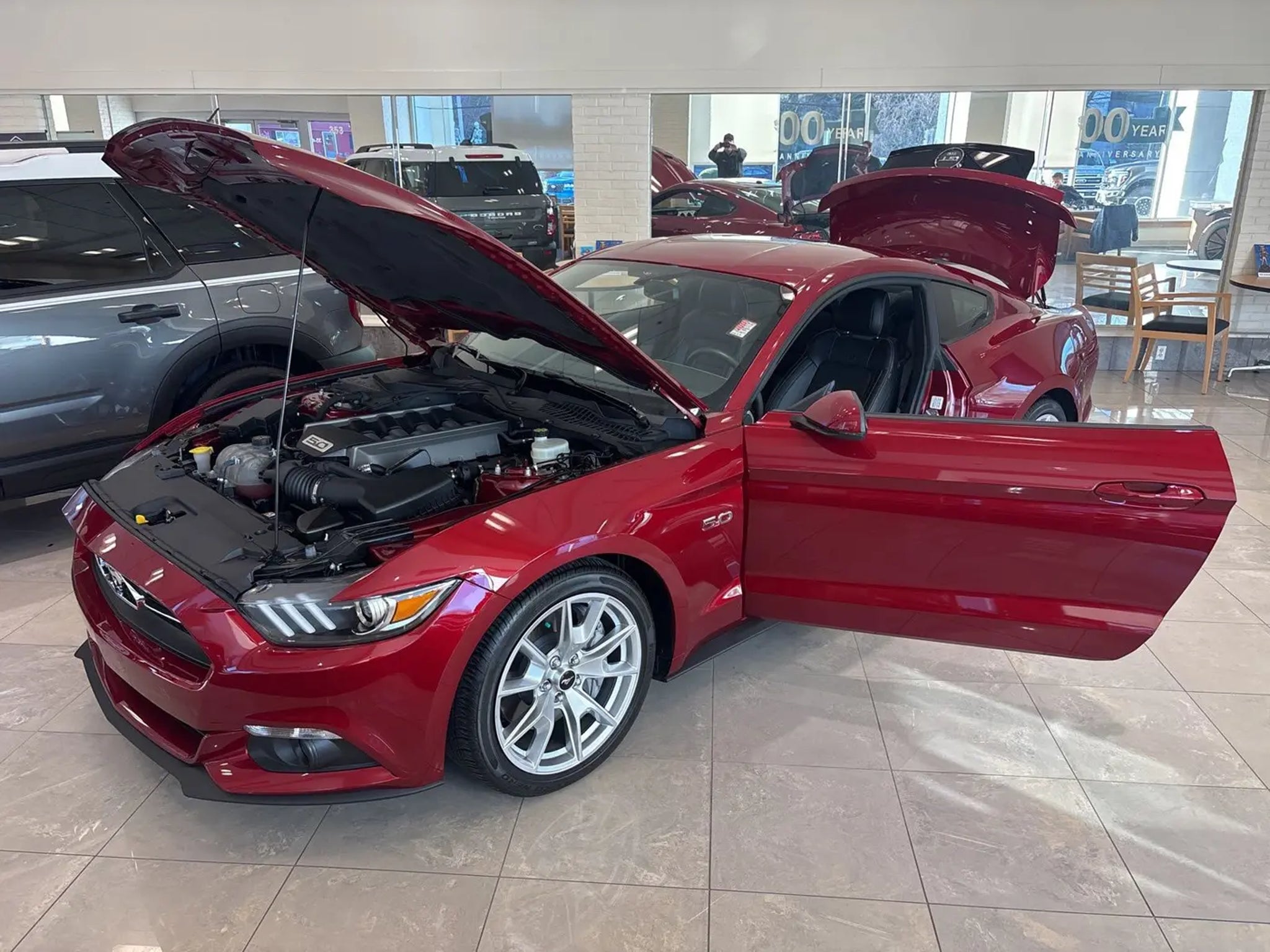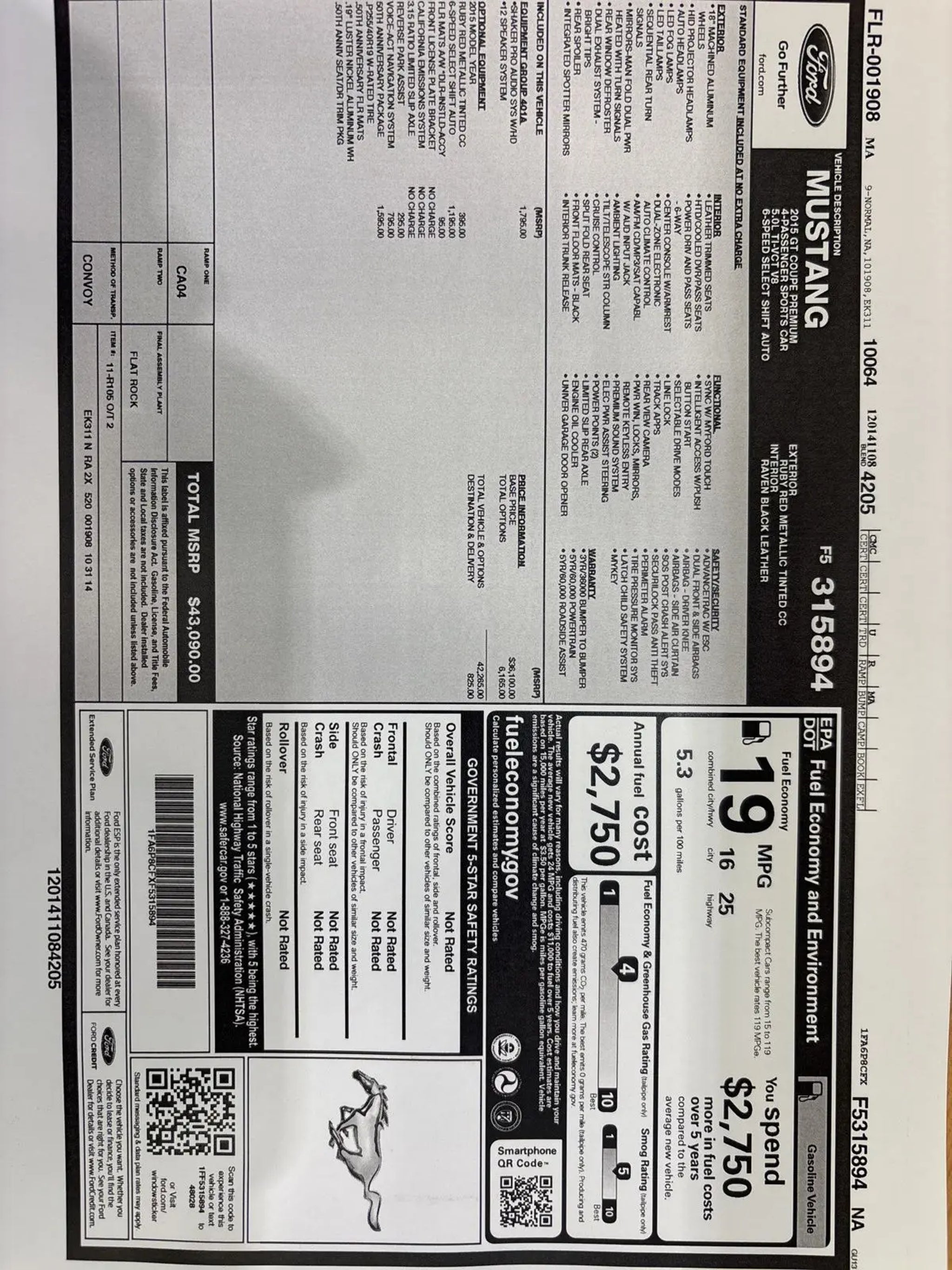 ONE OWNER 2216 ORIGINAL MILES! Ruby Red Metallic Tinted Clearcoat 2015 Ford Mustang GT Premium RWD 6-Speed Automatic with Select-Shift 5.0L V8 Ti-VCT 50 Years Appearance Package, 50 Years Floor Mats, 50 Years Grille with Bright Surround, Axle Spin Aluminum Finish Instrument Panel, Blind Spot Info System w/Cross-Traffic Alert, Equipment Group 401A, HD Radio, Heated/Cooled Front Seats, Memory Driver Seat & Mirrors, Shaker Pro Audio System, Unique Leather Seating Surfaces, Wheels: 19 x 8.5 Luster Nickel Premium Painted. Recent Arrival! Awards: * 2015 KBB.com Brand Image Awards * 2015 KBB.com 10 Coolest New Cars * 2015 KBB.com Our 10 Favorite New-for-2015 Cars * 2015 KBB.com Best Buy Awards Finalist