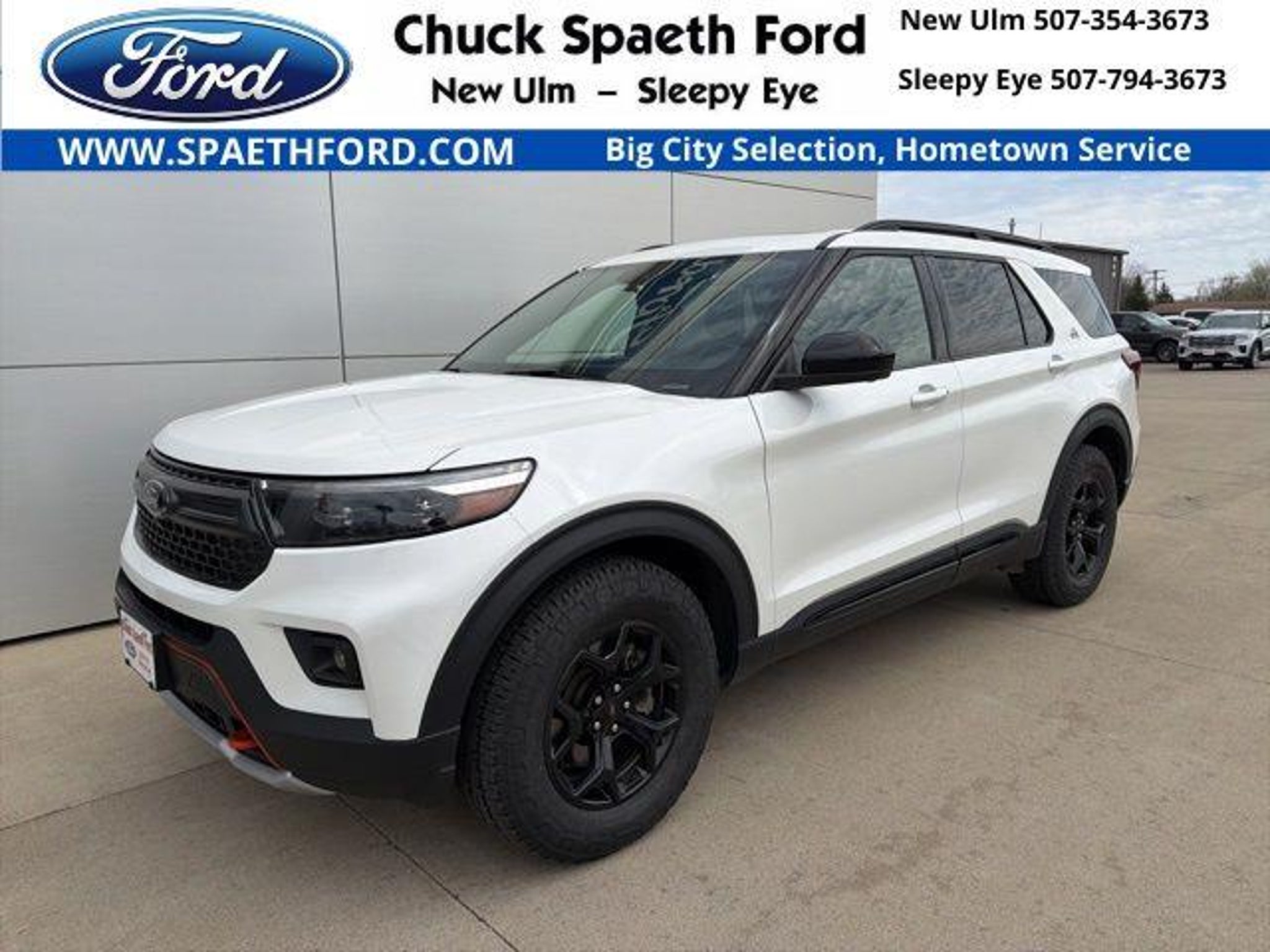 One Owner, Local Trade, 4X4, Navigation System, Backup Camera, Remote Start, Sunroof/Moonroof, Adaptive Cruise Control, BLIS Blind Spot Info System, Leather Seats, Heat Package, Multi-Zone Climate Control, Tow Package, 3rd Row Seats, Bluetooth, Memory Package, Power Mirror Package, 4WD, 110V/150W AC Power Outlet, 3rd Row PowerFold Seat, Auto-Dimming Interior Rear-View Mirror, Equipment Group 800A, FordPass Connect, Navigation System, Power Liftgate, Radio: B&O Sound System by Bang & Olufsen, Sideview Mirrors w/Gloss Black Caps, SYNC 3 Communications & Entertainment System, Timberline Technology Package, Twin Panel Moonroof, Universal Garage Door Opener (UGDO), Wireless Charging Pad. Recent Arrival! Certified. 2022 Ford Explorer Timberline 4WD Star White Metallic Tri-Coat Odometer is 5401 miles below market average! Ford Gold Certified Details: * Warranty Deductible: $100 * Powertrain Limited Warranty: 84 Month/100,000 Mile (whichever comes first) from original in-service date * Roadside Assistance * Vehicle History * 172 Point Inspection * and 22,000 FordPass Rewards Points to use toward first two maintenance visits * Transferable Warranty * Limited Warranty: 12 Month/12,000 Mile (whichever comes first) after new car warranty expires or from certified purchase date If you are interested in this or any of our vehicles, please contact us at one of our two locations, in Sleepy Eye 507-794-3673 or New Ulm 507-354-3673.