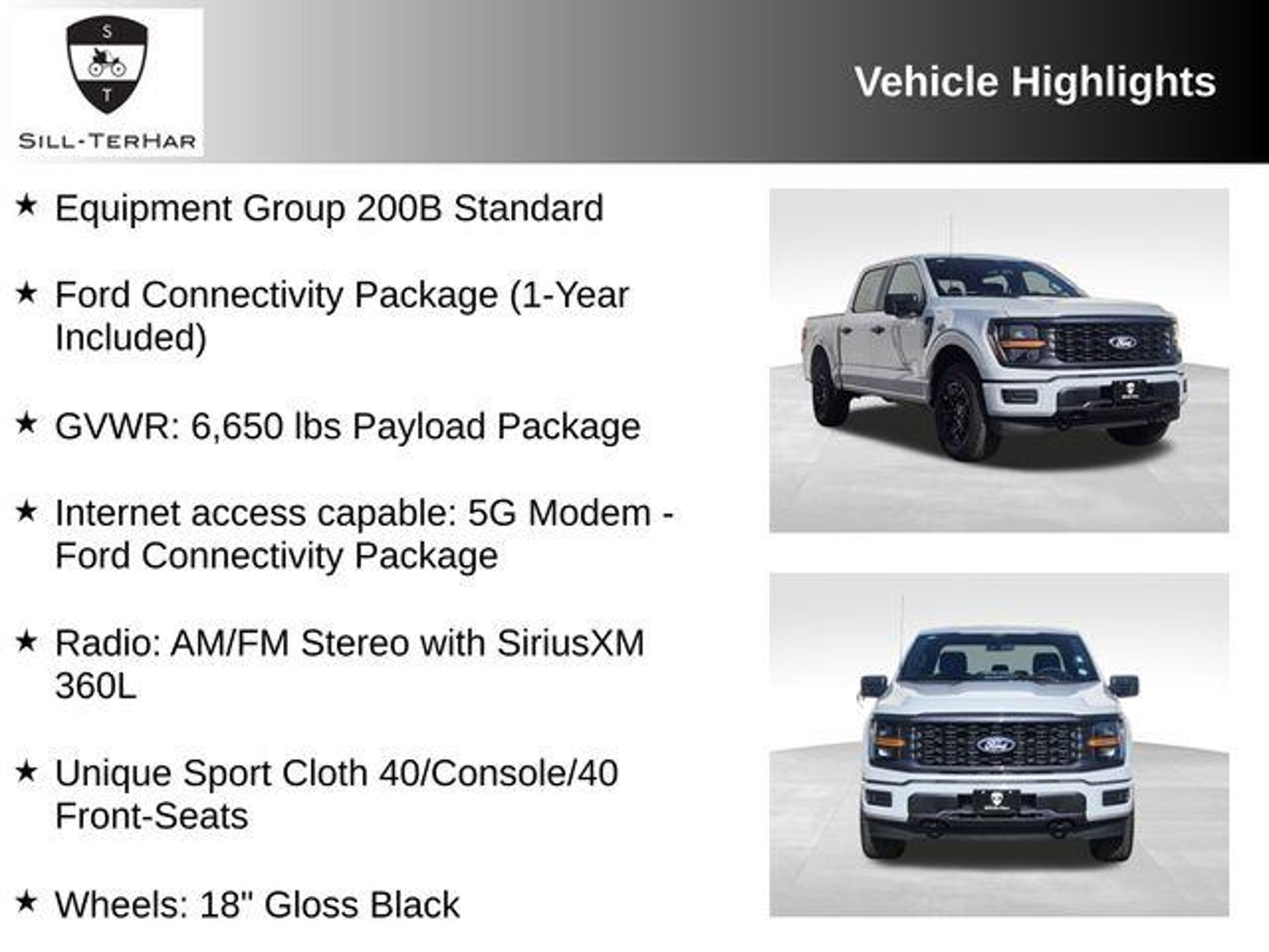 Discover the exceptional 2026 Ford F-150 STX, a true standout in the world of pickup trucks. With its striking Gray exterior and a robust 2.7L V6 EcoBoost engine paired with a 10-Speed Automatic transmission and 4WD, this vehicle is engineered to deliver exceptional performance and capability. - This F-150 is rare, featuring a unique Sport Cloth 40/Console/40 Front-Seats and 18 Gloss Black Wheels. - The Ford Connectivity Package with 5G Modem provides seamless internet access, while the SYNC 4 with Enhanced Voice Recognition keeps you connected and in control. - Enjoy the convenience of the GVWR: 6,650 lbs Payload Package, ensuring you can tackle any task with confidence. - The Radio: AM/FM Stereo with SiriusXM 360L provides endless entertainment options, while the 3.55 Axle Ratio enhances the vehicle's overall performance. This F-150 STX is more than just a pickup; it's a testament to Ford's commitment to innovation and quality. With an exceptional city fuel economy of 18 MPG and a highway rating of 24 MPG, it strikes the perfect balance between power and efficiency. Discover the confidence and capability that the 2026 Ford F-150 STX can bring to your driving experience. Schedule a test drive today and see for yourself why this vehicle is a true standout in its class.