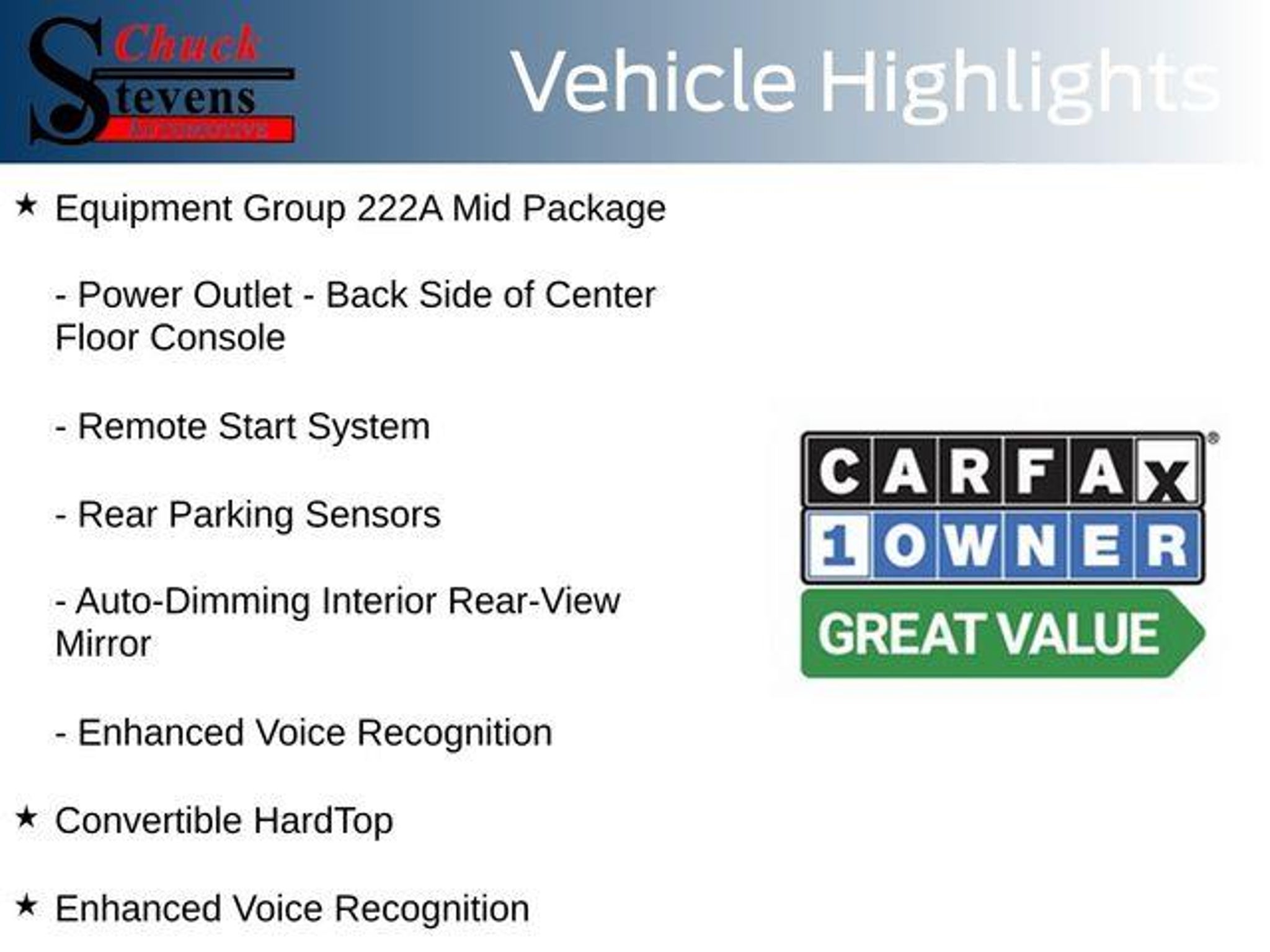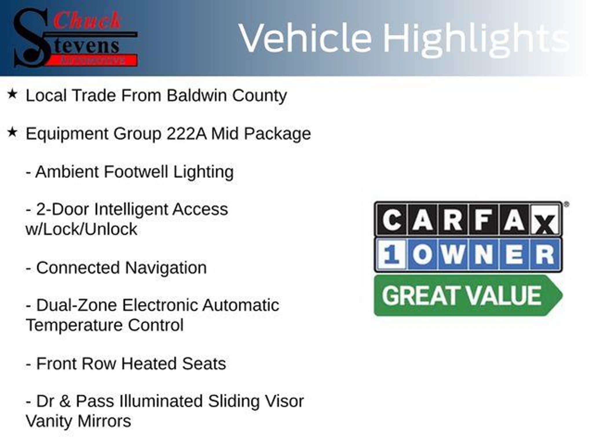 Welcome to Chuck Stevens Ford, located at 1304 HWY 31 South, Bay Minette, Alabama. We are proud to celebrate 25 Years of serving our community as one of the fastest-growing Ford dealers in the Southeast. Our goal is to make your shopping experience transparent, easy, and enjoyable. Every Pre-Owned and Certified vehicle at Chuck Stevens Ford has been fully inspected and reconditioned by a certified technician, giving you confidence in your purchase. Take advantage of our low-price guarantee on this 2023 Ford Bronco. This Bronco comes finished in Velocity Blue Metallic with a Dark Gray W/Black Onyx interior, making it a superb choice for your next vehicle. At Chuck Stevens Ford, we also include our exclusive Lifetime Powertrain Warranty at no additional cost. No gimmicks, no fine print, and serviceable at any certified repair facility nationwide. The online price includes a $2,500 Cash Down or trade equity. To qualify, customers must trade in a vehicle with a minimum appraised value of $2,500 or Cash Down. All prices reflect dealership financing and include a $1,000 finance coupon. See dealer for full details. . CARFAX One-Owner. Recent Arrival! 2023 Ford Bronco Big Bend 2D Sport Utility Big Bend Velocity Blue Metallic 4WD 2.3L EcoBoost I-4 10-Speed Automatic Local Trade From Baldwin County, 2-Door Intelligent Access w/Lock/Unlock, ABS brakes, AM/FM radio: SiriusXM with 360L, Ambient Footwell Lighting, Auto-Dimming Interior Rear-View Mirror, Compass, Connected Navigation, Convertible HardTop, Dr & Pass Illuminated Sliding Visor Vanity Mirrors, Dual-Zone Electronic Automatic Temperature Control, Electronic Stability Control, Emergency communication system: 911 Assist, Enhanced Voice Recognition, Equipment Group 222A Mid Package, Exterior Parking Camera Rear, Front Row Heated Seats, Heated door mirrors, Illuminated entry, Low tire pressure warning, Power Outlet - Back Side of Center Floor Console, Rear Parking Sensors, Remote keyless entry, Remote Start System, Telescoping steering wheel, Tilt steering wheel, Towing Capability, Traction control, Wheels: 17 Carbonized Gray-Painted Aluminum. LIFETIME POWERTRAIN PROGRAM included at no additional charge for all vehicles that have less than 80,000 miles. It is one of the most comprehensive powertrain warranty programs in the market. See dealer for details. Please don't buy anywhere until you have us show you our deal.