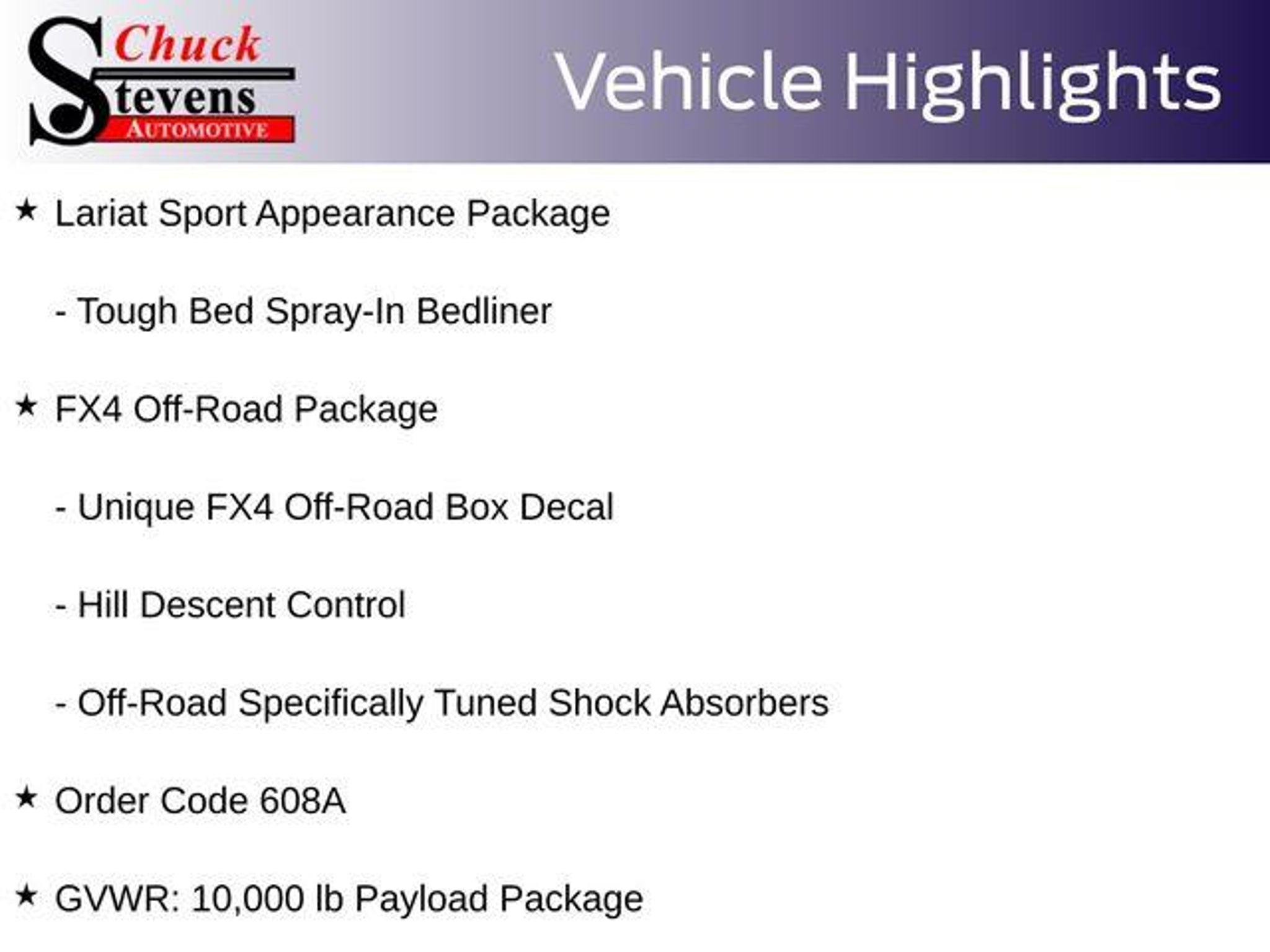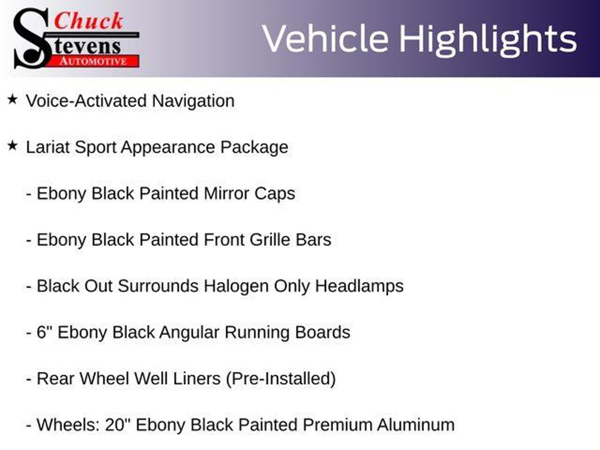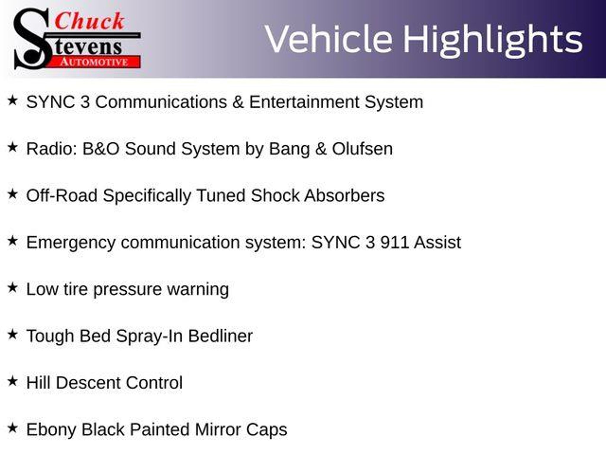 Welcome to Chuck Stevens Ford, located at 1304 HWY 31 South, Bay Minette, Alabama. We are proud to celebrate 25 Years of serving our community. Every Pre-Owned and Certified vehicle at Chuck Stevens Ford has been fully inspected and reconditioned by a certified technician, giving you confidence in your purchase. - Lariat Sport Appearance Package - FX4 Off-Road Package - Voice-Activated Navigation - Tough Bed Spray-In Bedliner - Off-Road Specifically Tuned Shock Absorbers - 6 Ebony Black Angular Running Boards - Black Out Surrounds Halogen Only Headlamps - Ebony Black Painted Front Grille Bars - Ebony Black Painted Mirror Caps - Rear Wheel Well Liners (Pre-Installed) - Unique FX4 Off-Road Box Decal - 110V/400W Outlet - Hill Descent Control - Emergency communication system: SYNC 3 911 Assist - Low tire pressure warning - Alloy wheels - Wheels: 20 Ebony Black Painted Premium Aluminum Take advantage of our low-price guarantee on this 2019 Ford F-250SD Lariat. This powerful truck comes finished in Black with a stylish interior, making it a wonderful choice for your next vehicle. Underneath the hood, you'll find the impressive Power Stroke 6.7L V8 DI 32V OHV Turbodiesel engine, paired with a TorqShift 6-Speed Automatic transmission and 4WD capabilities. This powertrain delivers exceptional towing and hauling performance, while also providing impressive fuel efficiency. The Lariat trim level adds a wealth of premium features, including the LARIAT VALUE PACKAGE with Memory Power-Adjustable Pedals, Power Heated/Cooled Seats, Remote Start, and more. The FX4 OFF-ROAD PACKAGE further enhances the truck's capabilities with Hill Descent Control, Skid Plates, and Specialized Shock Absorbers. For your convenience, this F-250SD Lariat is equipped with the VOICE-ACTIVATED NAVIGATION system, as well as the UPFITTER SWITCHES and UNIVERSAL GARAGE DOOR OPENER. The REAR CHMSL CAMERA provides added visibility and safety when maneuvering. At Chuck Stevens Ford, we also include our exclusive Lifetime Powertrain Warranty at no additional cost. Serviceable at any certified repair facility nationwide. The online price includes a $2,500 Cash Down or trade equity. To qualify, customers must trade in a vehicle with a minimum appraised value of $2,500 or Cash Down. All prices reflect dealership financing and include a $1,000 finance coupon. LIFETIME POWERTRAIN PROGRAM included at no additional charge for all vehicles that have less than 80,000 miles. It is one of the most comprehensive powertrain warranty programs in the marke