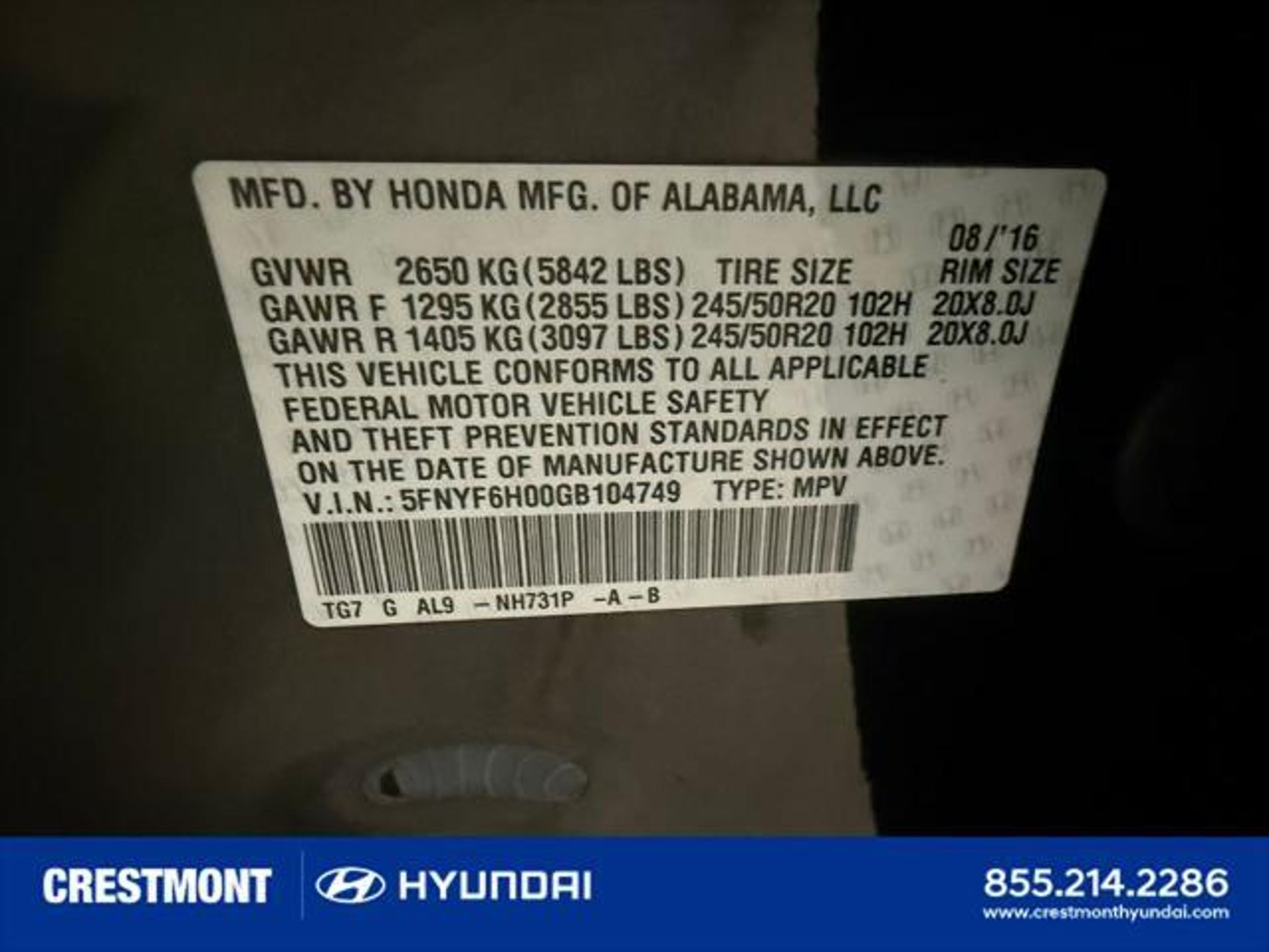 5FNYF6H00GB104749 |
