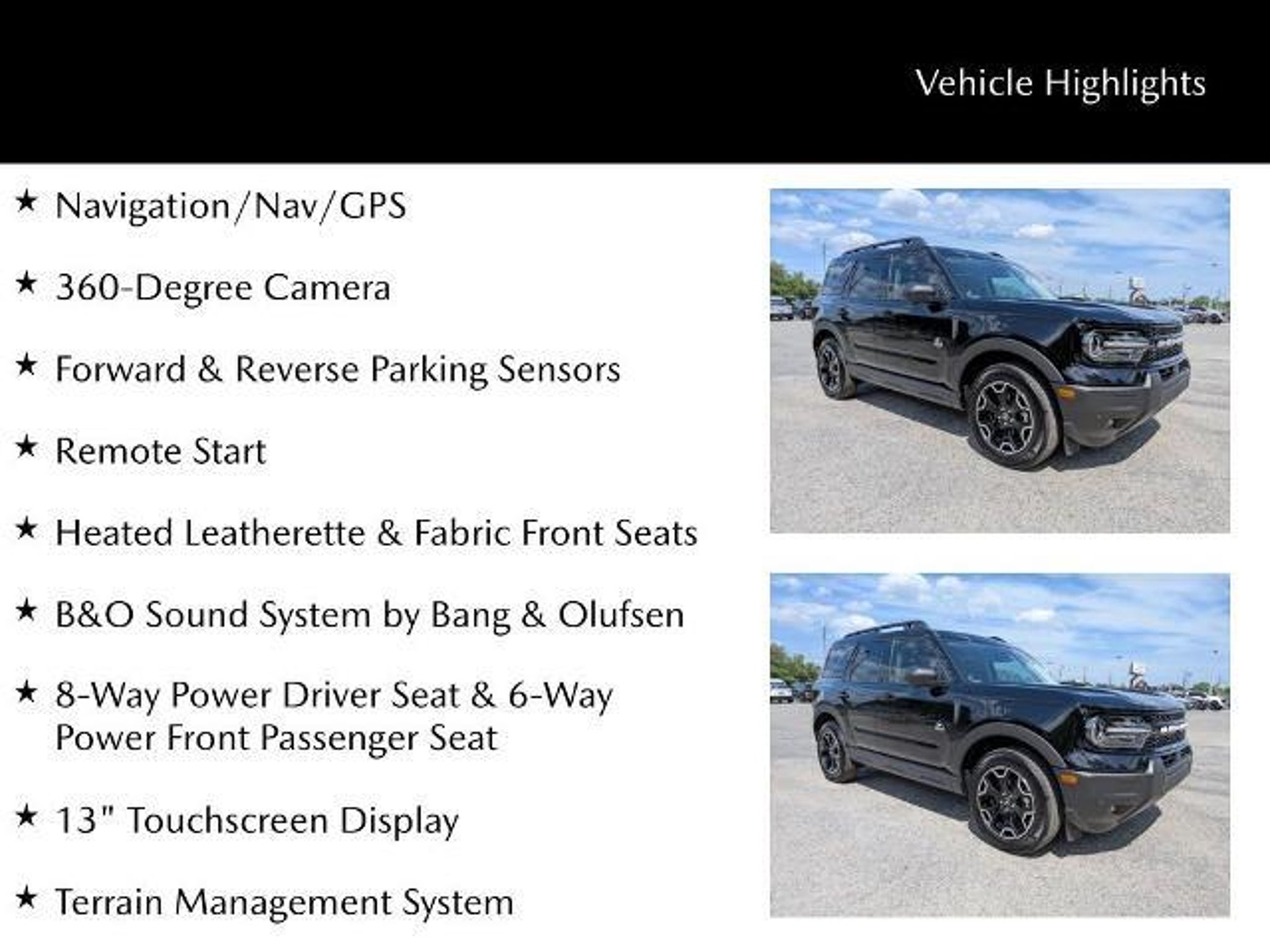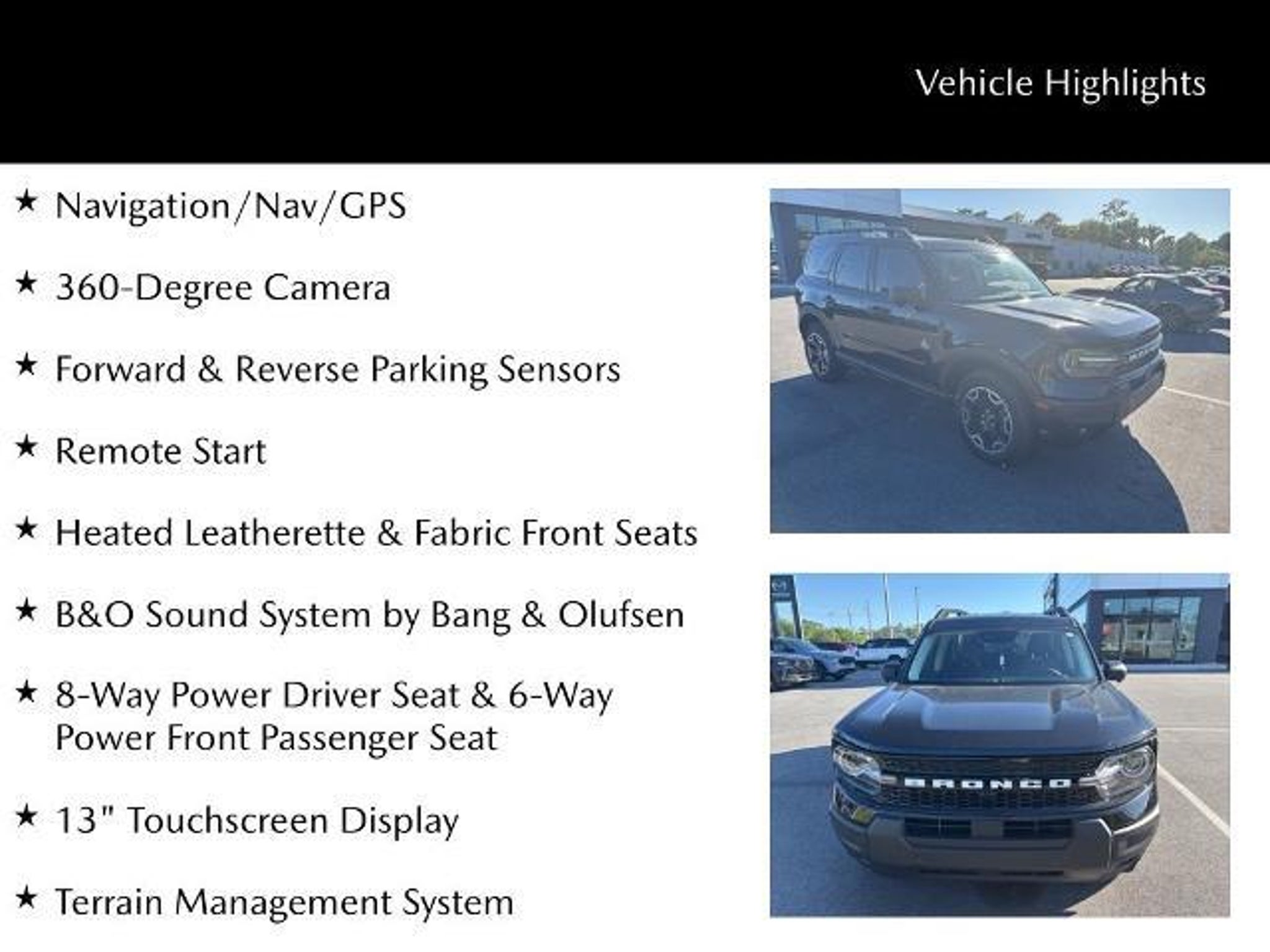 Refined styling meets everyday versatility in this 2025 Ford Bronco Sport Outer Banks (VIN 3FMCR9CN4SRE04299) with just 15,398 miles, offering a well-equipped SUV that blends comfort, technology, and capability. On the exterior, 18-inch machined face black aluminum wheels, LED headlamps, and LED fog lamps give it a modern, confident look while enhancing visibility in varying conditions. The Terrain Management System adds adaptability, helping you handle different road surfaces with ease. Inside, the cabin is designed for comfort and convenience with heated leatherette and fabric front seats, a heated steering wheel, and remote start?making it ready for any season. Technology is front and center with a large 13-inch touchscreen that keeps controls and connectivity within easy reach, along with a backup camera for added confidence when reversing. The Outer Banks Tech Package elevates the experience with built-in navigation and a B&O sound system, delivering premium audio quality and seamless guidance on every drive. With its low mileage, upscale features, and practical capability, this Bronco Sport Outer Banks is ready to handle your daily routine and weekend plans with style and confidence. ***ONE PREVIOUS OWNER*** Heated Leatherette & Fabric Front Seats, 8-Way Power Driver Seat & 6-Way Power Front Passenger Seat, Navigation/Nav/GPS, 360-Degree Camera, Forward & Reverse Parking Sensors, Remote Start, 172 Point Inspection completed by our Factory Certified & ASC Trained Technicians, Recent Oil Change, Vehicle Detailed, 18 Ebony Black-Painted Aluminum Wheels, B&O Sound System by Bang & Olufsen, 13 Touchscreen Display, Terrain Management System, Heated Premium Wrapped Steering Wheel, Equipment Group 300A, Garage Door Transmitter, Outer Banks Tech Package, Rain Sensing Wipers, Speed Control, SYNC 4 w/Enhanced Voice Recognition. Savannah, GA ? J.C. Lewis Mazda Smart Choices Start Here At J.C. Lewis Mazda, we know today?s drivers are informed, connected, and always looking for smart value. That?s why we include over 20 high-resolution photos and a full walkaround video with every vehicle ? so you can evaluate the details before ever stepping on the lot. Whether you?re a tech-forward professional, a college student, or simply someone who appreciates smart engineering, Mazda delivers the perfect balance of innovation, efficiency, and driving enjoyment. We?ll gladly provide a complimentary AutoCheck or CARFAX report for full transparency. Visit us at 10101 Abercorn St in Savannah, GA