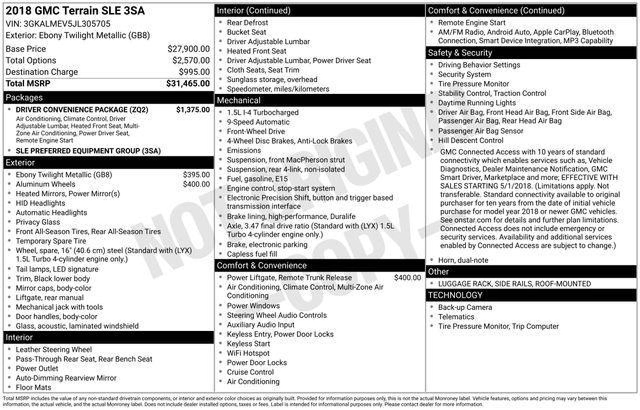 Discover the perfect blend of style, performance, and versatility in this 2018 GMC Terrain SLE. This exceptional SUV is ready to elevate your driving experience with its impressive array of features and capabilities. - 3 Month / 4,000 Mile Comprehensive Warranty - 5 Day Return / 30 Day Exchange - Auto Rewards Program - Great Service History - Local Trade - Triton Certified Classic Vehicle - Ebony Twilight Metallic Exterior - 18 Silver Painted Aluminum Wheels - Power Programmable Rear Liftgate - Driver Convenience Package Slip into the driver's seat and discover the Terrain's refined interior, complete with premium cloth upholstery, dual-zone automatic climate control, and an 8-way power-adjustable driver's seat with lumbar support. Stay connected with the intuitive 7-inch GMC Infotainment System, featuring Apple CarPlay and Android Auto integration, as well as Bluetooth connectivity for hands-free calling. This Terrain is more than just a stylish SUV "“ it's a true performer. The 1.5L DOHC engine, paired with a 9-speed automatic transmission, delivers an impressive 26 city / 30 highway mpg, making it both efficient and responsive on the road. With available all-wheel drive and a well-tuned suspension, you'll enjoy a confident and comfortable ride, no matter the conditions. Certified by Triton, this 2018 GMC Terrain SLE has undergone a comprehensive inspection and reconditioning process, ensuring it meets the highest standards of quality and reliability. With a great service history and low mileage, this Terrain is ready to provide years of dependable service. Experience the perfect blend of style, technology, and performance in this exceptional 2018 GMC Terrain SLE. Visit our showroom today and let us demonstrate how this versatile SUV can enhance your driving experience.