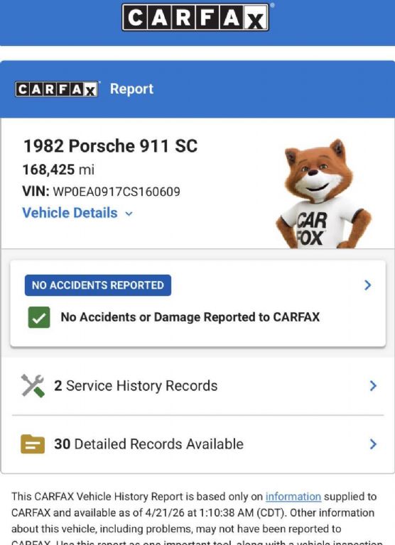 Details > 1982 Porsche 911 For Sale in Monterey, CA Private Party Sellers Click here to place your ad now! You auta tell them you saw the ad in AutaBuy when you call or email. 1/100 2/100 3/100 4/100 5/100 6/100 7/100 8/100 9/100 10/100 11/100 12/100 13/100 14/100 15/100 16/100 17/100 18/100 19/100 20/100 21/100 22/100 23/100 24/100 25/100 26/100 27/100 28/100 29/100 30/100 31/100 32/100 33/100 34/100 35/100 36/100 37/100 38/100 39/100 40/100 41/100 42/100 43/100 44/100 45/100 46/100 47/100 48/100 49/100 50/100 51/100 52/100 53/100 54/100 55/100 56/100 57/100 58/100 59/100 60/100 61/100 62/100 63/100 64/100 65/100 66/100 67/100 68/100 69/100 70/100 71/100 72/100 73/100 74/100 75/100 76/100 77/100 78/100 79/100 80/100 81/100 82/100 83/100 84/100 85/100 86/100 87/100 88/100 89/100 90/100 91/100 92/100 93/100 94/100 95/100 96/100 97/100 98/100 99/100 100/100 View 100 Photos View All Add to My Garage Parked in Your Garage! Send to Mobile Mileage 174,285 Exterior Color Gray Stock # WA911 Ad ID 109019714 VIN WP0EA0917CS160609 Estimated Monthly Payment $957 mo Apply Now J.J. Best Banc & Co. 1982 Porsche 911 Description: · Mileage: 174,285 · Color: Gray Price: $55,000. Mileage 174,285 Exterior Color Gray Stock # WA911 Ad ID 109019714 VIN WP0EA0917CS160609 Estimated Monthly Payment $957 mo Apply Now J.J. Best Banc & Co. Add to My Garage Parked in Your Garage! Call Seller Offered for sale by Dodi Auto Sales Call 831-596-8216 MONTEREY, CA Mention OldCar.com when you call. Price: $55,000. Offered for sale by Dodi Auto Sales Call 831-596-8216 MONTEREY, CA Mention OldCar.com when you call. [entire inventory] Ask Auta Intelligence The first collector-car AI built directly into a classic car marketplace How many of these were produced? What does this VIN number tell me? What's the typical 0-60 time for this configuration? Can you show me more cars for a similar price? How far is this from me? What engine options did these come with? What trim levels were available for this model? When was this model first introduced? How many 911s were produced in Gray? How much horsepower does this have? What makes this model year special? Which years was this body style produced? What nicknames does this model have? What makes this model desirable to enthusiasts? What's the typical 1/4 mile time for this setup? Which engines were most common for this year? Tell me about this model What movies featured cars like this? What transmission options did these offer? What makes this model desirable to enthusiasts? What factory options were available on this model? What colors did these come in? Where is this located? Do you have a similar car to sell? List It Now! Questions about this car? Ask Auta Intelligence for production numbers, available options, etc. · Subscribe to AutaBuy! · Send a Gift Subscription Notice to a Friend