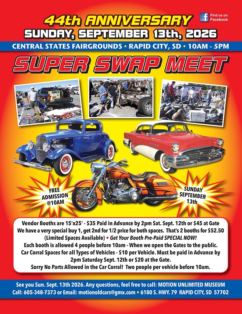 SUNDAY SEPT. 13, 2026. MARK YOUR CALENDARS! DATE FOR OUR 44th ANNUAL BLACK HILLS SUPER SWAP MEET AND CAR CORRAL DATE IS SET: