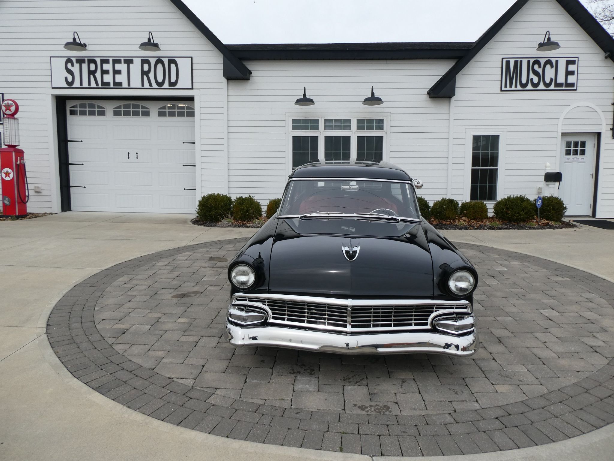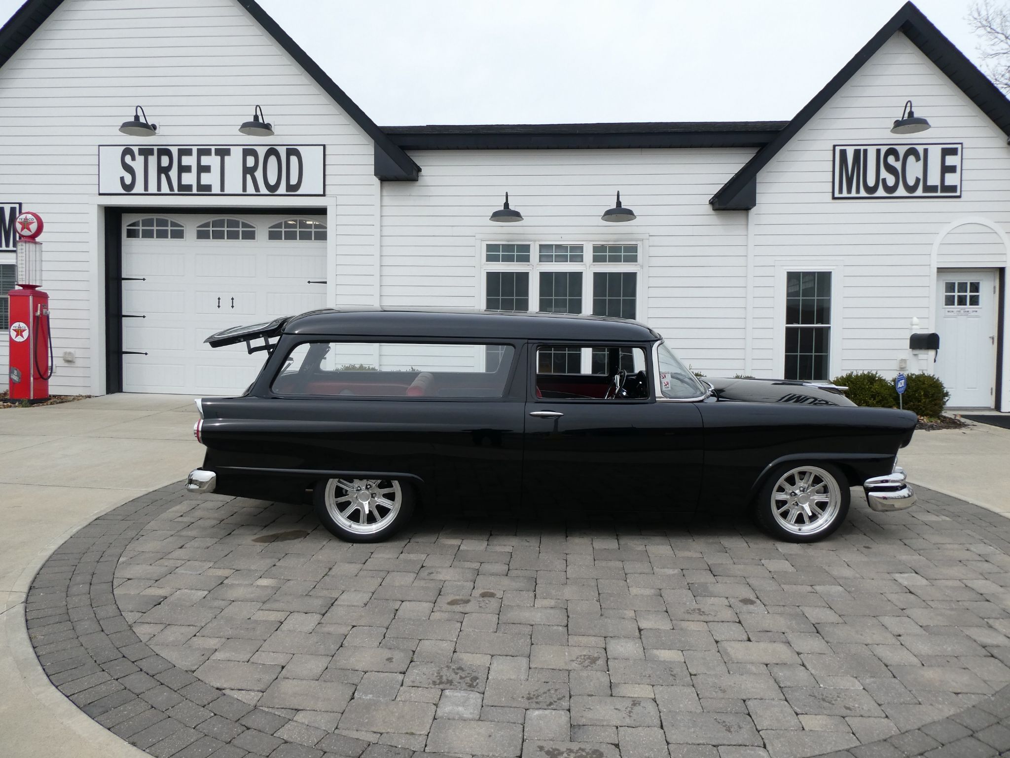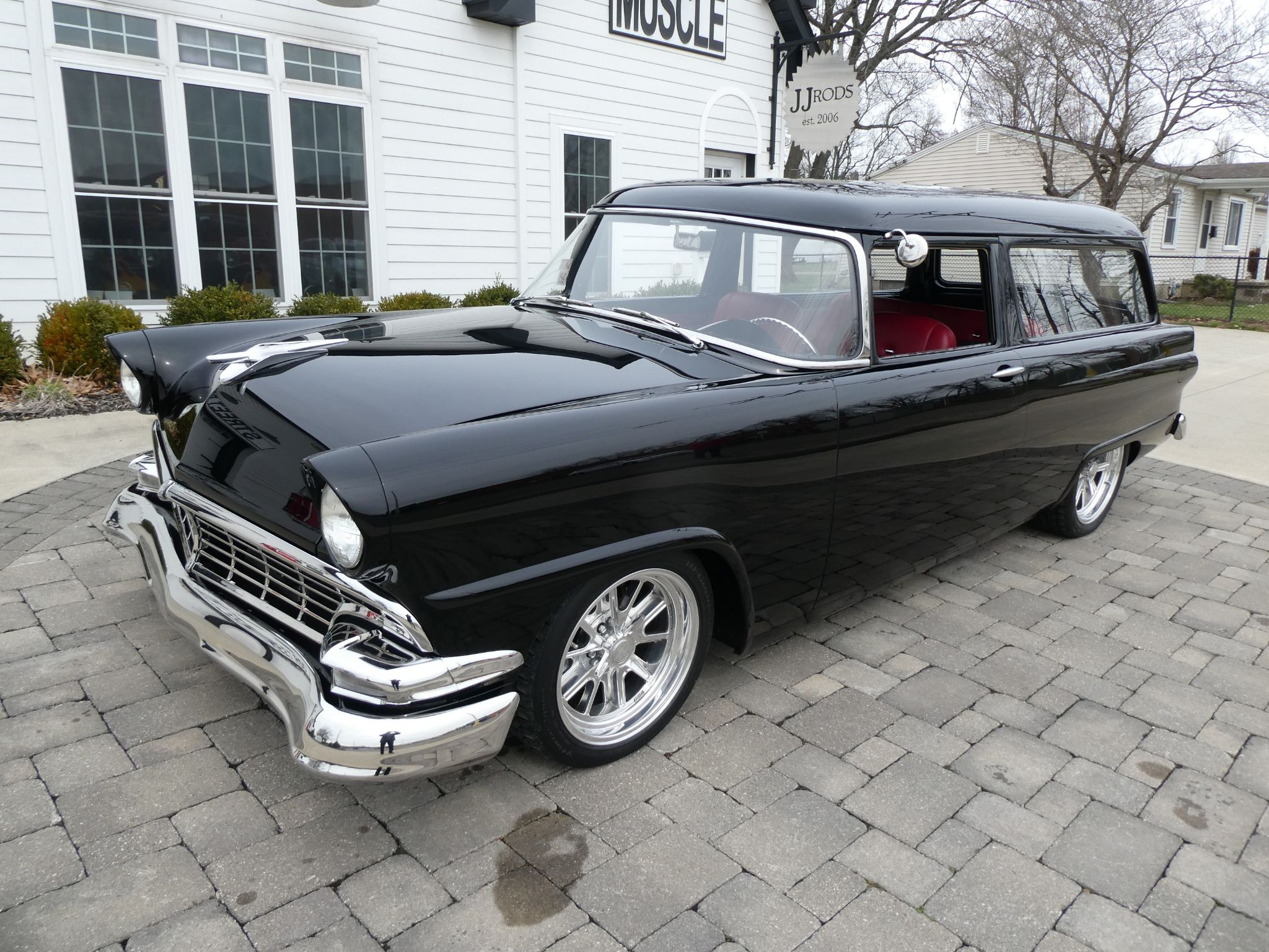 Check out this 1956 Ford Ranch Wagon - Multiple National Award Winner, built by Creative Rod & Kustom. The Wagon was a frame off build. The drive train is a GM Ramjet 350 V-8 crate motor, 425 HP with 6,362 miles. Dressed up nicely with custom valve covers. Transmission is a 700R4 automatic with Gear Star overdrive, mated to a Currie Ford 9" rear end - 373 posi. A full complement of modern components was used, including Fat Man suspension, A billet Specialties serpentine system, and Sanderson headers with a custom Magnaflow 2 1/4' stainless exhaust. Independent coil springs, Mustang II front suspension, diagonal link custom rear suspension, wheelbase 115.5'. Wagon is equipped with power disc brakes and power steering. Wagon runs cool with a new Griffin Aluminum radiator, and it drives and stops like a new car.