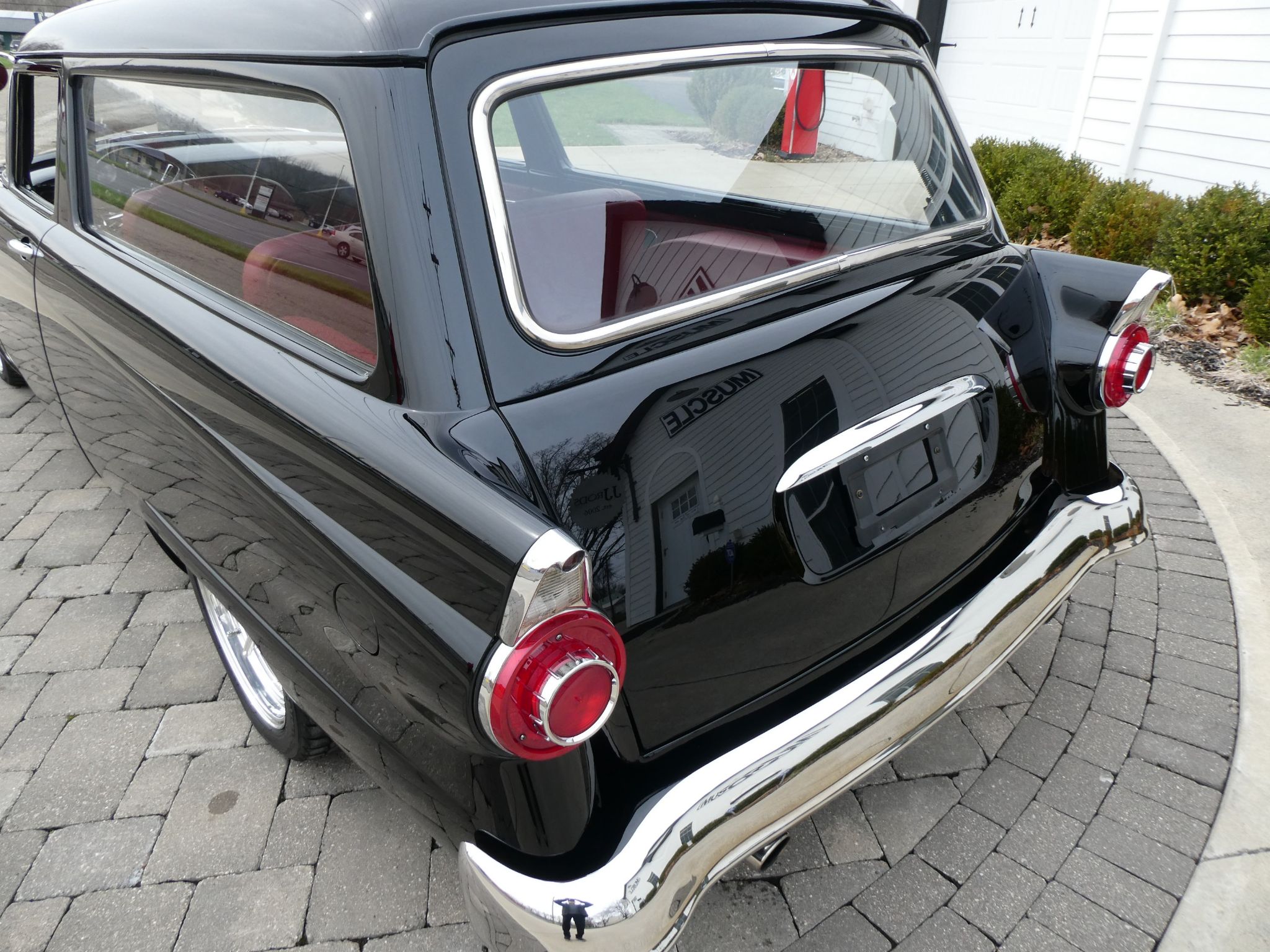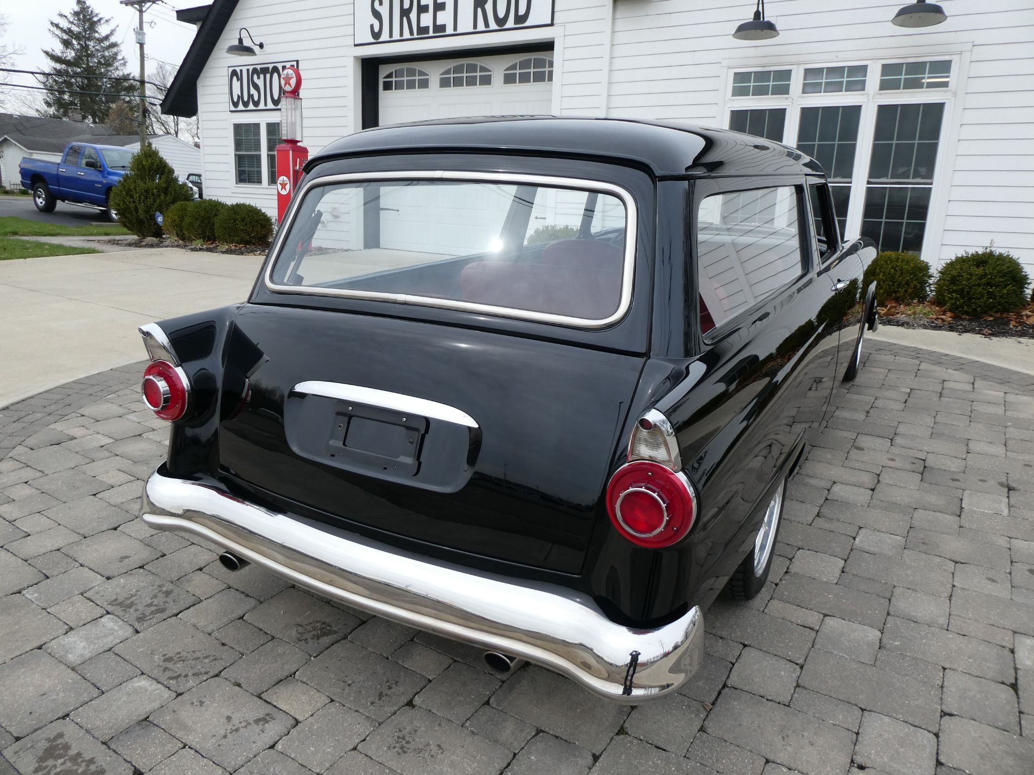 The interior is tastefully finished in red leather by RP interiors. Power windows and door locks. Equipped with a Flaming River tilt and telescopic steering column. This wagon is equipped with Vintage air conditioning and heat. Aftermarket radio.