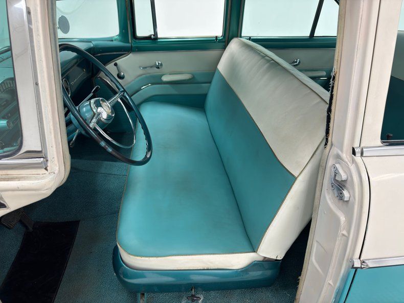 More excess in the form of attention to detail and use of multi colors from the same color way on the door panels. Using shades of cool green and white, the door panels have a curved streak stretching across them. All these curve and form areas for the door handle, door pull and window crank to shine, and they do very nicely. Speaking of shining, the sills are an eye catcher in the green. Slipping our eyes inside, we see front and rear benches stretching from door to door, and covered in white vinyl uppers and bolsters with blue green vinyl smooth inserts and lower backs. Fronting these luscious seats is a metal dash, in full restored style. A turquoise blue dash top and lowers matches the seats. A crescent gauge cluster has steel blue backgrounds, and just below a smattering of knobs and pulls. A blue/green bakelite big steering wheel fronts the dash, and in dash central are round temp slider panels, radio and a clock, not unlike the tail lighting and looking jet age fer sur. Blue carpeting floods the floors, and above is a tight blue headliner. Neato Man.
