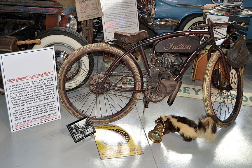 Late 1920's Indian Board Track Racer-Tribute. Production motorcycles, like this, were stripped down for Racing on a 2x4 split board track. Banked at 45-60 degrees, top speeds would reach 100 mph or better, depending on the cc's of the motor. The wood tracks splintered and many competitors would get shard's of wood stuck in their faces and boots. "Safety equipment" was nothing more then aviator leather head gear, high boots, googles and a leather jacket. Men were true "Dare Ddevils". This tribute motorcycle was displayed in the Mount Dora Museum of Speed, near Orlando, which closed August, 2019 after 20 years, when the 74 yr.old owner retired. (Some items in museum display not included). Bike: $4000. Call (352) 217-9868 or write classicdc@aol.com