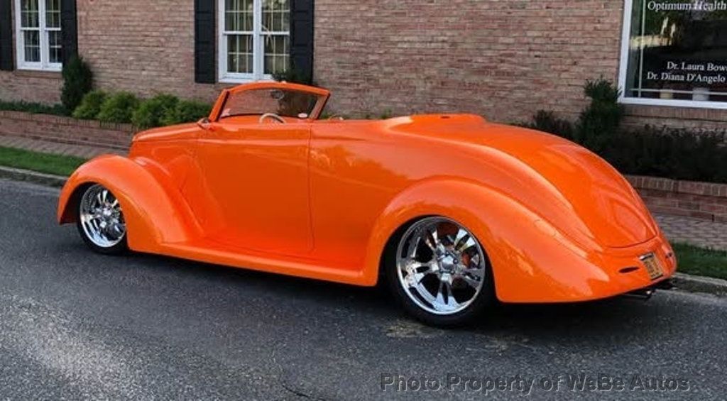 1937 Ford Roadster Convertible For Sale Built in 2005 and Only Driven 18k Miles 350 LT1 Police Interceptor Motor With Flat Top Pistons and Over 335hpCrate Motor With Cast Iron Heads Vintage Air Conditioning Headers Leading To Dual Exhaust With Polished 40 Series Flowmasters Ceramic Coated Exhaust System With Megs Chrome Tips 650 Edelbrock Carburetor On Chromed Intake Manifold Mild Aftermarket Cam All Engine Accessories Chromed Or Polished One-Off Engine Cover/Air Intake MSD Electronic Ignition System PRC Aluminum Radiator With Electric Fan (Never Runs Hot Even When Idling With Ac On) 700R4 Automatic Transmission With Overdrive Rock Valley Polished Stainless Steel Fuel Tank With External Electric Fuel Pump 4 Wheel Wilwood Power Disc Brakes With Polished Calipers With Integrated Rear E-Brakes Power Rack-N-Pinion Steering Billet Specialities 17 And 20 Wheels With Yokohama Tires Ford 9 Rear End With Double Adjustable Chrome Coil Overs Polished Stainless Steel 4 Bar Rear Suspension Heidts SuperRide IFS With Polished Stainless Steel A- Arms Chassis Custom Made By Downs. Boxed, Smoothed With Tubular Crossmembers Stainless Steel Fasteners Throughout Stainless Steel Gas Tank Forward Tilt Hood Hinges Power Four Wheel Disc Brakes Billet Specialties Rims 20 Back Tires And 17 Up Front Fiberglass Downs Body Painted Tangello Pearl By House Of Kolor Underside Of Body, Including Inside Fenders, Painted To Match Body Color 1937 Phaeton Fenders, Running Boards And Rocker Panels Cut And Rounded Door Corners Give It A Clean Look Flush Mounted Led Taillights And Third Brake Light Flush Mount Gas Cap Beautiful Chrome Accent Strips On Top Of Windshield And Along The Back Boot Power Windows Remote Entry Comfortable, Custom Full Leather Interior By Tri City Upholstery Is Near Perfect (Not Ultra Leather) Custom Hand Made Console And Wrap Around Dash Chromed Ididit Column With Half Wrapped Billet Steering Wheel VDO Gauges 8 Spoke Leather Wrapped Chrome Steering Wheel Chrome Tilt Steering Column Custom Stereo Power Trunk Sounds Fantastic Very Reliable This Is One Of A Kind, Highly Modified And Altered Downs Body. Mods Include Narrowing The Doors And Fabricating A Rocker Panel Joining The Quarter Panels And Cowl (Not Found On Other Bodies). Radiused And Smoothed Door Openings. Body Upper Panels Were Raised Creating A Straight Belt Line/top Seam. Stainless Trim On The Body Tops To Prevent Chaffing Of Roof On Painted Surfaces. A Downs Phantom Coupe Front End Was Used (Pinched Down About 2) That Gives The Car A Natural Raked Look Without Jacking Up The Rear End Of The Car. Forward Tilting Hood, Sculptured And Curved Windshield Frame. The Modified Hardtop That Was Shortened For No Overhang Over Windshield And Leaned Forward At Backglass For A Smoother Flow Of The Body Line. German Hartz Top Fabric Covers The Hardtop And Is Nicely Trimmed With Hidden Hardware To Secure Top To Body. This Car Was Built As A Very Drivable Show Car. It Has 1,200+ Miles On It And Runs And Rides Great. There's Lots Of Head And Leg Room And No Rock Chips Or Scratches. This Car Gets A Lot Of Attention And Is A Consistent Award Winner. Has Never Been Seen In Any Indoor Car Shows On The West Coast But Has Been Invited To Blackies And The Grand National Roadster Show. Take a Look at the HD Video: https://youtu.be/t9c4Xn-DuwI For Sale By Owner Located In East Islip, NY WeBe Autos Specializes in Marketing and Advertising Muscle, Classic, Vintage and Specialty Cars. We offer Professional Photography, HD Movies, and Staging that Sells Cars. Let us showcase and sell your specialty car. Please visit our website for more details. Keep in Touch, Michael Runnalls Specialty Car Marketing & Media WeBe Autos Ltd. Long Island, NY 11780 Michael@WeBeAutos.com www.WeBeAutos.com (O)631-339-0399 (C)516-729-2003 Skype: webeautos (F)631-389-2605 - - - Contact Michael Runnalls at 631-339-0399 or Michael@WeBeAutos.com for more information. -