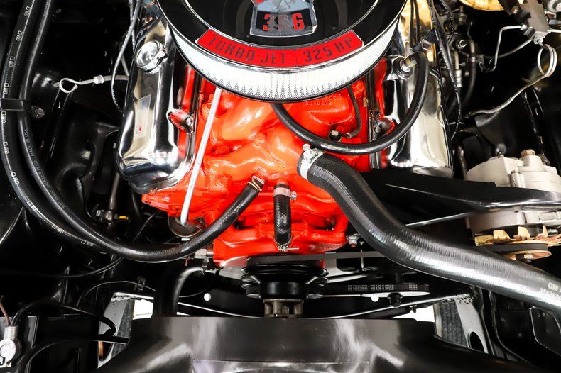 ENGINE COMPARTMENT: Correct dated and coded 396-325 hp engine. It is completely stock including the manifolds, valve covers and even reproduction spark plug wires. The hoses and clamps are reproduction. It has a Delco battery topper and spring clamp cables. Features include power steering and power brakes. It is detailed to factory new condition.