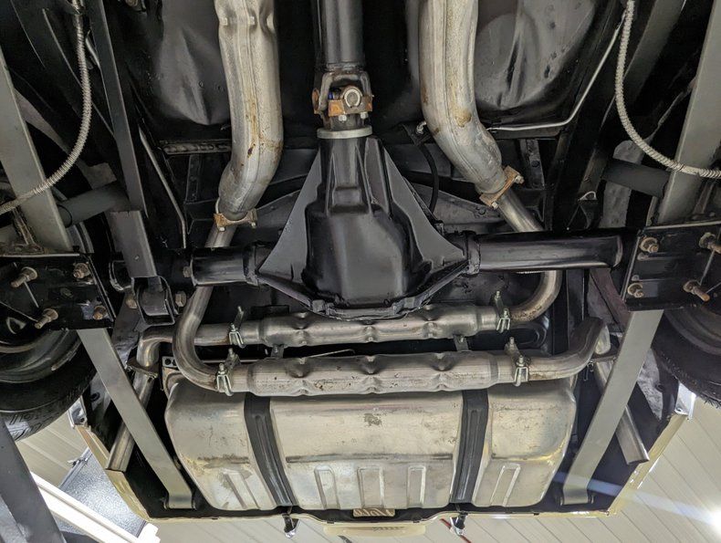 UNDERSIDE: The frame and all the components were removed from the bottom of the car. The floors are dry, clean metal all painted semi-gloss black. It all went back together with rebuilt or new components. The steering and suspension were rebuilt. It has the factory traction bar that was only used on high performance Camaros. It also has the performance chambered exhaust system. The brake system was restored, e-brake is hooked up. The fuel system was replaced. Looking up at the motor it is clean Chevy orange with a proper starter. It has a correct dated Muncie M20 4-speed trans. Rebuilt drive shaft leads to the 12 bolt rear end.