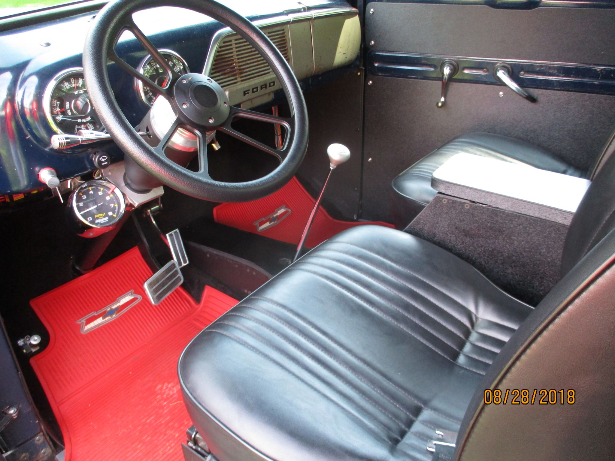 Petonia Blue w/flat clear coat, Black vinyl bucket seats w/Black carpet, Mustang front end, 350ci, 325hp rebuilt, Edelbrock carb, R700 4 speed, 4 new 15” steel wheels w/15” tires, tilt steering wheel, radio, PS, disc power brakes all 4 wheels, tach-o-meter, new dash gauges, dual exhaust, alum radiator, new tinted glass, 1 piece windshield, new wood floor in box, gas tank mounted under floor, 650 miles. George @ 507-269-9870.