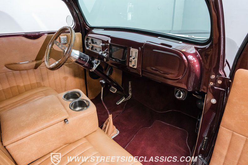 Exterior excellence flows into interior perfection. Between the looks and the upgraded technology, this truck will make you forget you're in a 1949 F-1 pickup. The tan leather seats, door panels, and headliner are in great shape. The bench seat hosts an attached center console that doubles as both an armrest and a cupholder. The carpets look immaculate, complemented by an easy-to-reach Lokar floor shifter. A custom wood-grain steering wheel sits in front of a modernized dashboard, painted Dark Cherry to match the exterior. An aftermarket gauge cluster blends seamlessly with the interior vibe. A Kenwood touchscreen with AM/FM/AUX, Bluetooth, and CarPlay/Android Auto capability pairs with Morel HiFi speakers. Vintage Air controls manage the climate system, while power windows add to everyday convenience.