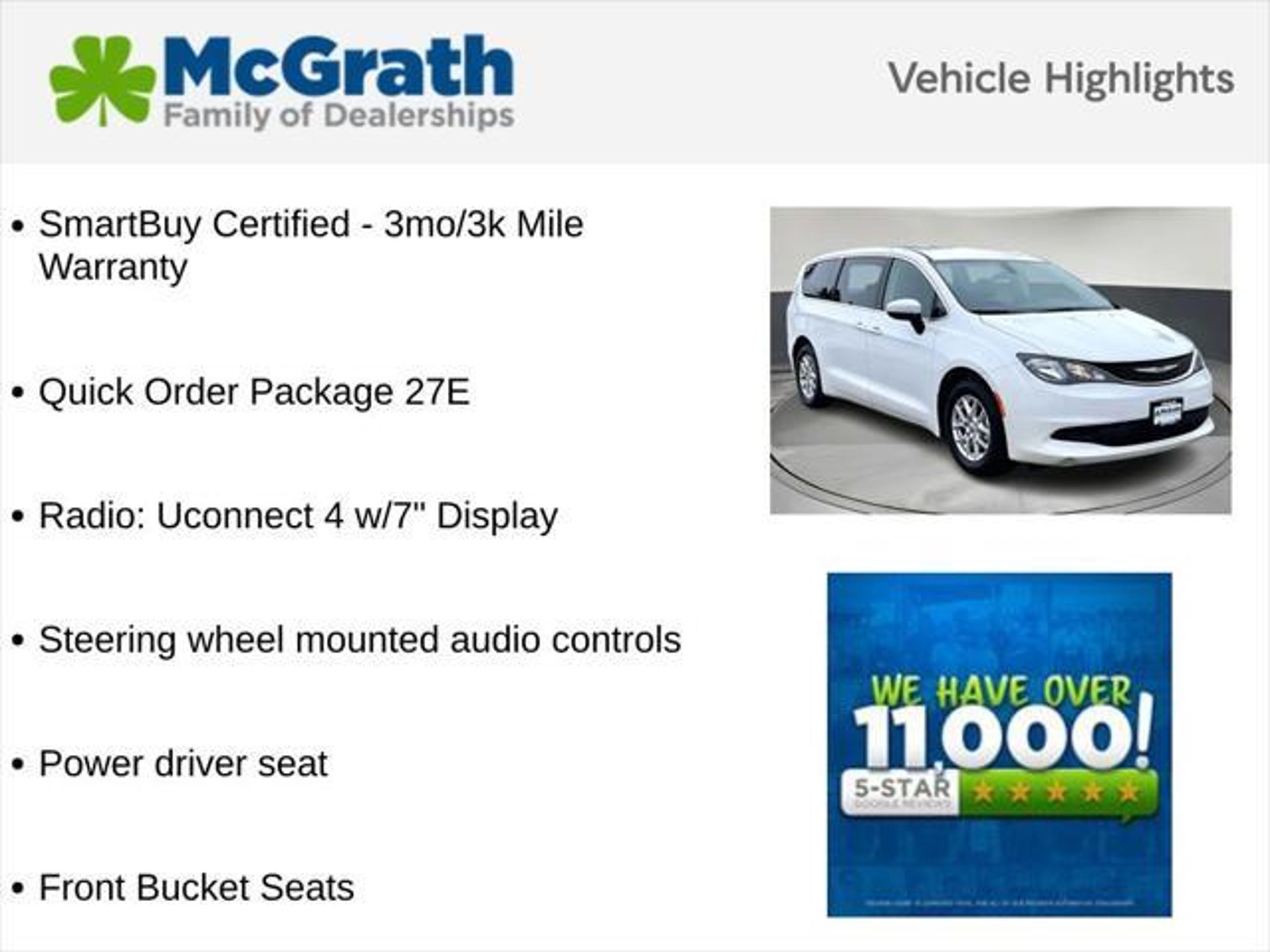 Discover the exceptional value and versatility of the 2021 Chrysler Voyager LX. This well-equipped minivan offers the perfect blend of practicality comfort and style making it the ideal choice for families and active lifestyles. SmartBuy Certified - 3mo/3k Mile Warranty 2ND ROW STOW N GO BUCKETS/3RD ROW STOW N GO 2 ADDITIONAL KEY FOBS Quick Order Package 27E Radio: Uconnect 4 w/7 Display Power driver seat Steering wheel mounted audio controls Front Bucket Seats Powered by a robust 3.6L V6 engine and equipped with a smooth-shifting 9-speed automatic transmission the Voyager delivers an impressive balance of performance and efficiency with an EPA-estimated 19 mpg in the city and 28 mpg on the highway. Its spacious interior offers seating for up to seven passengers along with ample cargo space for all your adventures. Designed with your comfort and convenience in mind the Voyager boasts a wealth of premium features including dual-zone automatic climate control a rearview camera and a user-friendly Uconnect infotainment system with Apple CarPlay and Android Auto compatibility. Safety is also a top priority with advanced driver-assistance technologies like electronic stability control traction control and a suite of airbags. Whether youre shuttling the family transporting bulky items or embarking on a road trip the 2021 Chrysler Voyager LX is the perfect companion. Its versatile and well-equipped nature combined with a SmartBuy Certified warranty makes it an exceptional value in the minivan segment. Experience the uncompromising capabilities of the 2021 Chrysler Voyager LX for yourself. Visit our showroom today and let our knowledgeable sales team guide you through a test drive. Were confident youll be impressed by this exceptional minivan and its ability to elevate your daily driving experience. Prices may change at any time and are subject to availability and prior sale. Taxes title license fees and a $180 documentation fee are not included. Payments shown are estimates; actual terms vary by buyer and credit approval. Dealer is not responsible for errors in pricing or vehicle details information is believed accurate but not guaranteed. Photos are for illustration only confirm details with the dealer. Fuel economy ratings and driving range figures are based on EPA estimates for new vehicles and actual mileage and range may vary. By submitting your phone number you consent to occasional SMS or calls about our products and promotions; standard messaging rates apply. See dealer for details.