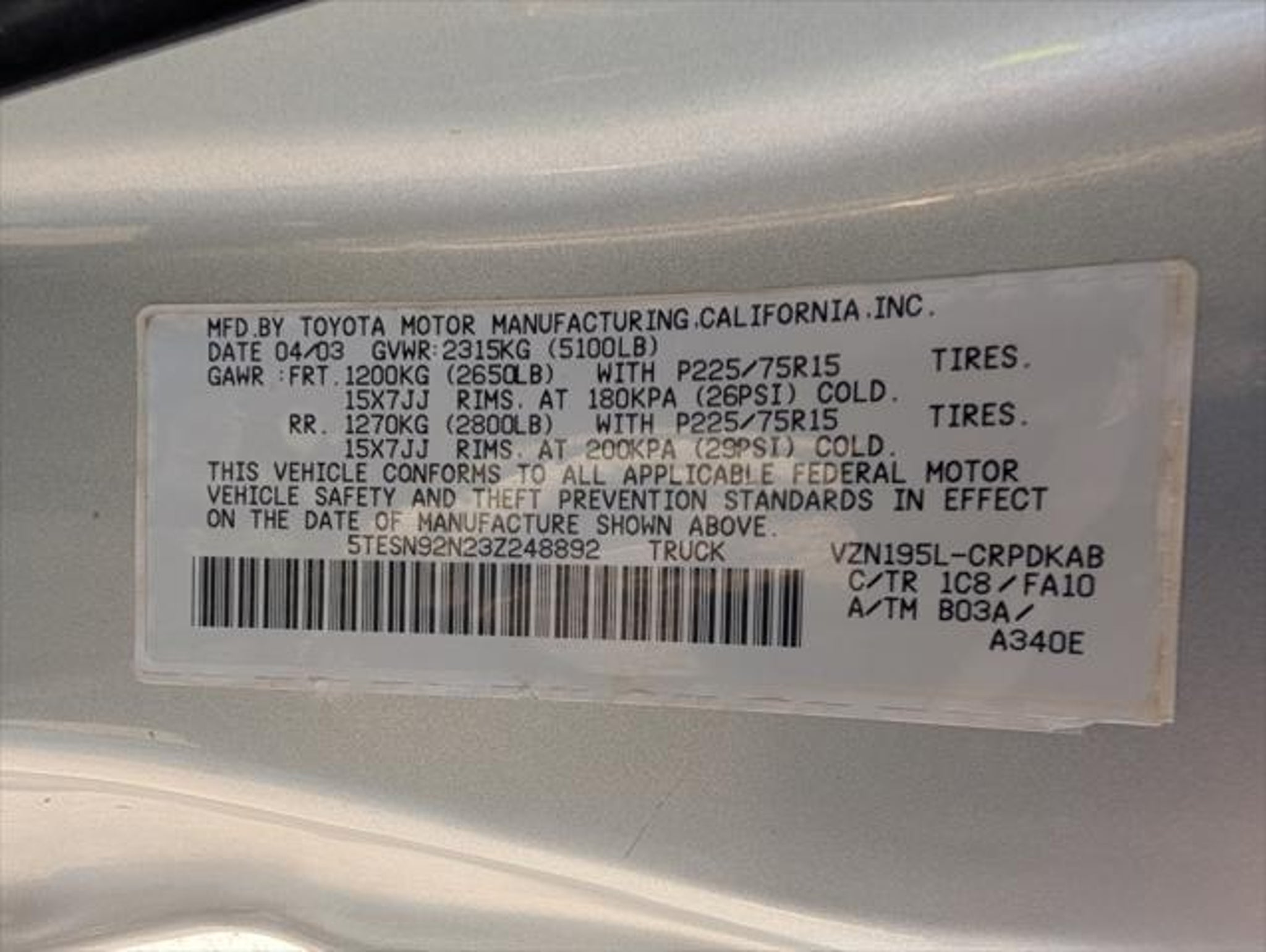 2003 Toyota Tacoma 2dr Xtracab PreRunner V6 Rwd SB