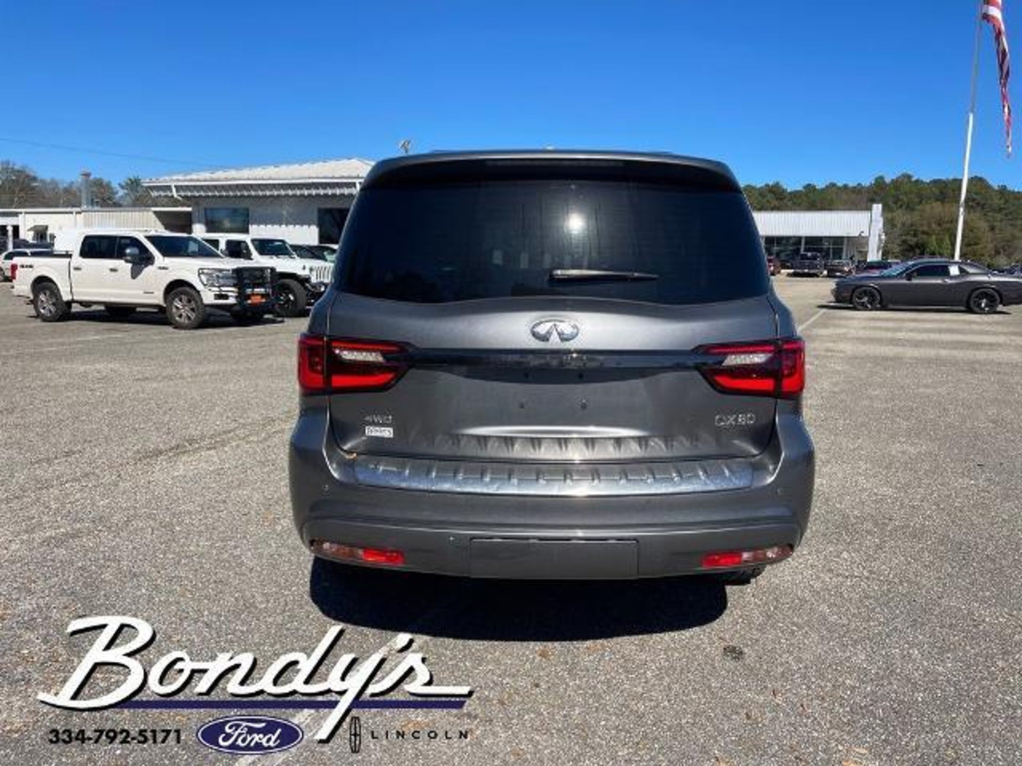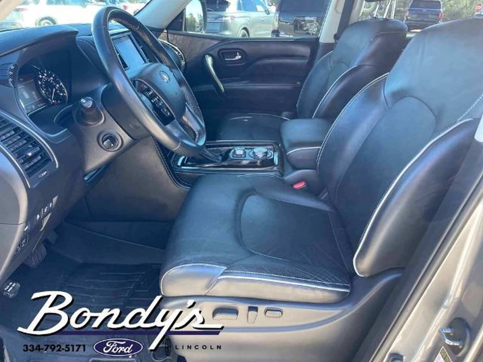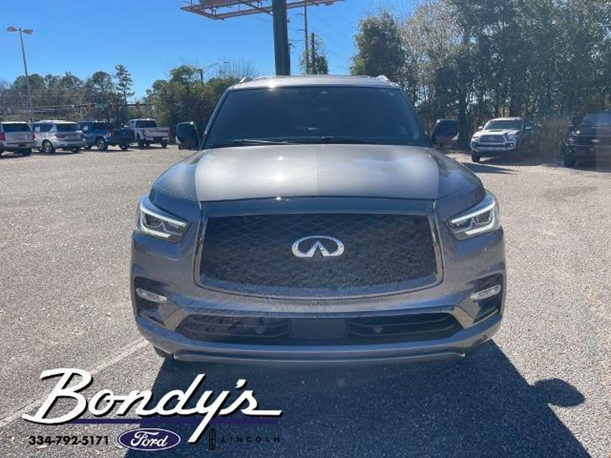 Clean CARFAX. 2021 INFINITI QX80 Premium Select 13 Speakers, 2.937 Axle Ratio, 3rd row seats: split-bench, 4-Wheel Disc Brakes, ABS brakes, Air Conditioning, Alloy wheels, AM/FM radio: SiriusXM, Anti-whiplash front head restraints, Apple CarPlay/Android Auto, Auto High-beam Headlights, Auto tilt-away steering wheel, Auto-dimming door mirrors, Auto-dimming Rear-View mirror, Auto-leveling suspension, Automatic temperature control, Brake assist, Bumpers: body-color, Cargo Package, CD player, Compass, Delay-off headlights, Driver door bin, Driver vanity mirror, Dual front impact airbags, Dual front side impact airbags, DVD-Audio, Electronic Stability Control, Emergency communication system: INFINITI Connection, First-Aid Kit, Four wheel independent suspension, Front anti-roll bar, Front Bucket Seats, Front Center Armrest, Front dual zone A/C, Front fog lights, Front reading lights, Fully automatic headlights, Garage door transmitter: HomeLink, Heated door mirrors, Heated Front Bucket Seats, Heated front seats, Heated steering wheel, High-Density Non-Slip Rear Cargo Carpet, Illuminated entry, Leather Shift Knob, Leather steering wheel, Leather-Appointed Seats, Literature Kit, Low tire pressure warning, Memory seat, Navigation system: INFINITI InTouch Navigation, Nylon-Cord Cargo Net, Occupant sensing airbag, Outside temperature display, Overhead airbag, Overhead console, Panic alarm, Passenger door bin, Passenger vanity mirror, Power door mirrors, Power driver seat, Power Liftgate, Power moonroof, Power passenger seat, Power steering, Power windows, Radiant Illuminated Kick Plates, Radio data system, Radio: Bose Audio System w/13 Speakers, Rain sensing wipers, Rear air conditioning, Rear anti-roll bar, Rear audio controls, Rear reading lights, Rear seat center armrest, Rear window defroster, Rear window wiper, Reclining 3rd row seat, Remote keyless entry, Roof Rail Cross Bars, Security system, Speed control, Speed-sensing steering, Split folding rear seat, Spoiler, Steering wheel memory, Steering wheel mounted audio controls, Tachometer, Telescoping steering wheel, Tilt steering wheel, Traction control, Trip computer, Turn signal indicator mirrors, Variably intermittent wipers, Voltmeter, Wheels: 22 x 8.0 Dark Forged Aluminum-Alloy. Graphite Shadow 4WD 5.6L V8 7-Speed Automatic THIS VEHICLE IS LOCATED AT BONDY'S FORD LINCOLN AT 3615 ROSS CLARK CIRCLE DOTHAN, AL 36303. PLEASE CALL US AT 800-239-5171 TO ASK US ANY QUESTIONS! MON-FRI SALES IS HERE FROM 8:30 TO 7:00 AND SAT 8:30 TO 6:00. WE ARE CLOSED ON SUNDA