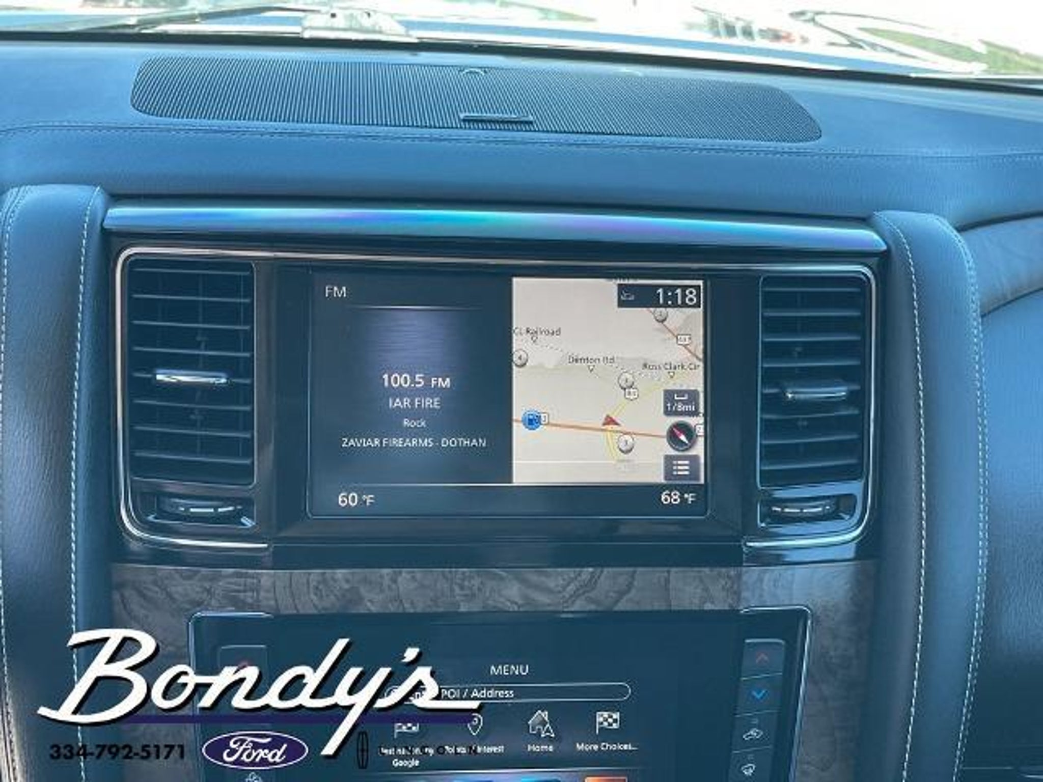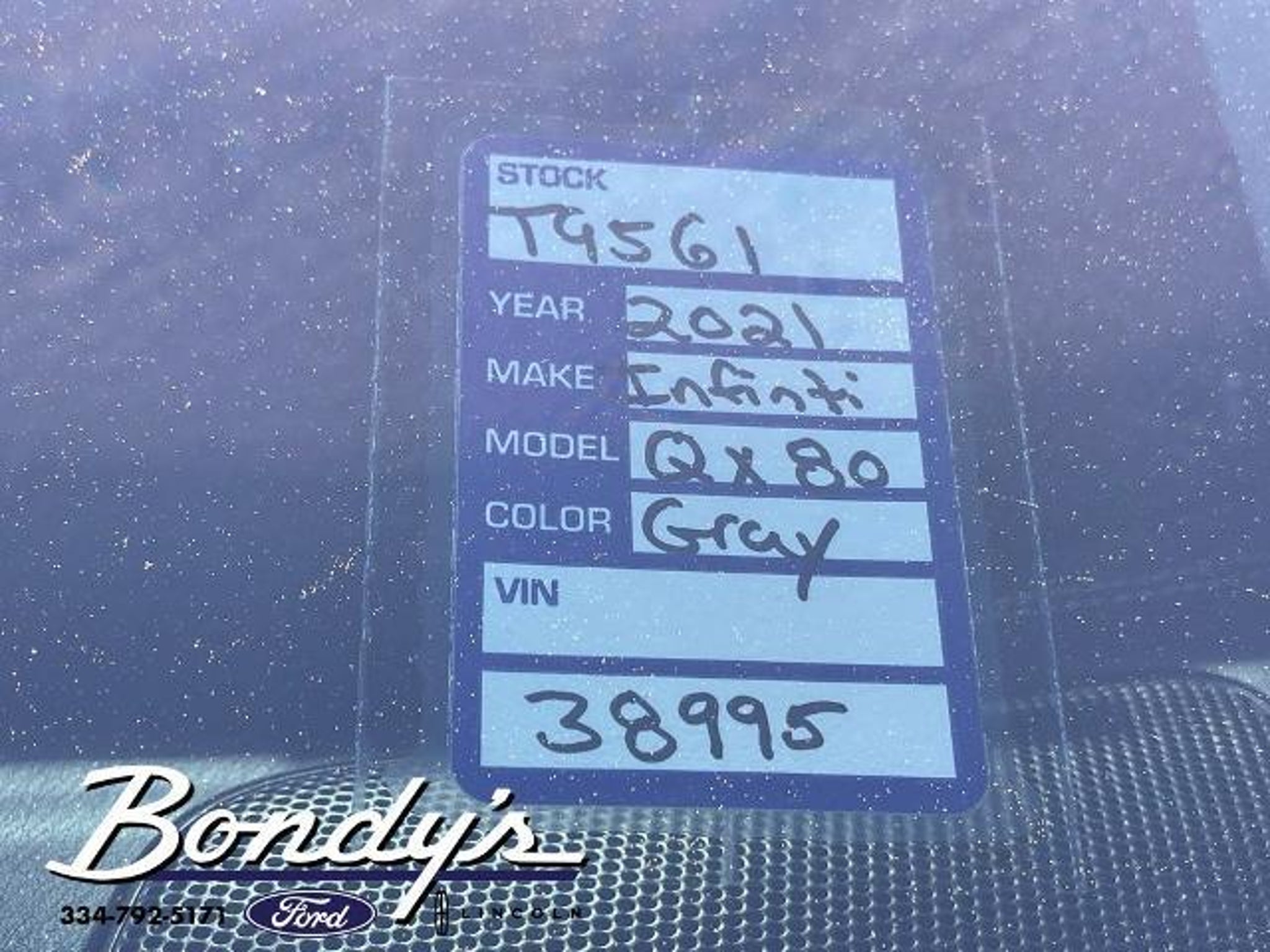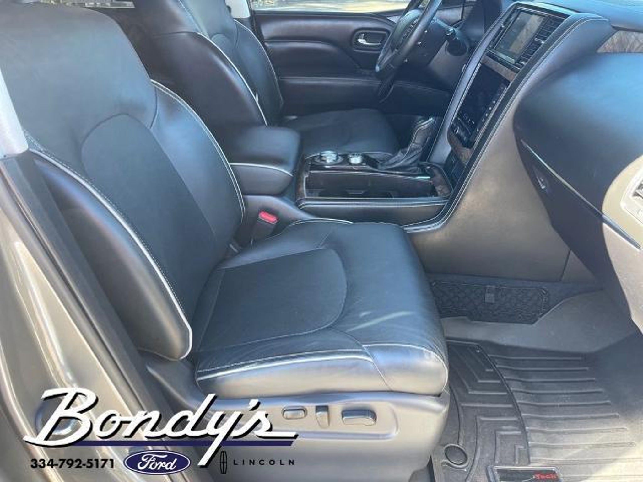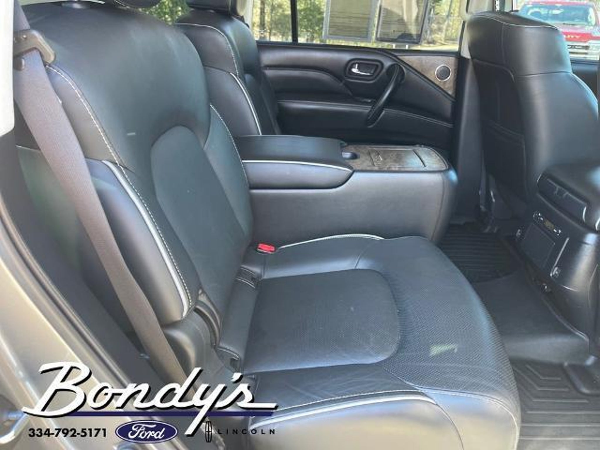 Clean CARFAX. 2021 INFINITI QX80 Premium Select 13 Speakers, 2.937 Axle Ratio, 3rd row seats: split-bench, 4-Wheel Disc Brakes, ABS brakes, Air Conditioning, Alloy wheels, AM/FM radio: SiriusXM, Anti-whiplash front head restraints, Apple CarPlay/Android Auto, Auto High-beam Headlights, Auto tilt-away steering wheel, Auto-dimming door mirrors, Auto-dimming Rear-View mirror, Auto-leveling suspension, Automatic temperature control, Brake assist, Bumpers: body-color, Cargo Package, CD player, Compass, Delay-off headlights, Driver door bin, Driver vanity mirror, Dual front impact airbags, Dual front side impact airbags, DVD-Audio, Electronic Stability Control, Emergency communication system: INFINITI Connection, First-Aid Kit, Four wheel independent suspension, Front anti-roll bar, Front Bucket Seats, Front Center Armrest, Front dual zone A/C, Front fog lights, Front reading lights, Fully automatic headlights, Garage door transmitter: HomeLink, Heated door mirrors, Heated Front Bucket Seats, Heated front seats, Heated steering wheel, High-Density Non-Slip Rear Cargo Carpet, Illuminated entry, Leather Shift Knob, Leather steering wheel, Leather-Appointed Seats, Literature Kit, Low tire pressure warning, Memory seat, Navigation system: INFINITI InTouch Navigation, Nylon-Cord Cargo Net, Occupant sensing airbag, Outside temperature display, Overhead airbag, Overhead console, Panic alarm, Passenger door bin, Passenger vanity mirror, Power door mirrors, Power driver seat, Power Liftgate, Power moonroof, Power passenger seat, Power steering, Power windows, Radiant Illuminated Kick Plates, Radio data system, Radio: Bose Audio System w/13 Speakers, Rain sensing wipers, Rear air conditioning, Rear anti-roll bar, Rear audio controls, Rear reading lights, Rear seat center armrest, Rear window defroster, Rear window wiper, Reclining 3rd row seat, Remote keyless entry, Roof Rail Cross Bars, Security system, Speed control, Speed-sensing steering, Split folding rear seat, Spoiler, Steering wheel memory, Steering wheel mounted audio controls, Tachometer, Telescoping steering wheel, Tilt steering wheel, Traction control, Trip computer, Turn signal indicator mirrors, Variably intermittent wipers, Voltmeter, Wheels: 22 x 8.0 Dark Forged Aluminum-Alloy. Graphite Shadow 4WD 5.6L V8 7-Speed Automatic THIS VEHICLE IS LOCATED AT BONDY'S FORD LINCOLN AT 3615 ROSS CLARK CIRCLE DOTHAN, AL 36303. PLEASE CALL US AT 800-239-5171 TO ASK US ANY QUESTIONS! MON-FRI SALES IS HERE FROM 8:30 TO 7:00 AND SAT 8:30 TO 6:00. WE ARE CLOSED ON SUNDA
