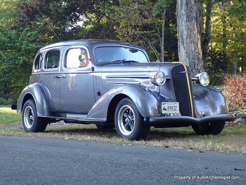 ![]() Click on the image for a larger picture. 1936 CHEVROLET MASTER DELUXE HOT ROD 1936 Chevy Sedan Master Deluxe, Hot Rod. This car was built in the Terrytown, NY plant and sold new in RI and after several years in private hands, it was sold to the Exeter, RI Fire Department for their Chief's car. It is believed that the car was originally Cabana Cream and then painted red for obvious reasons. It was sold back into the private sector in the 70's to the third owner, who painted the car yellow again and then the car sat... Until 2006 when the current owner purchased the car to restore. He and his dad tore into it immediately and went through the entire car. They purchased new steel where necessary and went through the car front to rear. The running boards are a bit custom and are all metal. They also bought a 92 Buick Roadmaster for the drive-line and rear suspension. The seats are from a 2000 Saab and are leather and in rather good condition. The rear seat flips up for storage underneath it and so items in the trunk can come forward into the passenger compartment if needed. The front suspension is a Hiedt's Mustang II set up. The engine from the Roadmaster was originally used but after a trip down to Key West, and turning over 100K on that engine, they went with a Chevy 350/330 TBI crate engine, now running a Fast Fuel Injection set up. The car, as it sits, has roughly 35,000 miles on the body/running gear and less than 10K on the engine. It puts that power out through a 7004R auto trans held in place in a custom mount along with a drive shaft hoop. She runs true dual exhaust all the way back. (just as we started the photo-shoot, the driver exhaust pipe dropped off it's hanger, it will be welded back in place before the sale) The brakes are power and Disc F/Drums R, that is all that is power on the car. Steering is manual, windows, etc. There is heat but no AC. Everything works as it should. She starts right up and runs and drives strong. There is no rust on her although there are a couple of small areas in the paint where the 15 year old restoration is showing through. Despite being built to drive and totally enjoy, she still looks awesome and can hold her own at local shows and cruise nights. The paint is Dark Quartz Grey Metallic with just a touch of pearl purple in the clear coat. The ghost flames are a lighter version of the same color. There are a couple small details that someone might want to tackle such as the carpets. They are in good shape but not the quality he originally wanted to use. It could use a deep cleaning inside, but still presents very well. Overall, totally ready to get in and enjoy.. it doesn't NEED anything to be able to do that. All the receipts and the full photo album of the restoration is included along with the bill of sale when the FD bought the car. Turn key and ready to be driven from Canada to FL and all points in between. (It already has been too). Asking price on this wonderful cruising sedan is $29,500. Any questions, for many more photos and video, to schedule a time to see her in person, or to make an offer, please don't hesitate to contact me. Thanks for the interest.