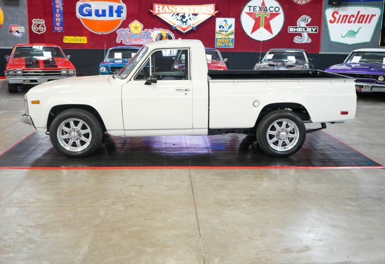 This 1977 Mazda Rotary Pickup is a rare and exciting compact truck powered by a 1.3L 13B twin rotor Wankel engine paired to a 5-speed manual transmission with a 3.91 rear gear ratio. It features power brakes, front disc brakes, and rear drum brakes, making it both responsive and fun to drive. The white exterior paint is paired with a striking black vinyl interior with white houndstooth inserts. Upgrades include a QFT 4-barrel carburetor, electric fuel pump, and 16" MB Motoring wheels wrapped in Hankook Ventus V2 Concept 2 tires. A unique blend of vintage style and rotary performance.