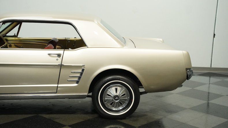 This 1966 Ford Mustang coupe rocks a unique Champagne exterior with white accents, standing out from the typical pony car crowd. The sleek body lines showcase the iconic Mustang silhouette, enhanced by 14-inch wheels wrapped in 195/75R14 tires. A dual exhaust system adds a muscular touch. The exterior upgrades include fresh paint on the firewall and fenders, giving this classic a crisp, clean appearance.