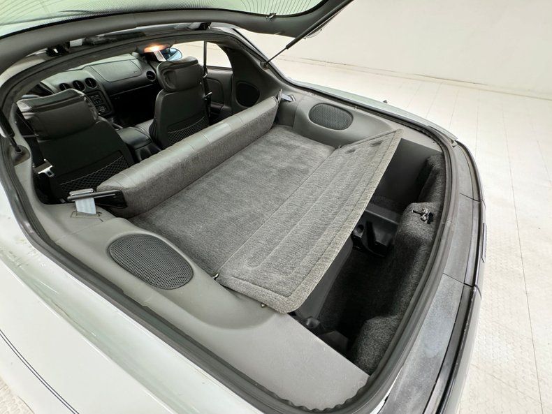 Standard and clean molded plastic and vinyl panels make up the inner doors which house a variety of gray plastic switches. Black leather sport seats are contoured to provide side support to occupants and along with the 2+2 leather seats in back, present in very good condition. The grippy steering wheel leads to a simple gauge cluster on the dash with the tachometer overlapping the speedometer and system readouts just below that. In the center, three vents are above the factory AM/FM/CD radio with EQ and underneath is the simple climate control panel. Black molded plastic tops the center hump and surrounds the T-shifter and indicator panel in front of a cupholder and storage bin. Like the rest of the interior, low pile gray carpet is in good condition and the bottom side of the headliner is also intact, while tinted T-tops allow in some light.