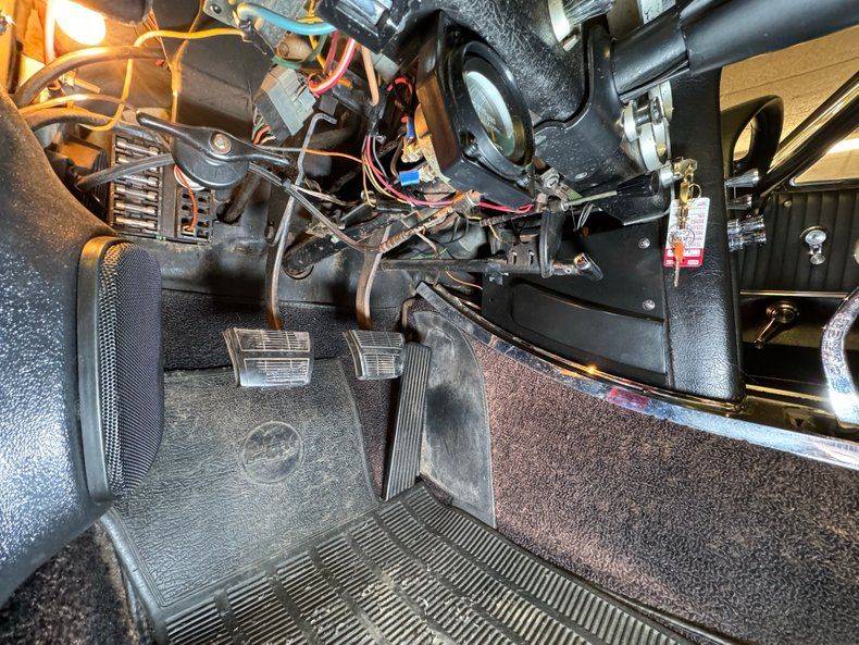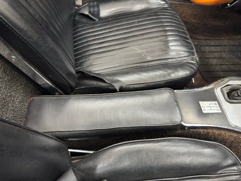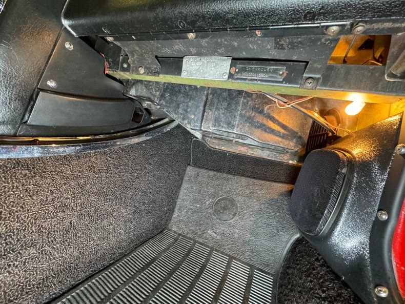 Hockey stick trim separates the grain material from a pleated pattern to one that is smooth, and the 80/20 configuration includes a carpeted bottom. There's a bit of wear and patina on the driver's side, especially where cracks in the armrest are evident. Step over the aluminum plate on the sill to find low back black leather bucket seats with the driver's seat showing some compression, but no wear marks or tears. The passenger seat looks good and could benefit from a deep detailing to clean and condition the leather. A honey colored wood steering wheel fronts the eyebrow shaped dash with six symmetrically placed gauges and an extra temp gauge mounted below the dashboard. The center stack, which is formed by the inside curves of the eyebrow sides contains a clock, vent knobs, and a vertically mounted AM/FM/Cassette radio with knobs. The passenger's eyebrow is an arching glove box with the distinctive Corvette Sting Ray insignia. A white knobbed Hurst shifter rises from the plastic base of the center console, all surrounded by black loop carpet which continues in the back cargo area in fair condition.