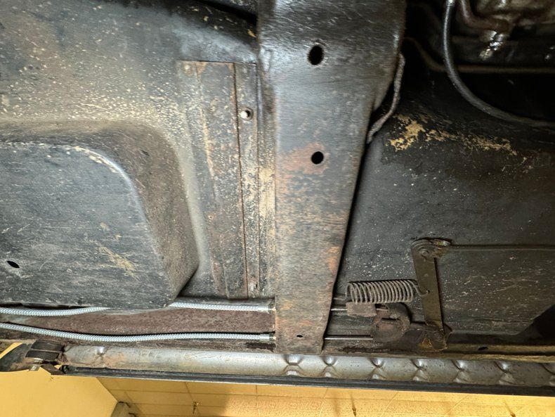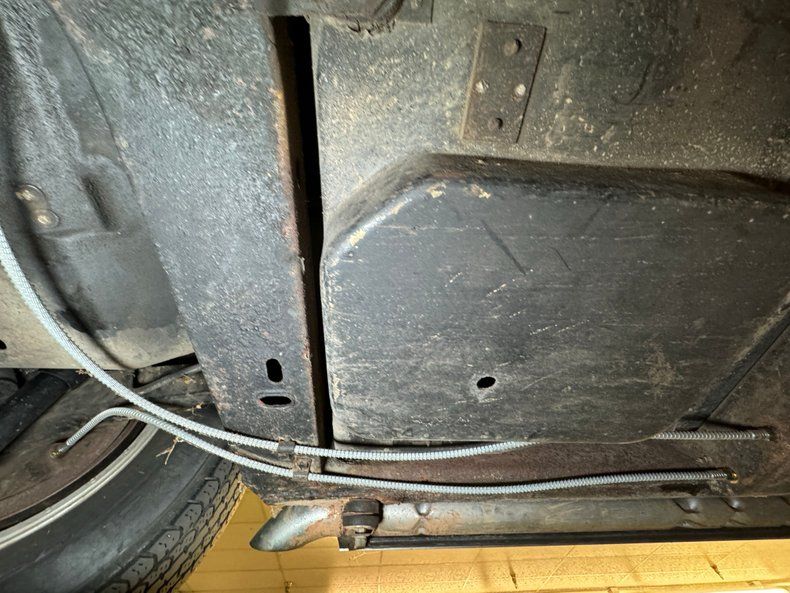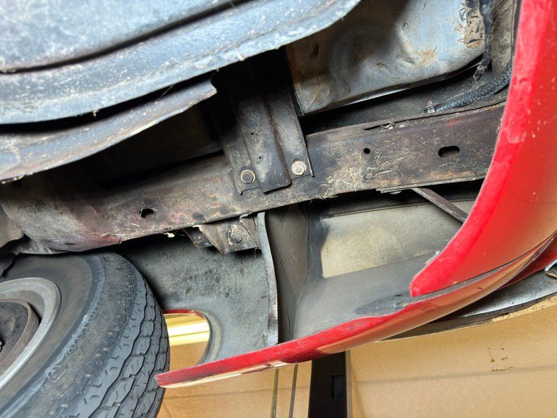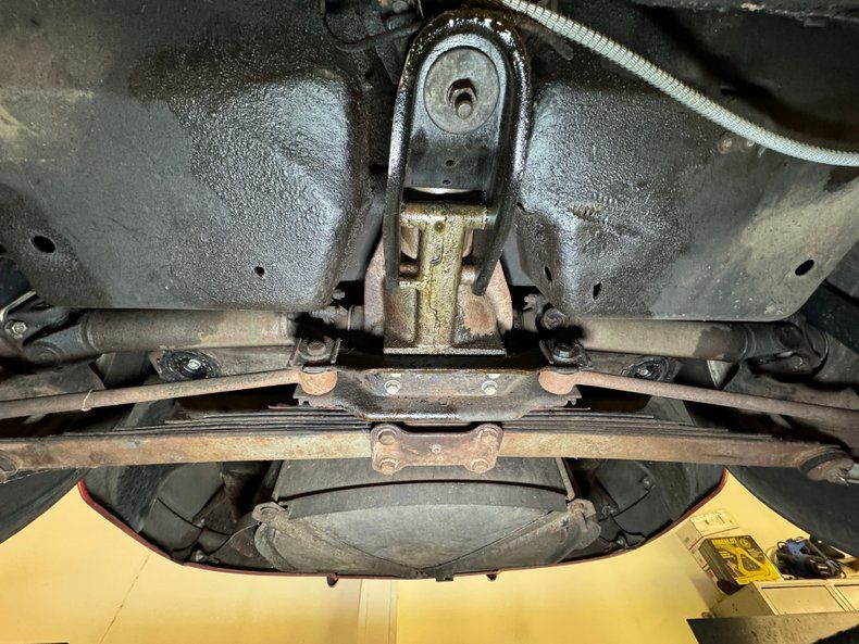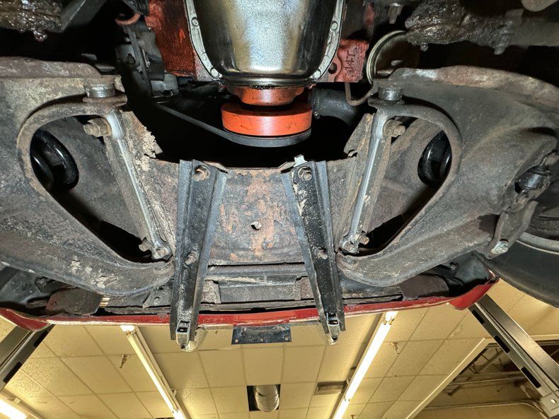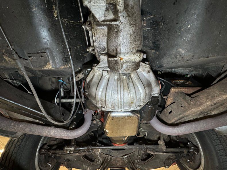 Surface rust, oil on the pan, some road dirt, and grease on the steering knuckles, all signs of a driver quality underside and proof this car has been enjoyed. The dual exhaust head immediately sideways into the side pipes and suspension consists of coil springs up front and transverse leaf springs with tubular axle driveshafts in the back, making both sides independent.