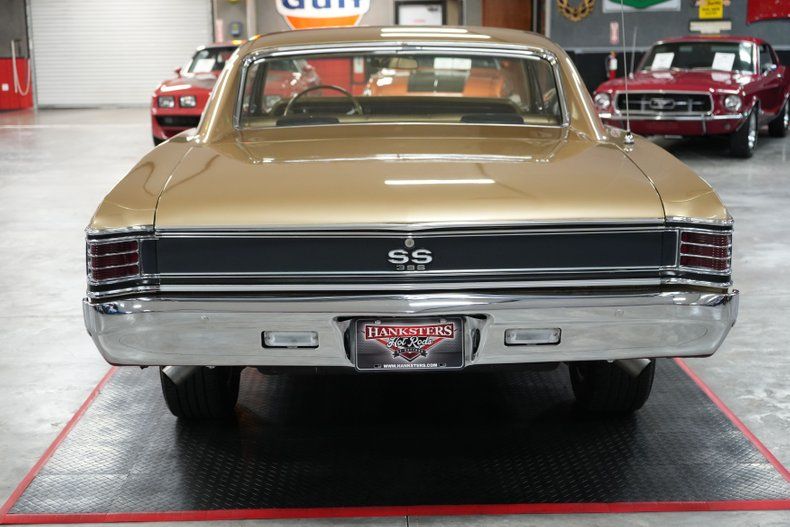 This 1967 Chevrolet Chevelle SS is powered by a 396 Big Block Chevy V8 engine, paired with a 4-speed manual transmission. It features a GM 12 bolt POSI rear end with a 3.43 rear gear ratio, ensuring robust performance. The car is equipped with power brakes and 4-wheel drum brakes. The interior boasts a stylish gold vinyl finish. It rides on 16"" GM Rally wheels with 225-60-16 Goodyear Assurance tires. Performance enhancements include a mechanical fuel pump, flex cooling fan, MSD ignition, MSD Blaster coil, HEI distributor, Edelbrock 4 barrel carburetor, Weiand aluminum intake, and an OEM steel radiator. The striking gold exterior paint completes this classic muscle car. Hanksters Hot Rods of Daytona offers shipping and warranty at full retail price.